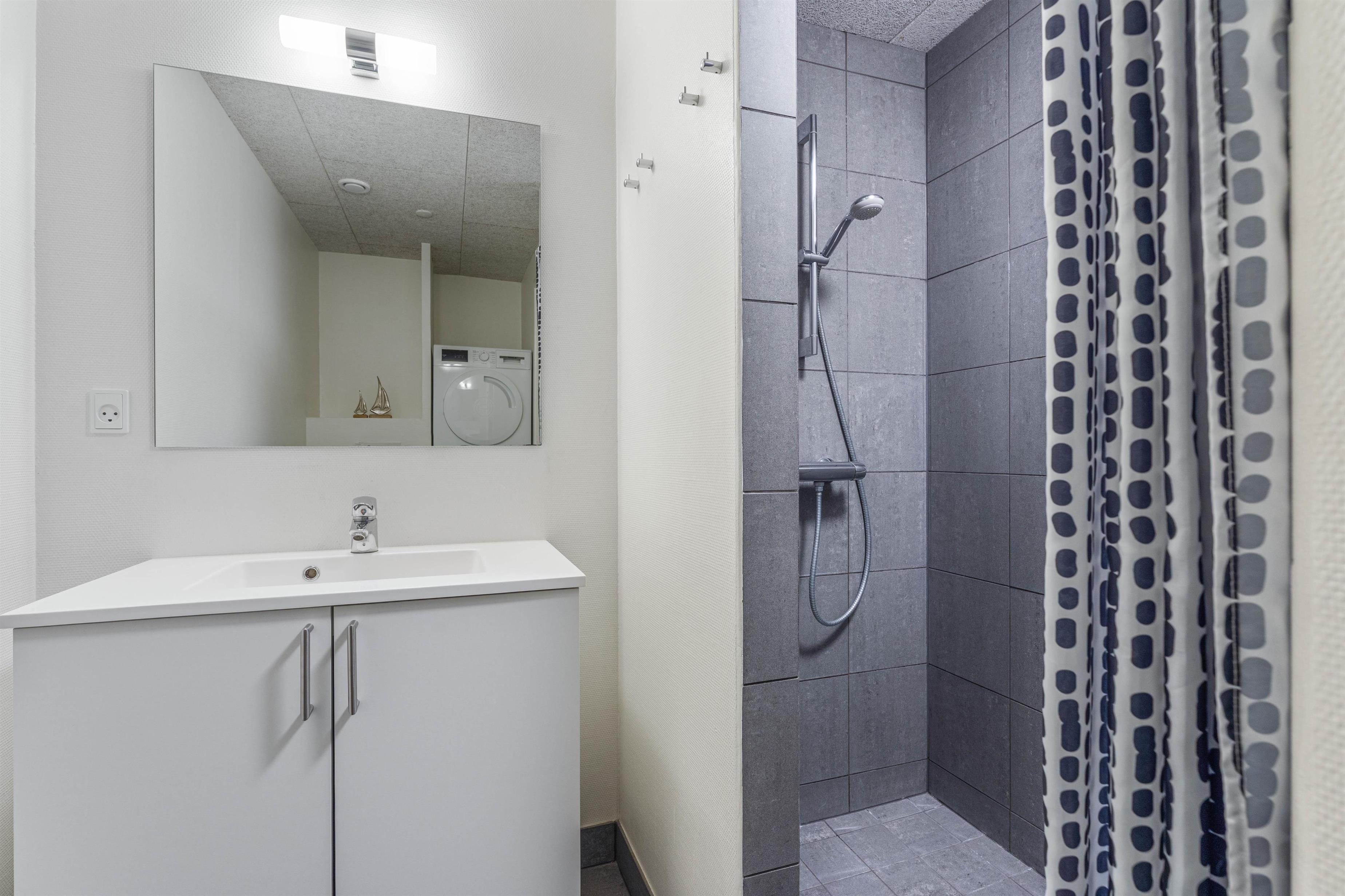 I badeværelset er der både vaskemaskine og tørretumbler, hvis der er brug for at vaske efter en dejlig dag på stranden. Der er behagelig gulvvarme og interiøret er lyst og lækkert.
