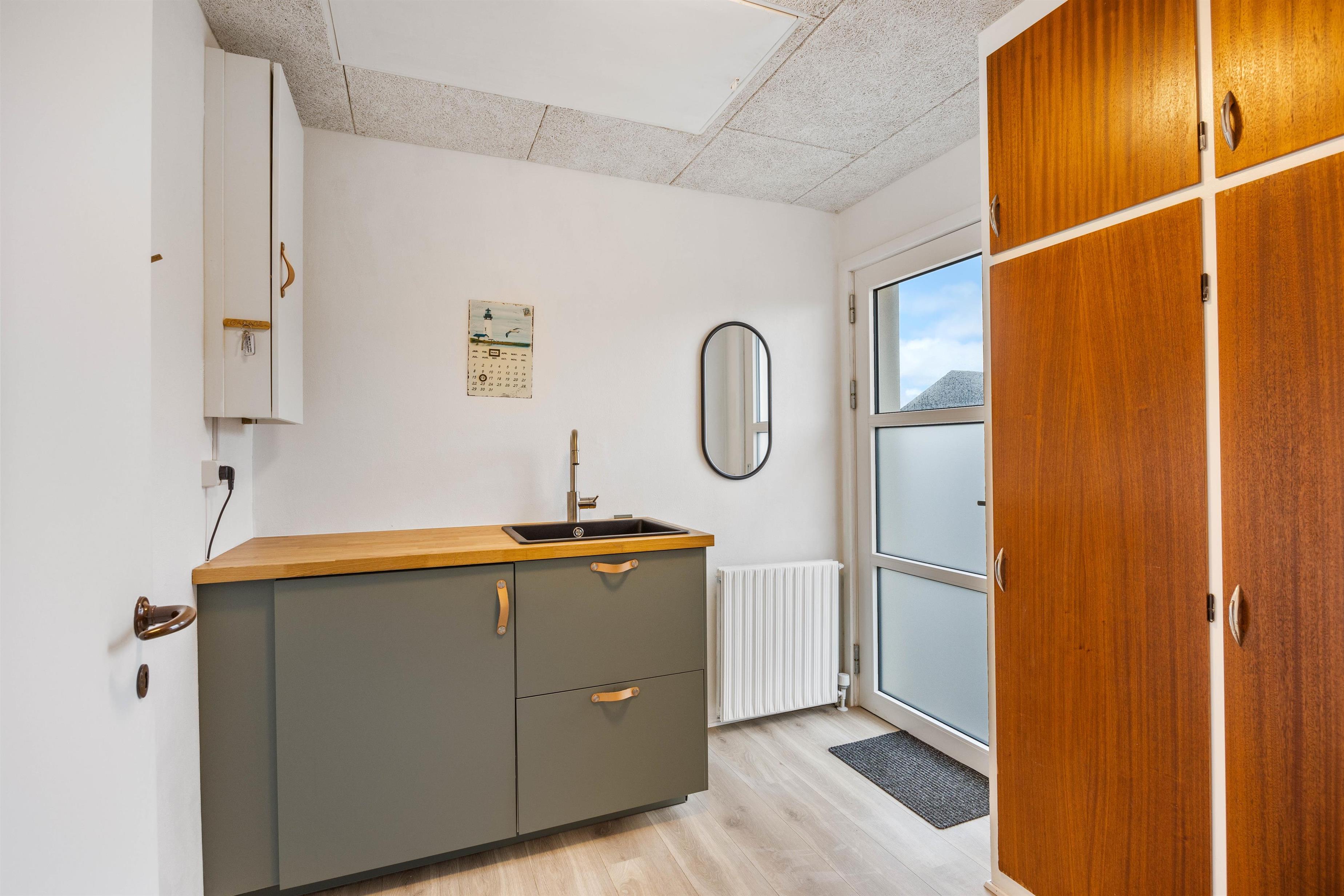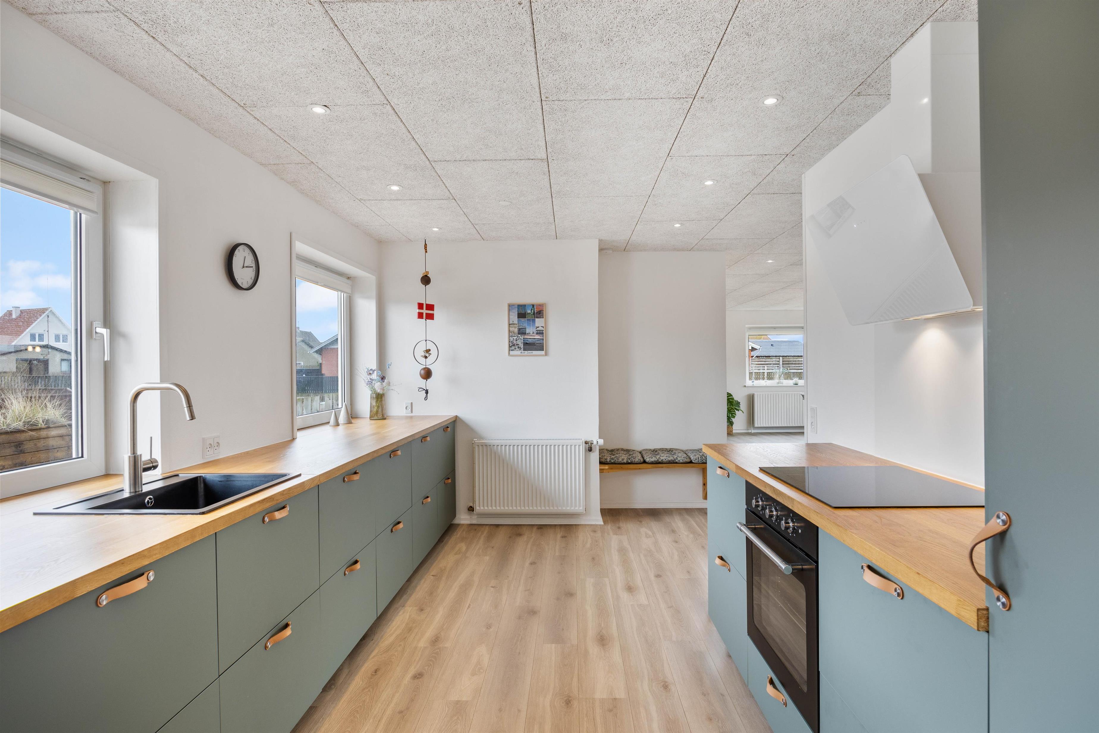 Det første, I træder ind i, når I kommer til sommerhuset, er et godt bryggers med god plads til fodtøj og overtøj. Herfra er der indgang til et stort og åbent køkken, hvor blandt andet opvaskemaskine, mikroovn og induktionskomfur står til jeres rådighed - alt, feriens kok har brug for. Dagens måltider tilberedes derfor uden problemer, hvis I ikke vælger at spise på et af byens lækre spisesteder, der ligger i gåafstand fra huset.
