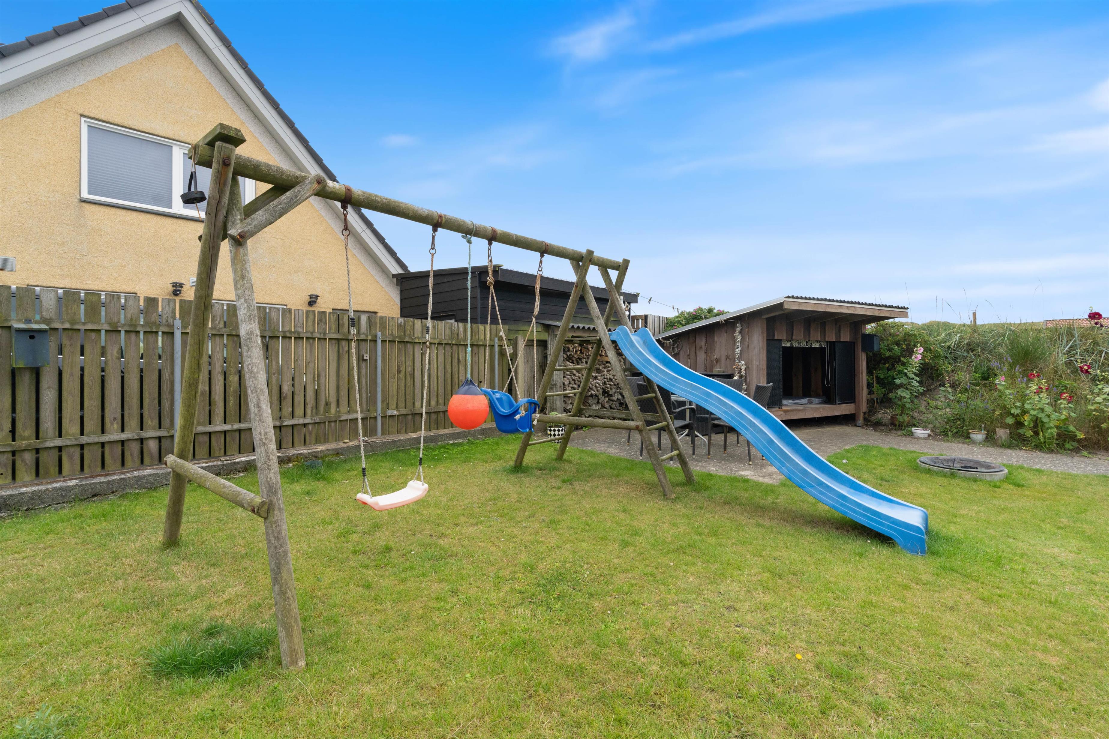Den store, indrammede have er en drøm, og her kan I dagen lang nyde det gode vejr uden at blive forstyrret. På græsplænen kan både børn og hund få lov til at tumle, og både i sandkassen og på gyngestativet med rutsjebane kan børnene få masser af tid til at gå, mens I drikker en friskbrygget kop kaffe ved havebordet. På en varm sommerdag kan I tage et forfriskende skyl under udebruseren, som er tilgængelig fra april til november.
