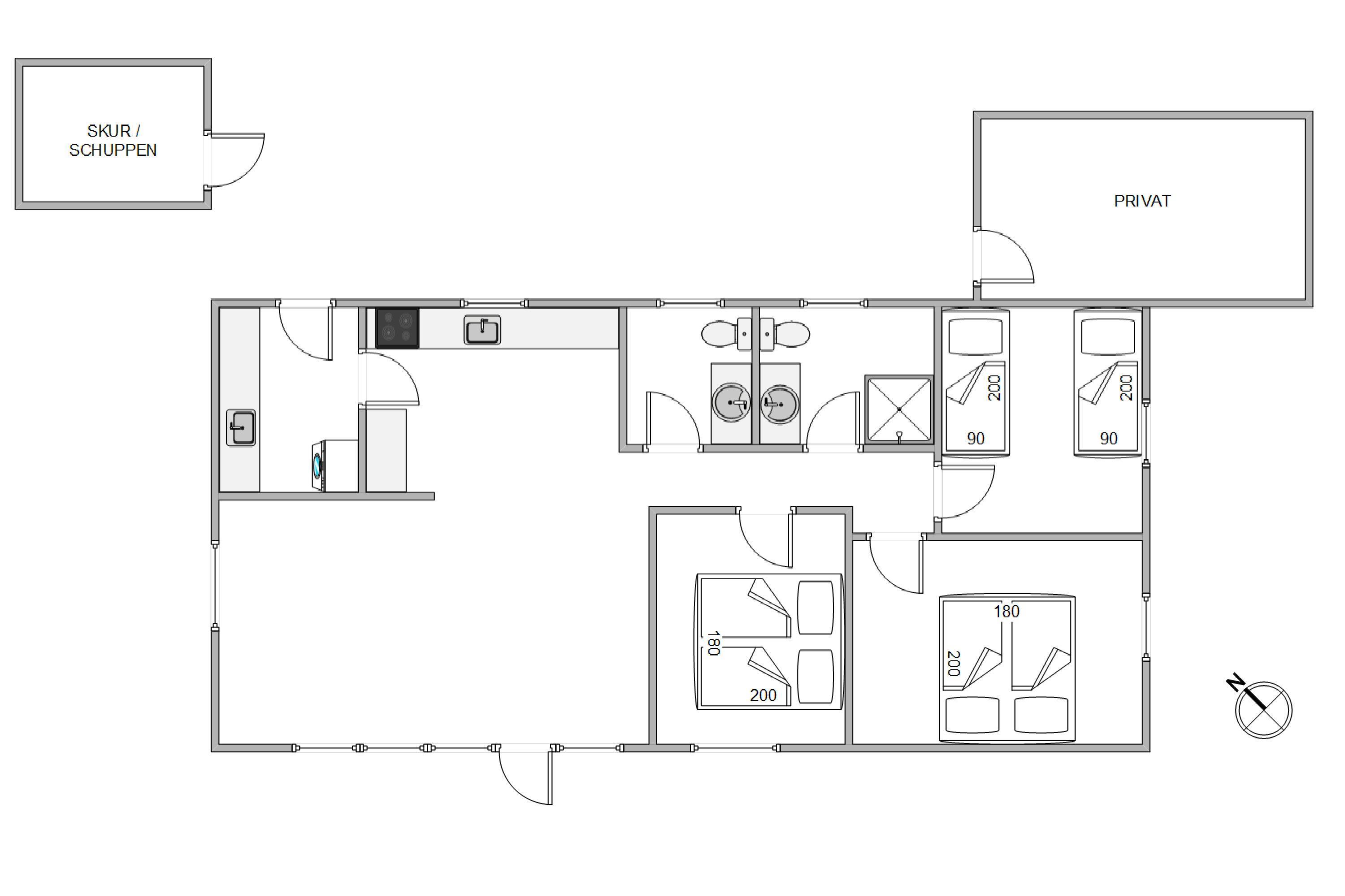 Feriehusets 6 sovepladser fordeler sig på 3 soveværelser, hvor I kan få en god nats søvn. Derudover finder I et badeværelse samt et gæstetoilet begge med gulvvarme i feriehuset. Desuden er feriehuset udstyret med en vaskemaskine, så I nemt kan klare praktiske gøremål under ferien.