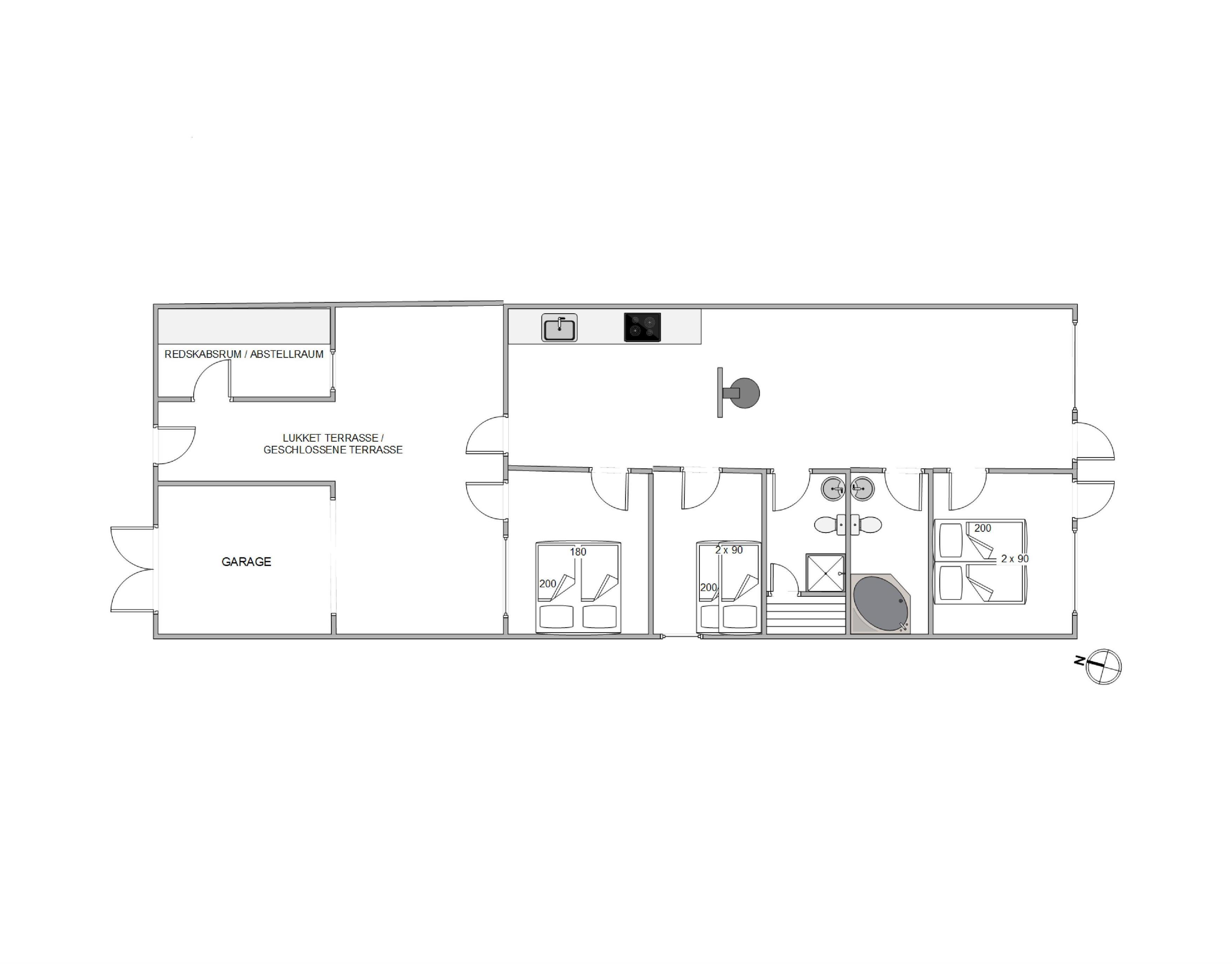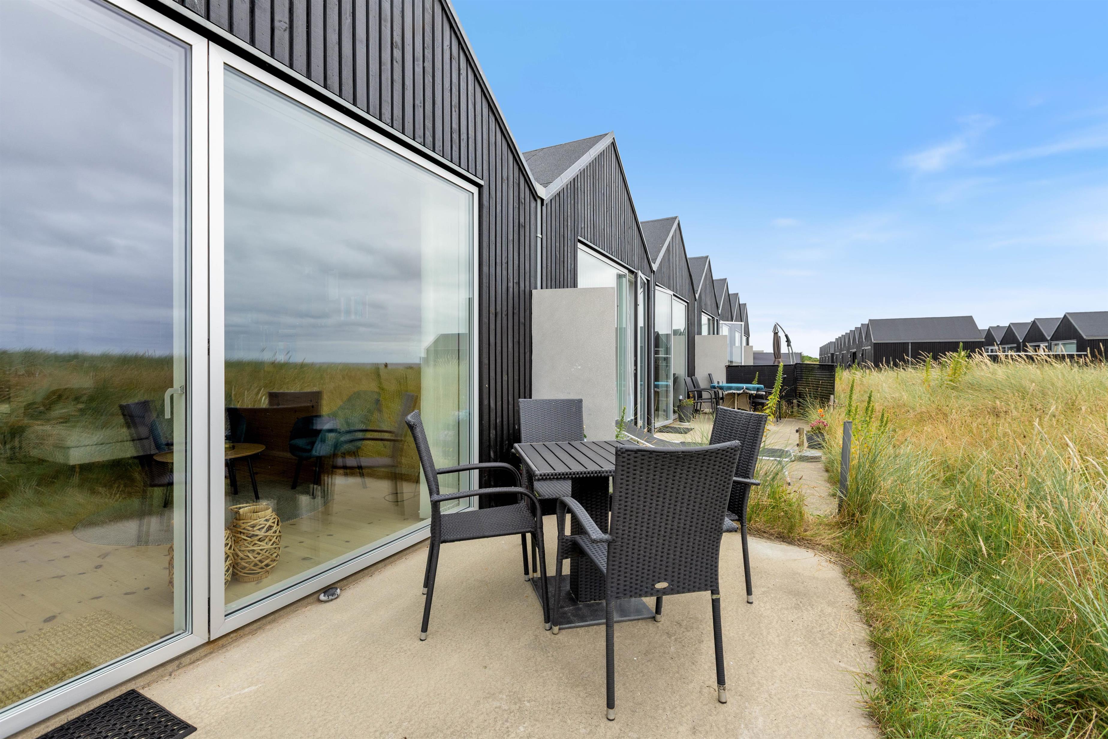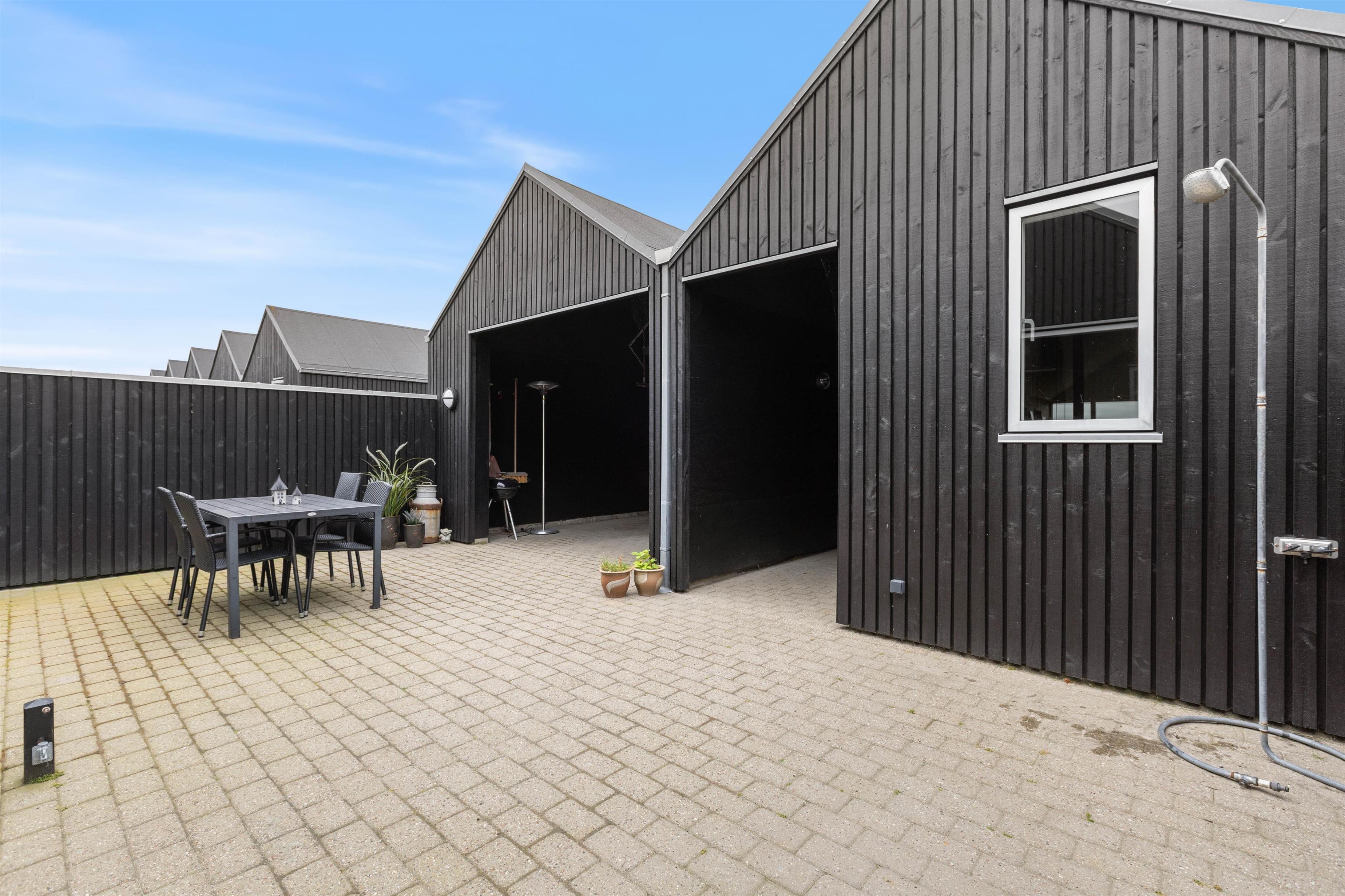 På den anden side af feriehuset mellem sommerhusets tilhørende garage og redskabsrum, har I en dejlig lukket terrasse, hvor du kan nyde de hyggelige grillaftener. Her kan du sidde i fred og ro med familien og hunden løbe frit rundt og bare nyde ferien. Udenfor finder I også en udebruser, som kan benyttes fra april til november.
