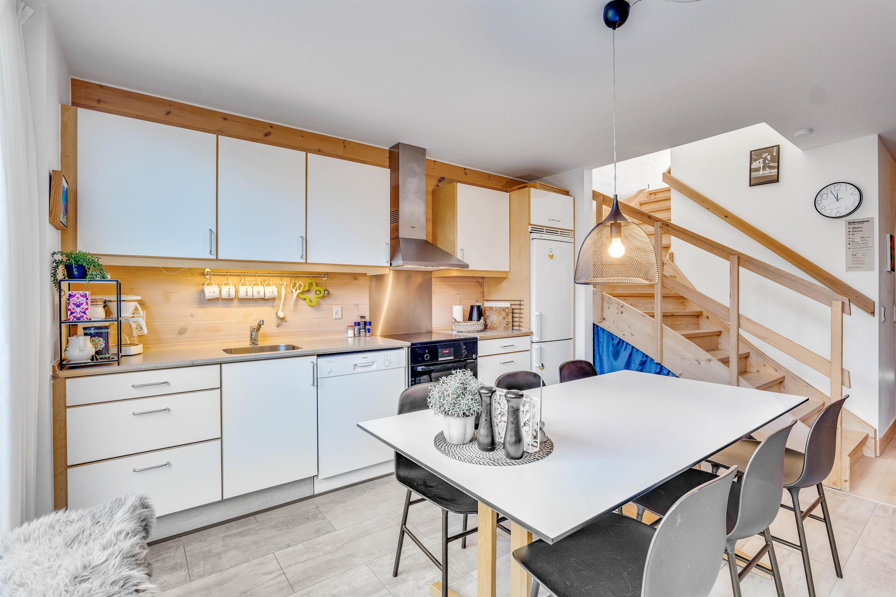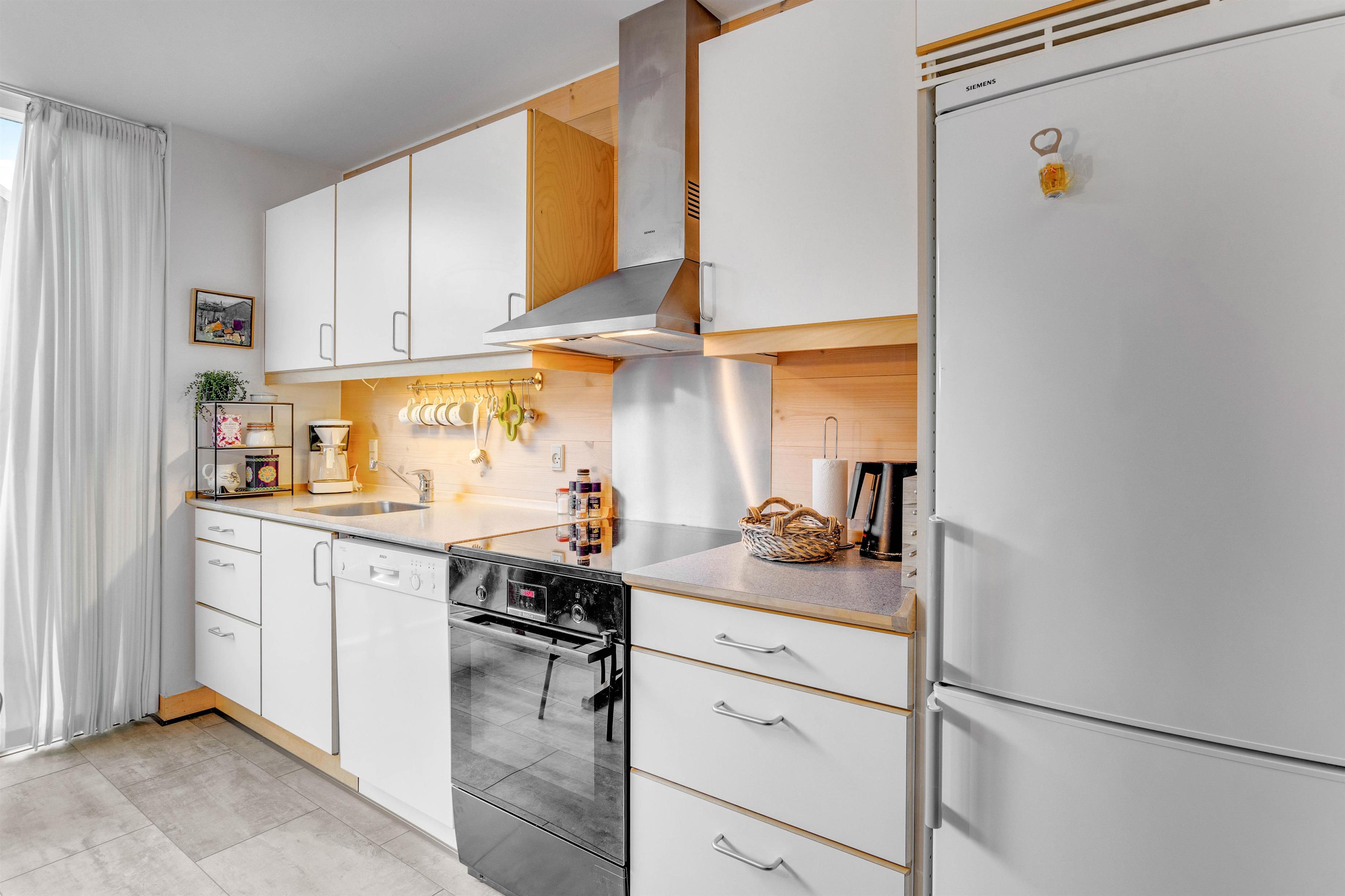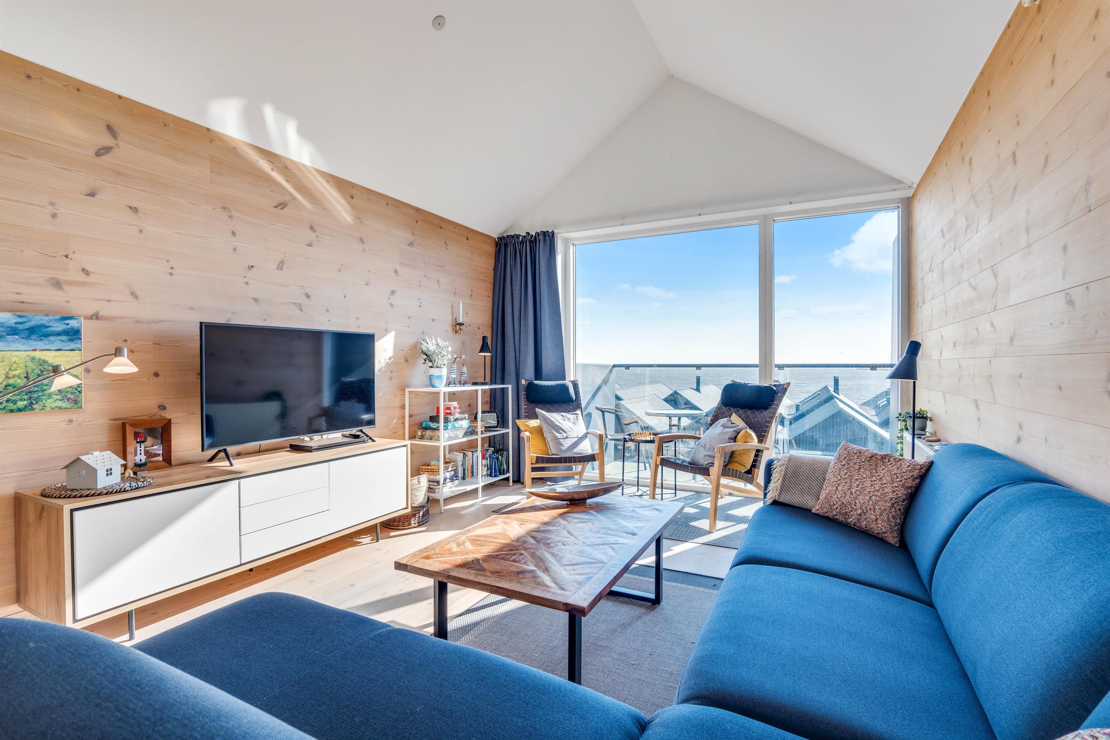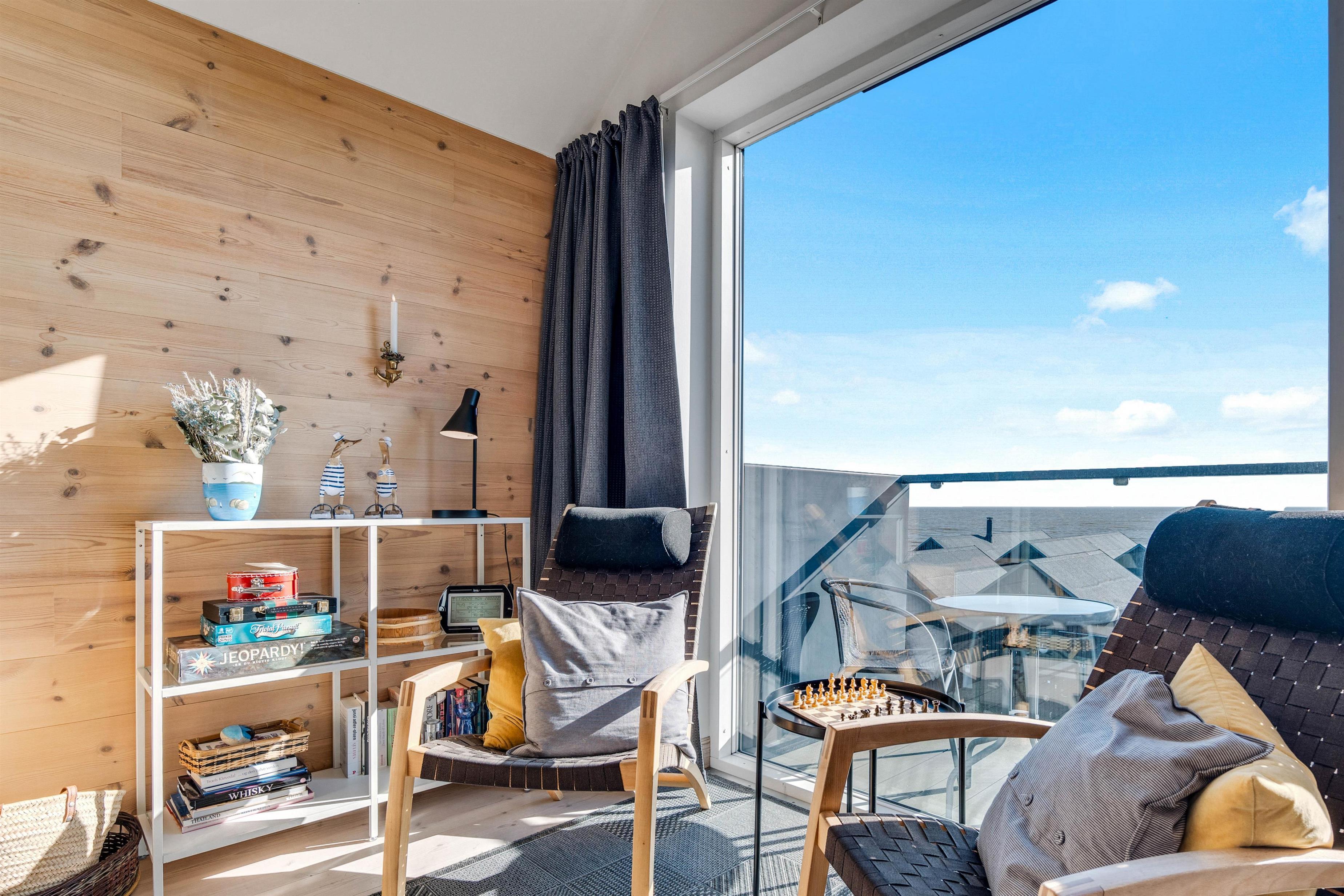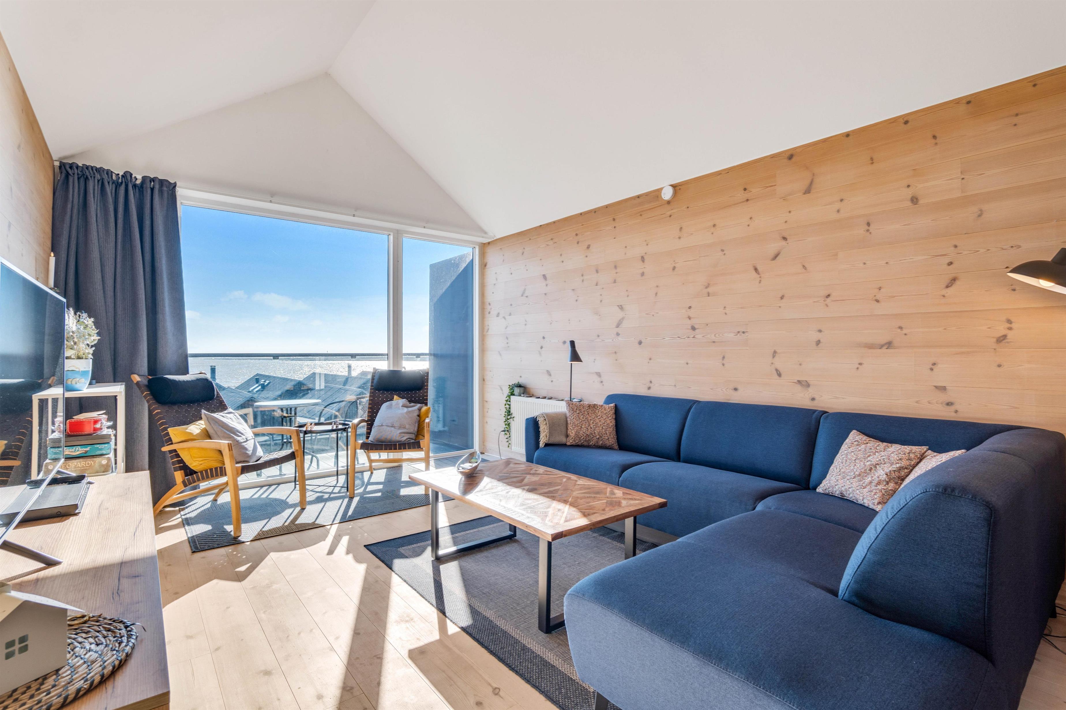 Fra lejlighedens stue har I direkte udgang til den sydvendte altan, hvorfra I kan nyde solens stråler og en god udsigt til fjorden.