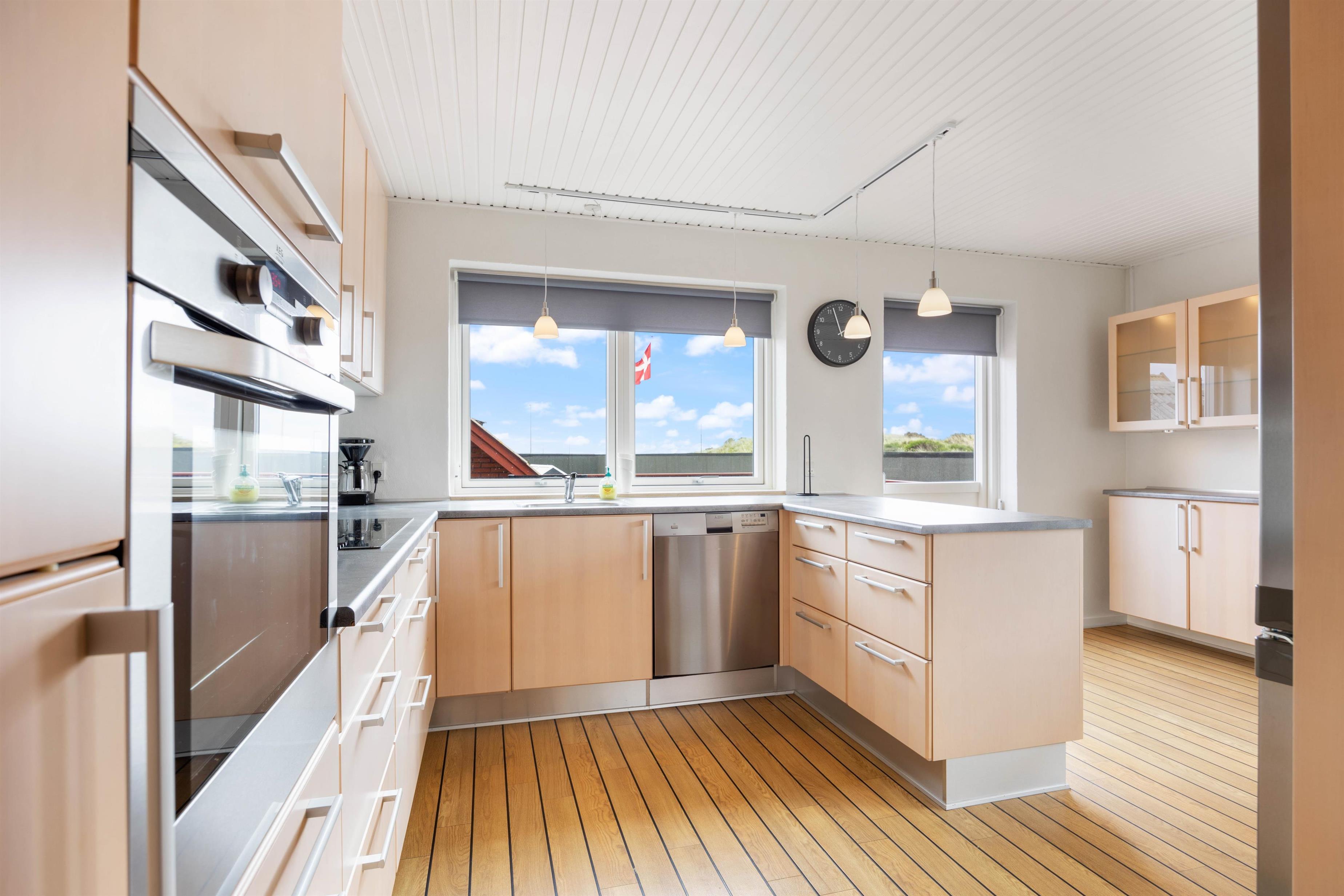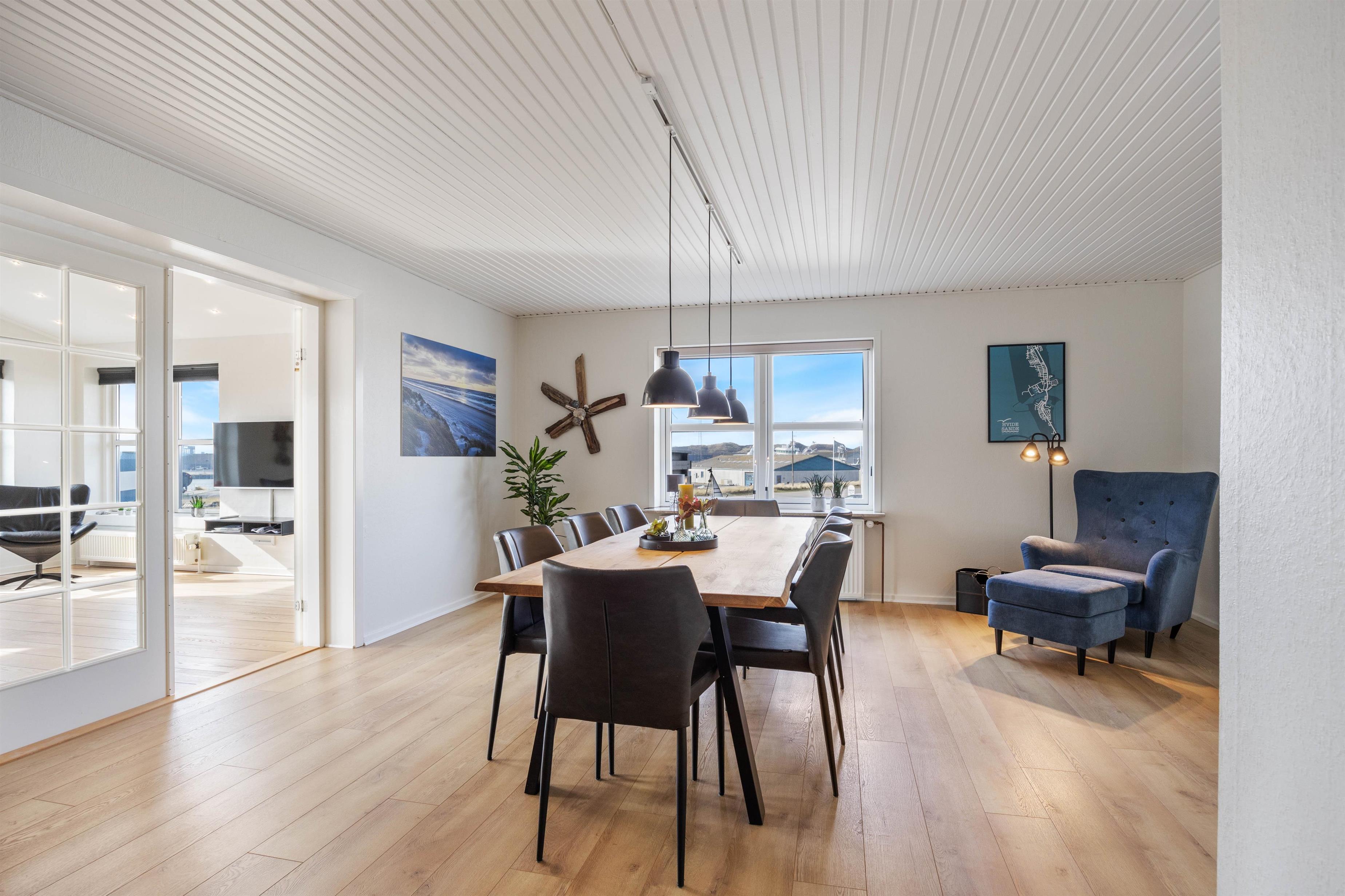 Ferielejligheden er præget af et lyst indtryk fra de mange store vinduer, som byder solskinnet indenfor. Med 175 m2 er der god plads til 8 personer og 2 hunde, som kan nyde hyggelige stunder i et skønt opholdsrum med et afslappende sofaområde. Her er især ekstra hyggeligt om aftenen, når de mange små lys i loftet skaber en fin "stjernehimmel". I køkkenet kan I tilberede lækre retter - Måske med fisk, som I selv har fanget på en af Hvide Sandes moler, eller købt i den nærvedliggende fiskebutik. Her er også en 80 L fryser, hvor I har mulighed for at opbevare jeres fangst eller måske bare is til de lune sommerdage.