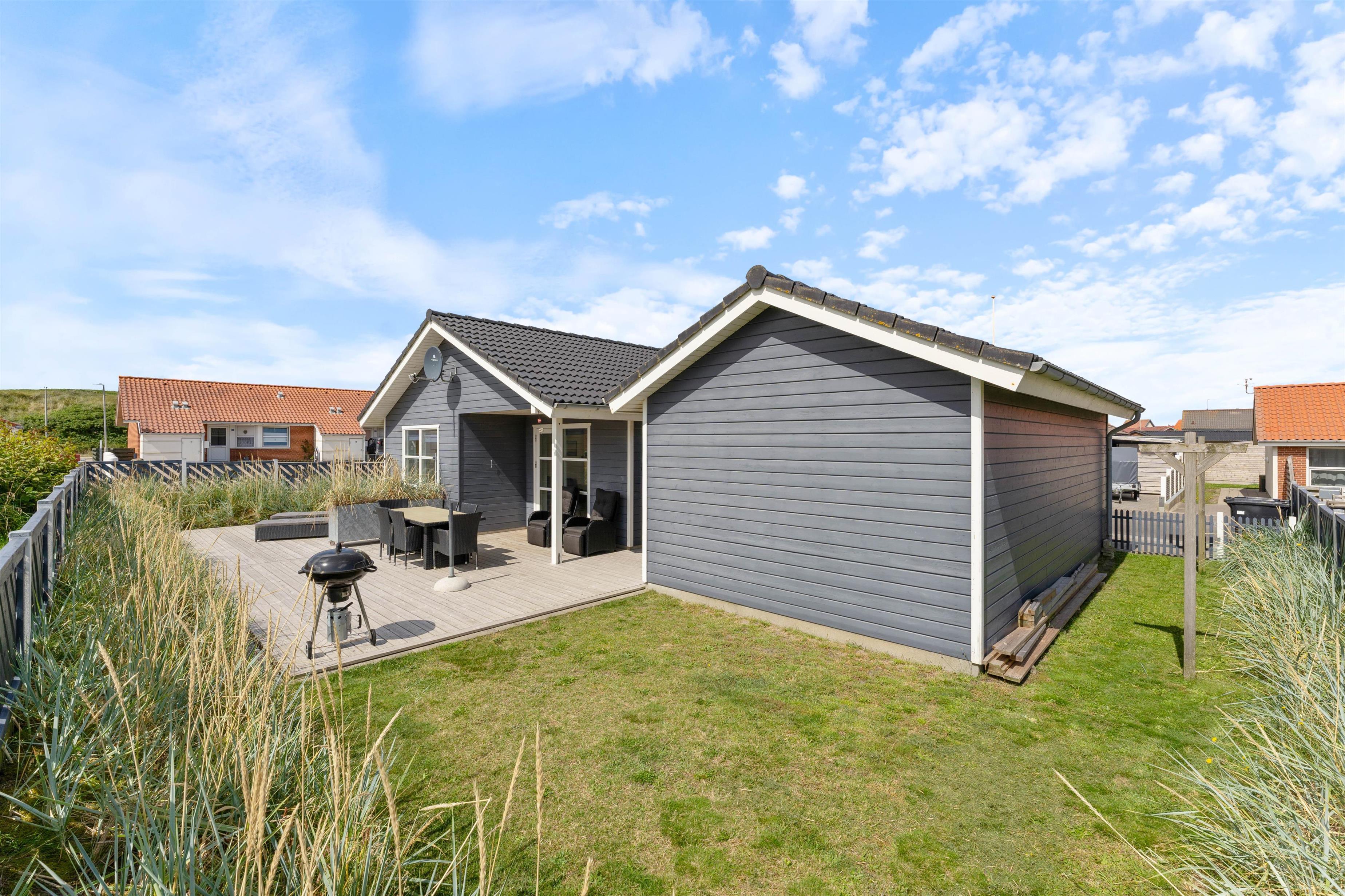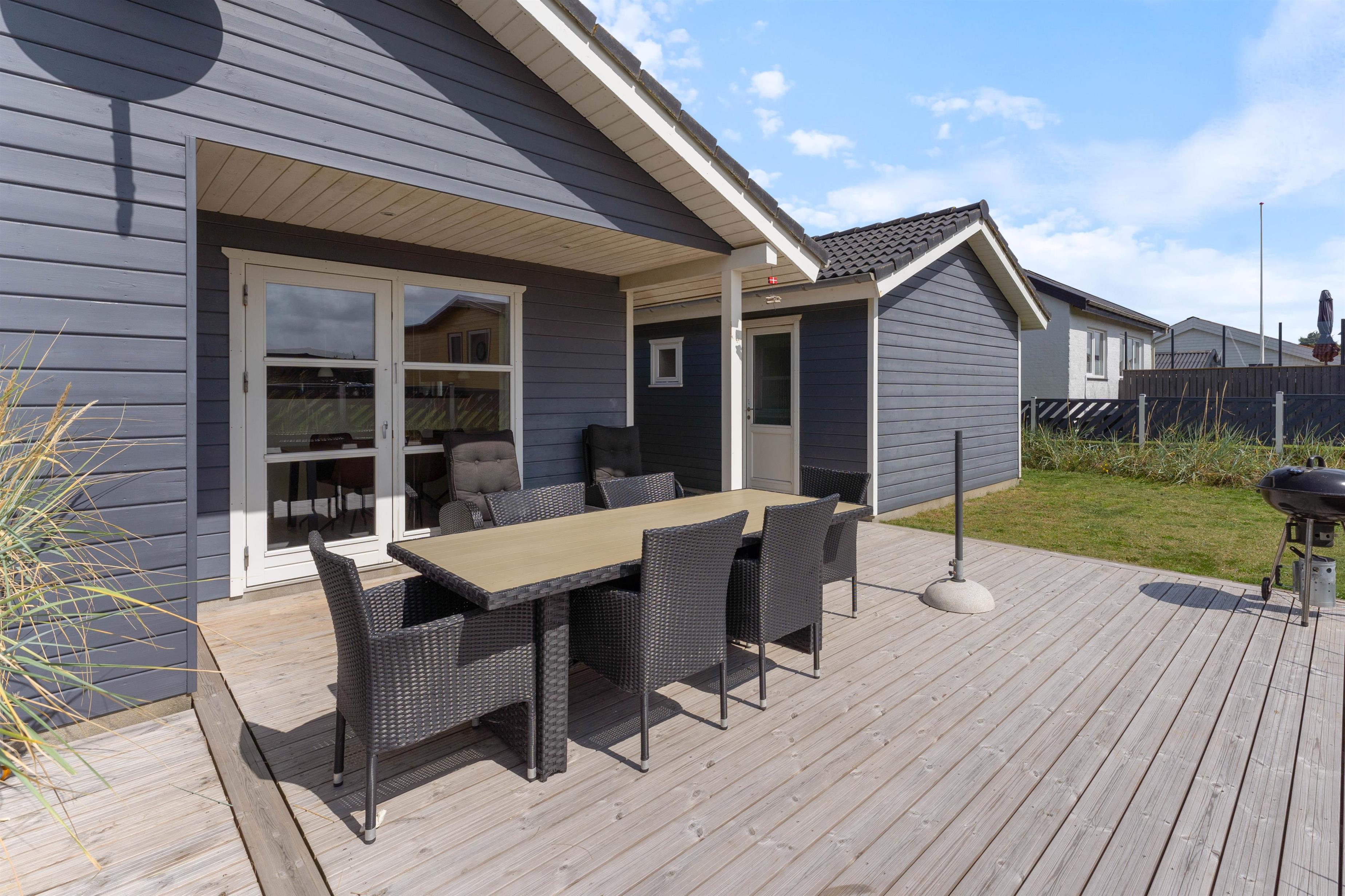 Sommerhusets sydvendte terrasse indbyder til mange hyggelige stunder med familien. Her kan I nyde en varm sommerdag med en god bog og slutte af med et lækkert grillmåltid, mens solen går ned i baggrunden. Terrassen er delvist afskærmet, så I kan sidde i læ for vinden. Imens I slapper af på terrassen, kan hunden løbe frit rundt i den lukkede have.