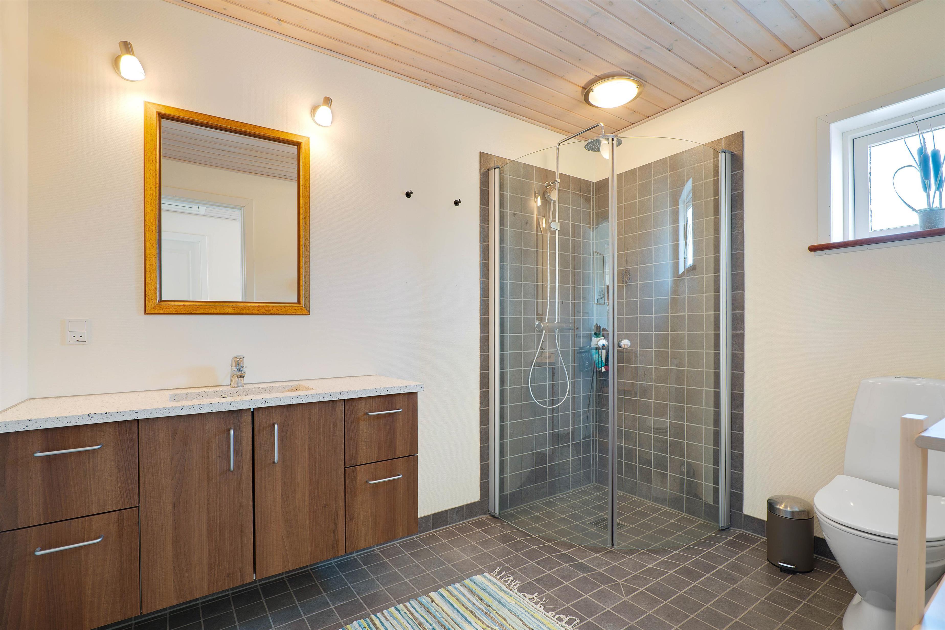 Der er et rummeligt badeværelse med gulvvarme, og har I brug for at vaske tøj i løbet af ferien, så finder I også en vaskemaskine og tørretumbler i sommerhuset.