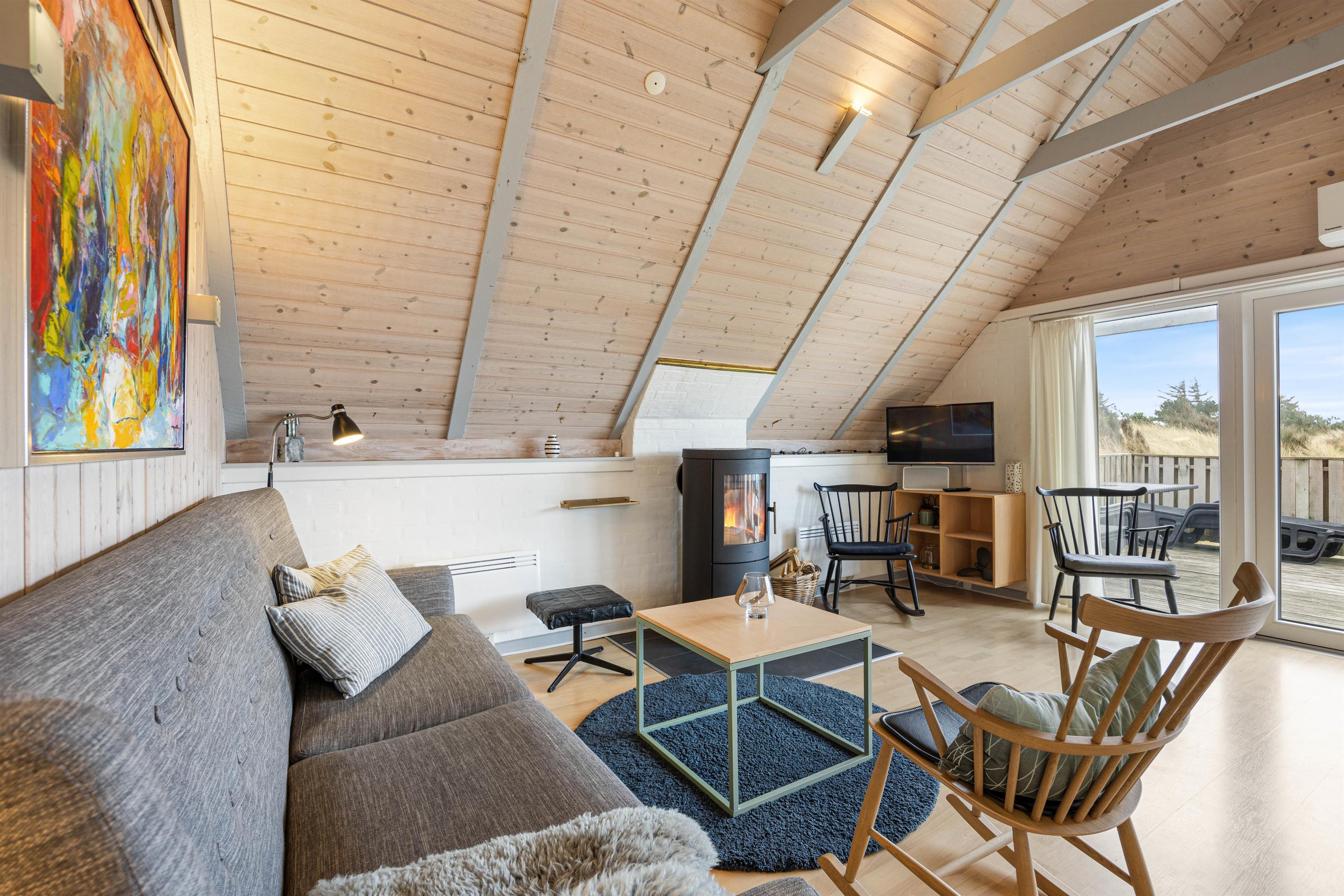 Samlingspunktet bliver det hyggelige og rummelige alrum, med loft til kip. Her er køkkenet, stuen og spisestuen er i åben forbindelse, så der er mulighed for at nyde tiden med hinanden, selvom der både ses tv, spilles brætspil og laves mad. Rummet kan I med fordel varme op med den energibesparende varmepumpe eller tænde op i brændeovnen, der især er skøn på de køligere dage. Fra stuen kan I også slå dørene op ud til den solskinsrige terrasse.