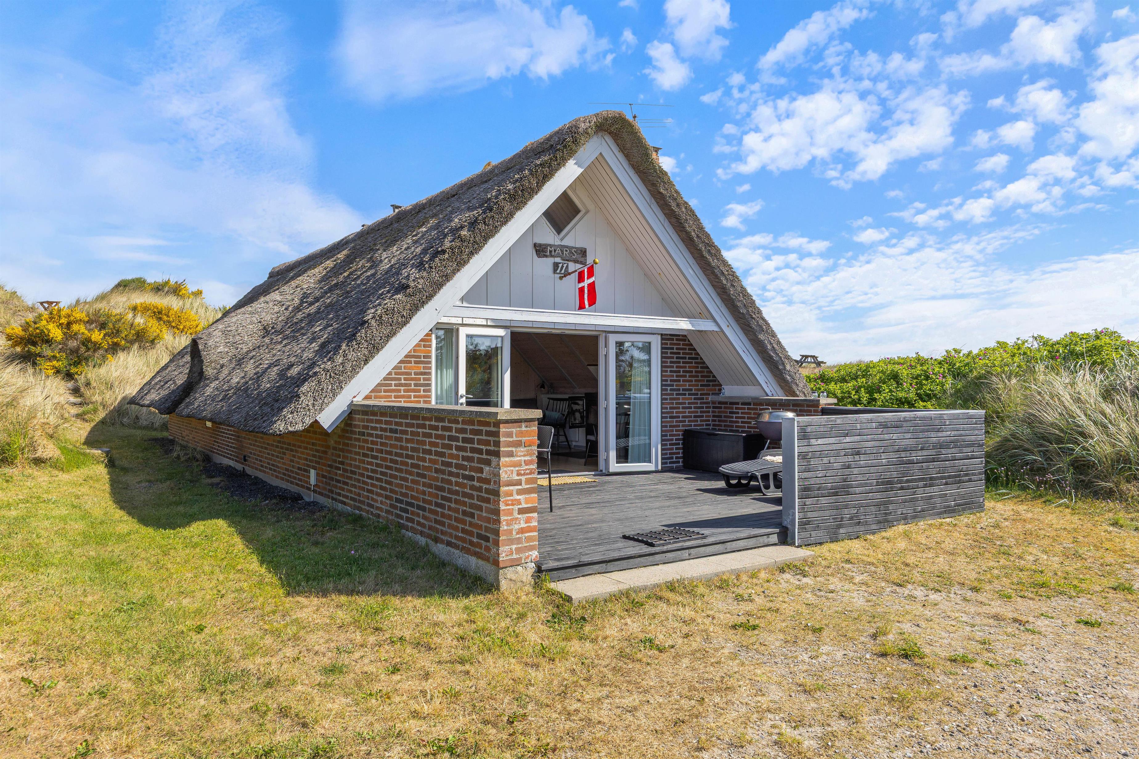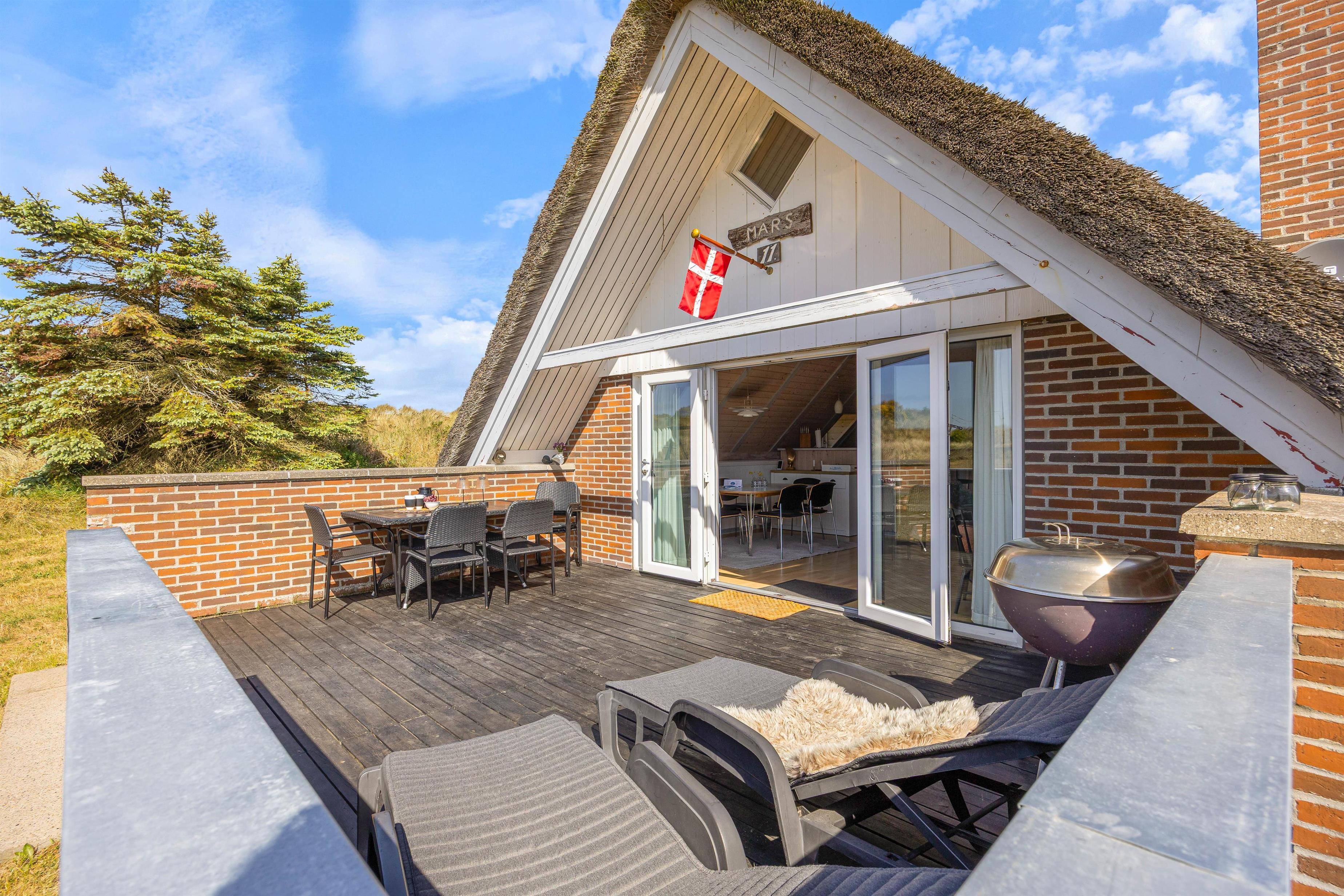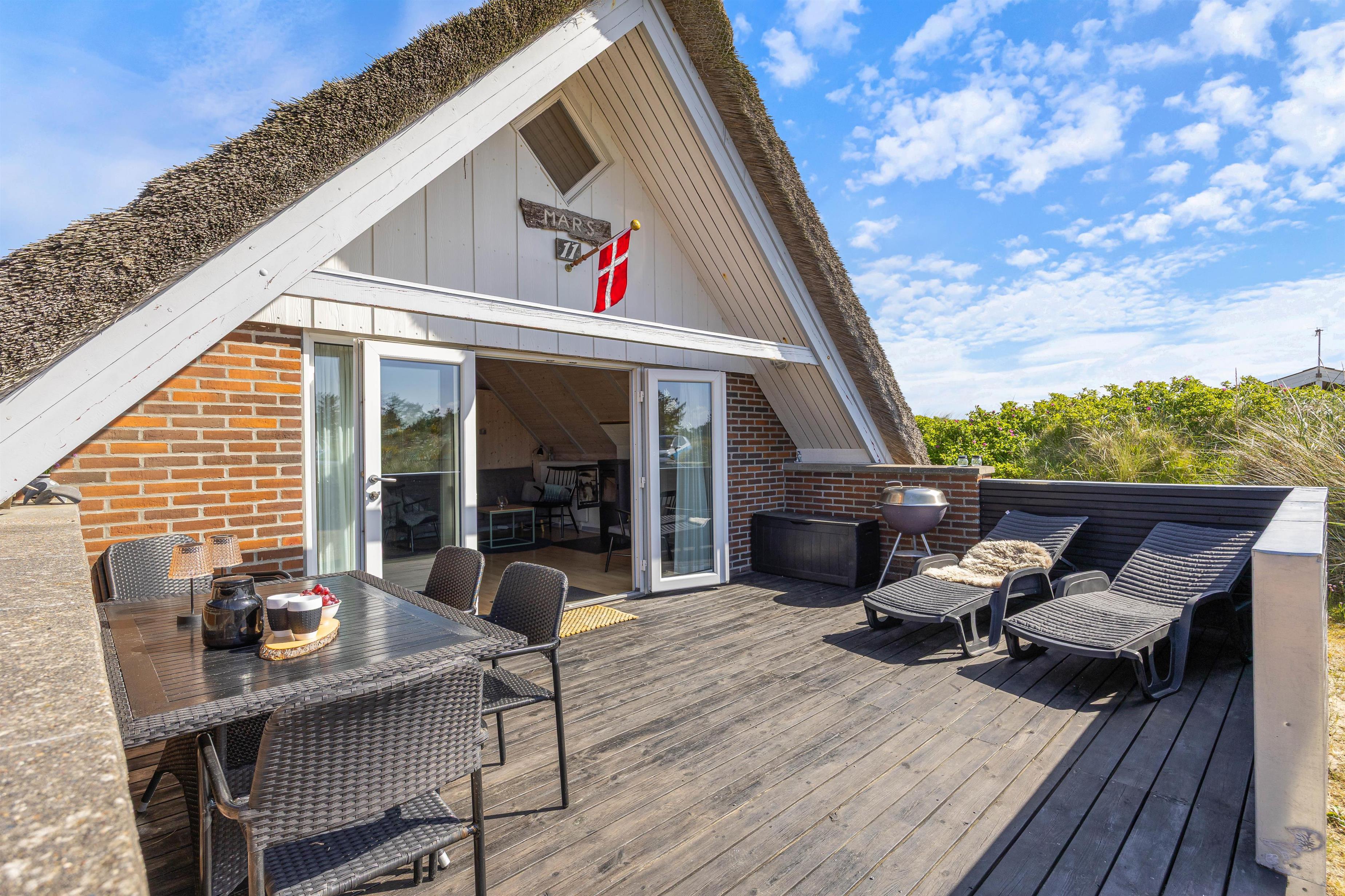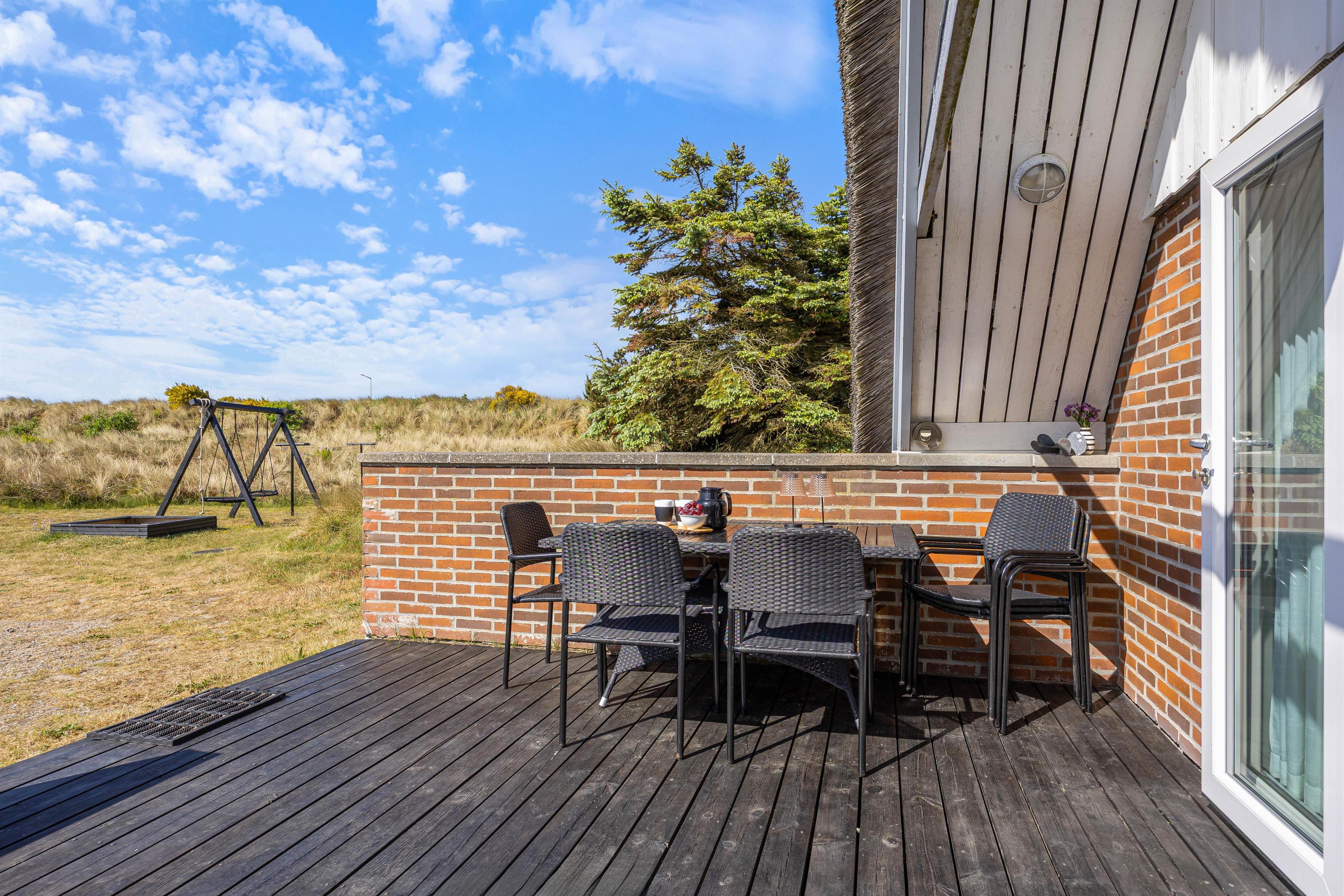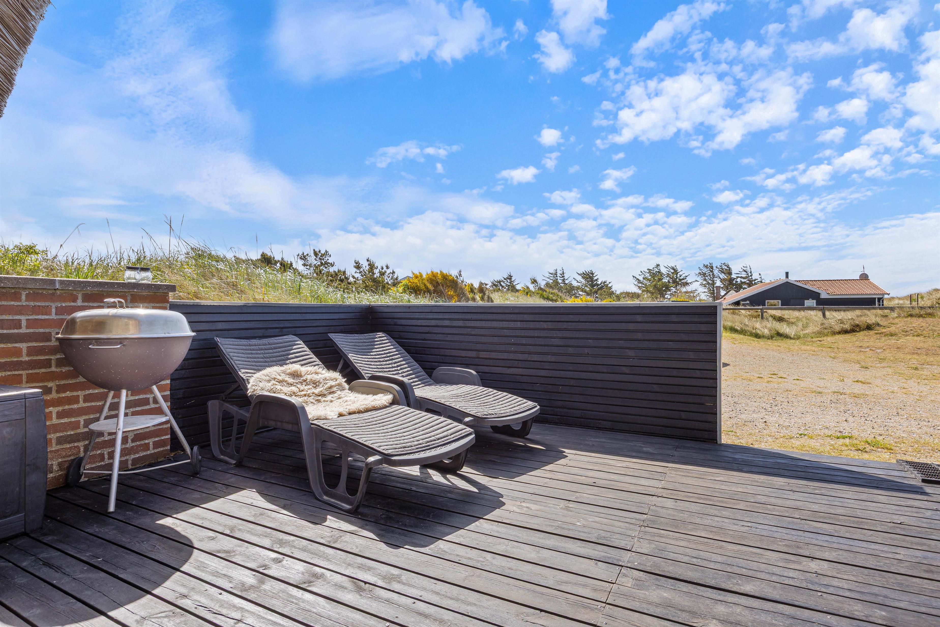 Fra stuen er der udgang til den dejlige afskærmede terrasse, perfekt til de gode solskinsdage. Her er der både havemøbler og liggestole, så bekvemt kan sidde og fordybe dig i en god bog. Og om aftenen kan du tænde op i grillen og tilberede et lækkert måltid sammen med familien.