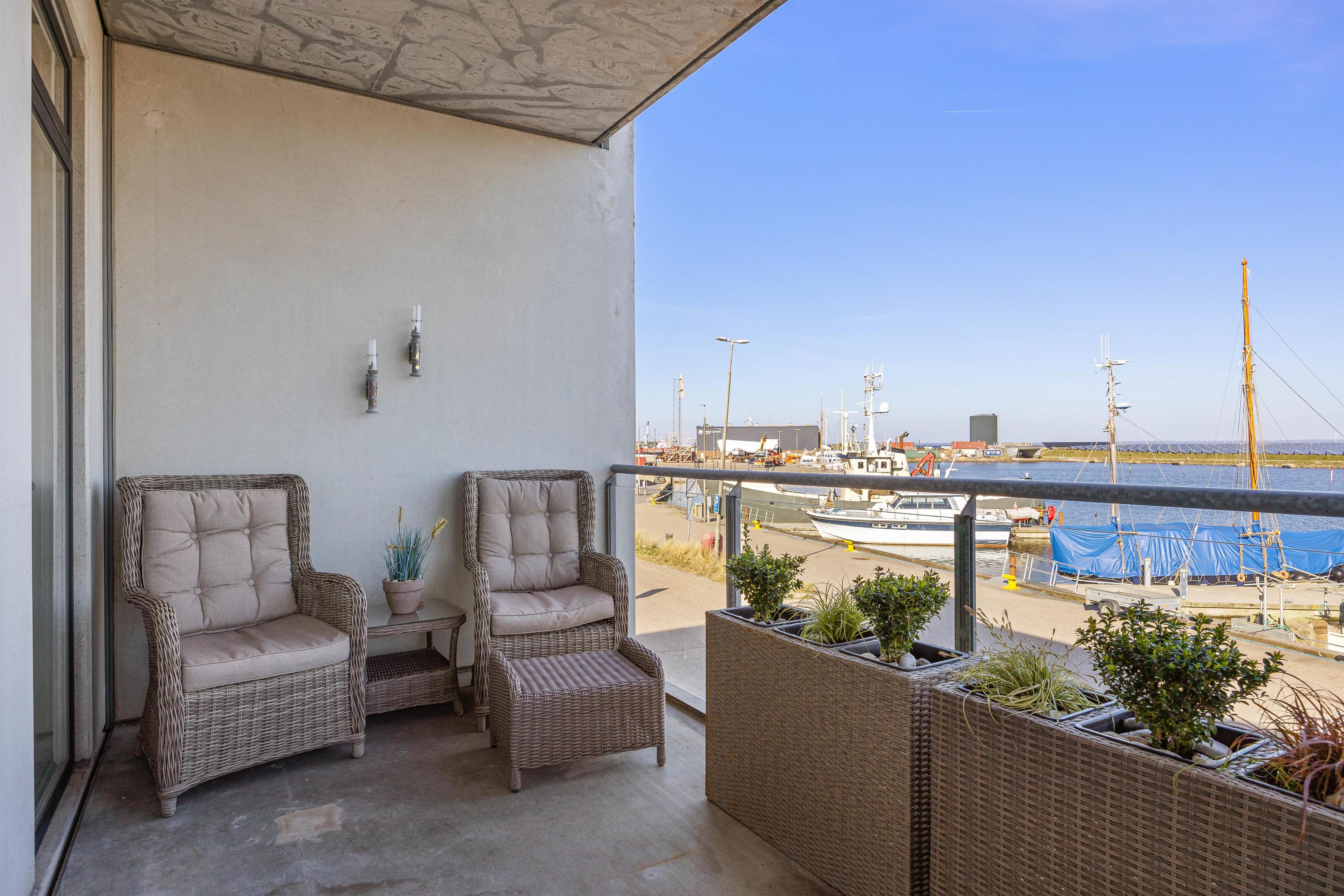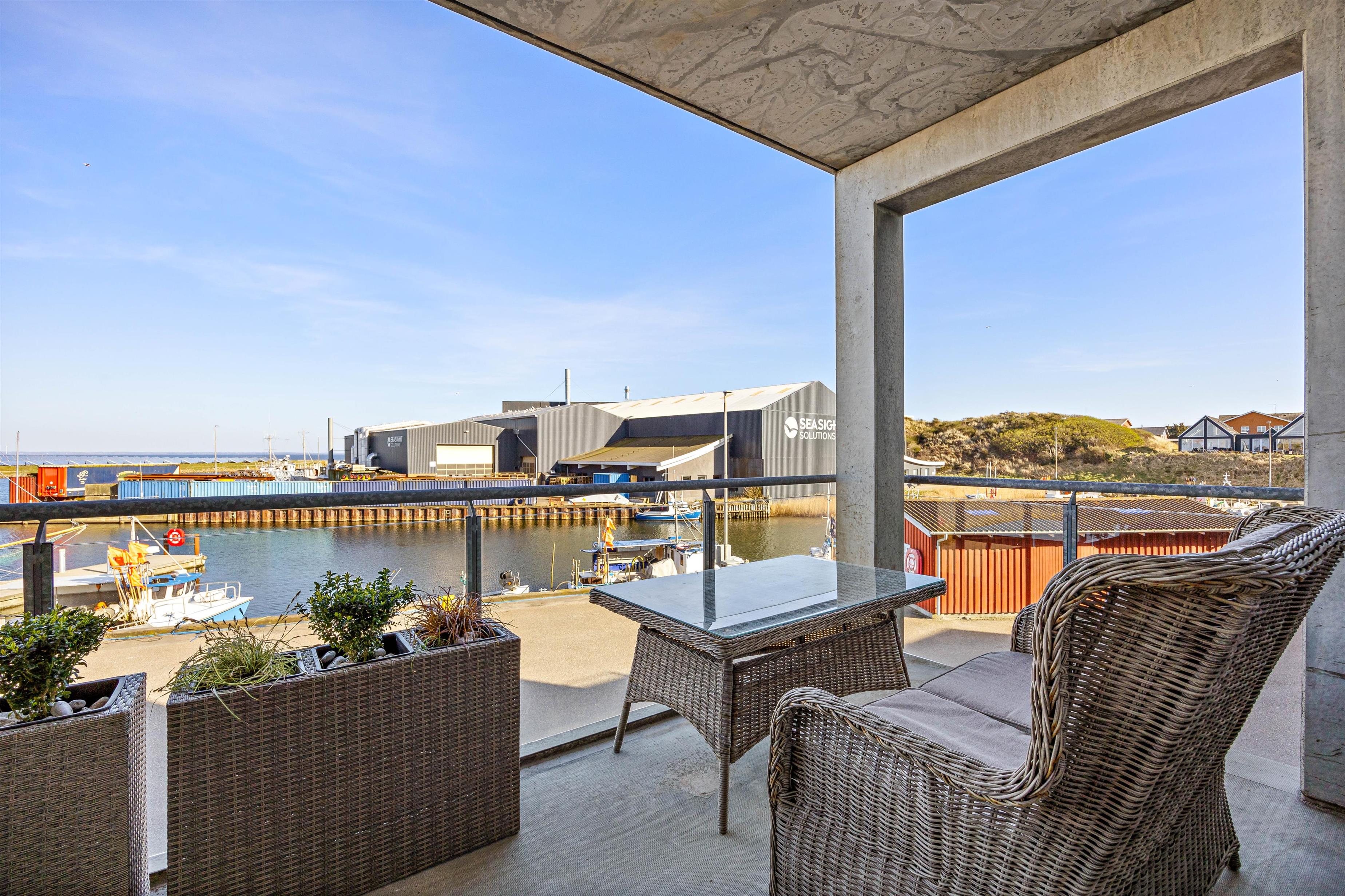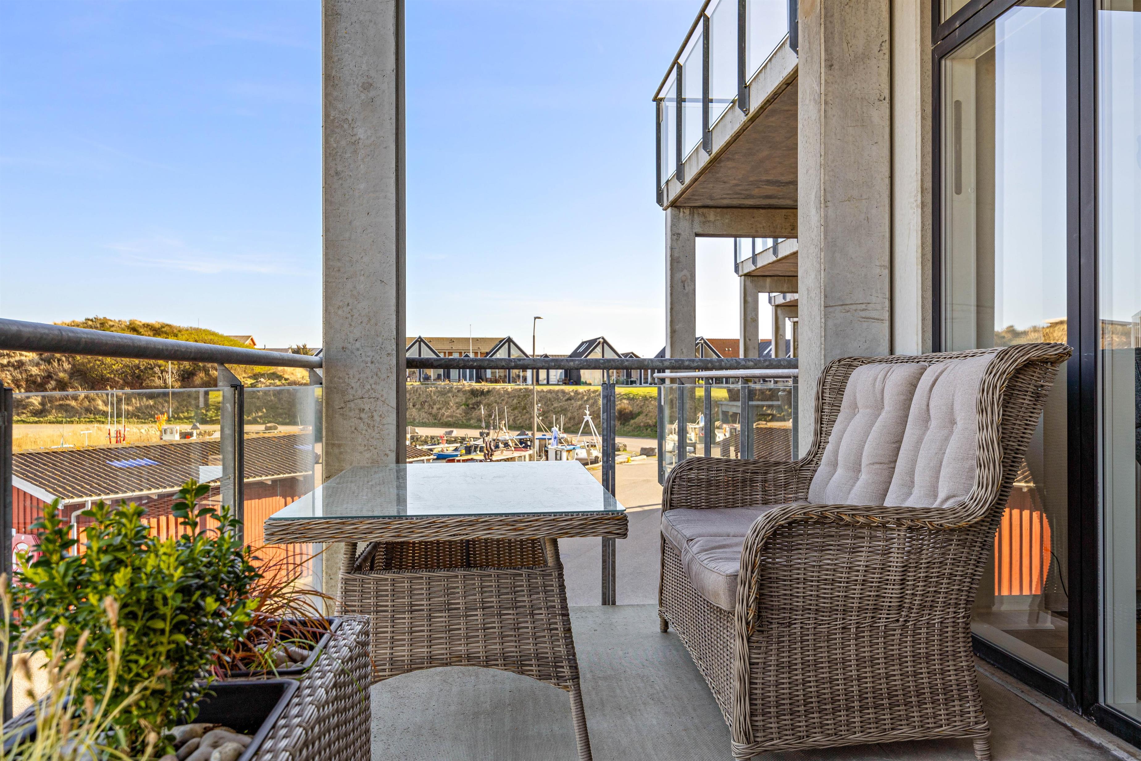 Udenfor finder I 2 overdækkede altaner – 1 mod vest ved indgangen, som ligger ugeneret, da lejligheden ligger i enden af bygningen og 1 mod øst med direkte udgang fra køkken-alrummet. Altanen mod øst er perfekt til at nyde morgenkaffen i læ for vinden eller grille en lækker middag på de lune sommeraftener. Den fantastiske udsigt over havnen og de små fiskerbåde skaber en unik stemning og giver en særlig ro til feriedagene.