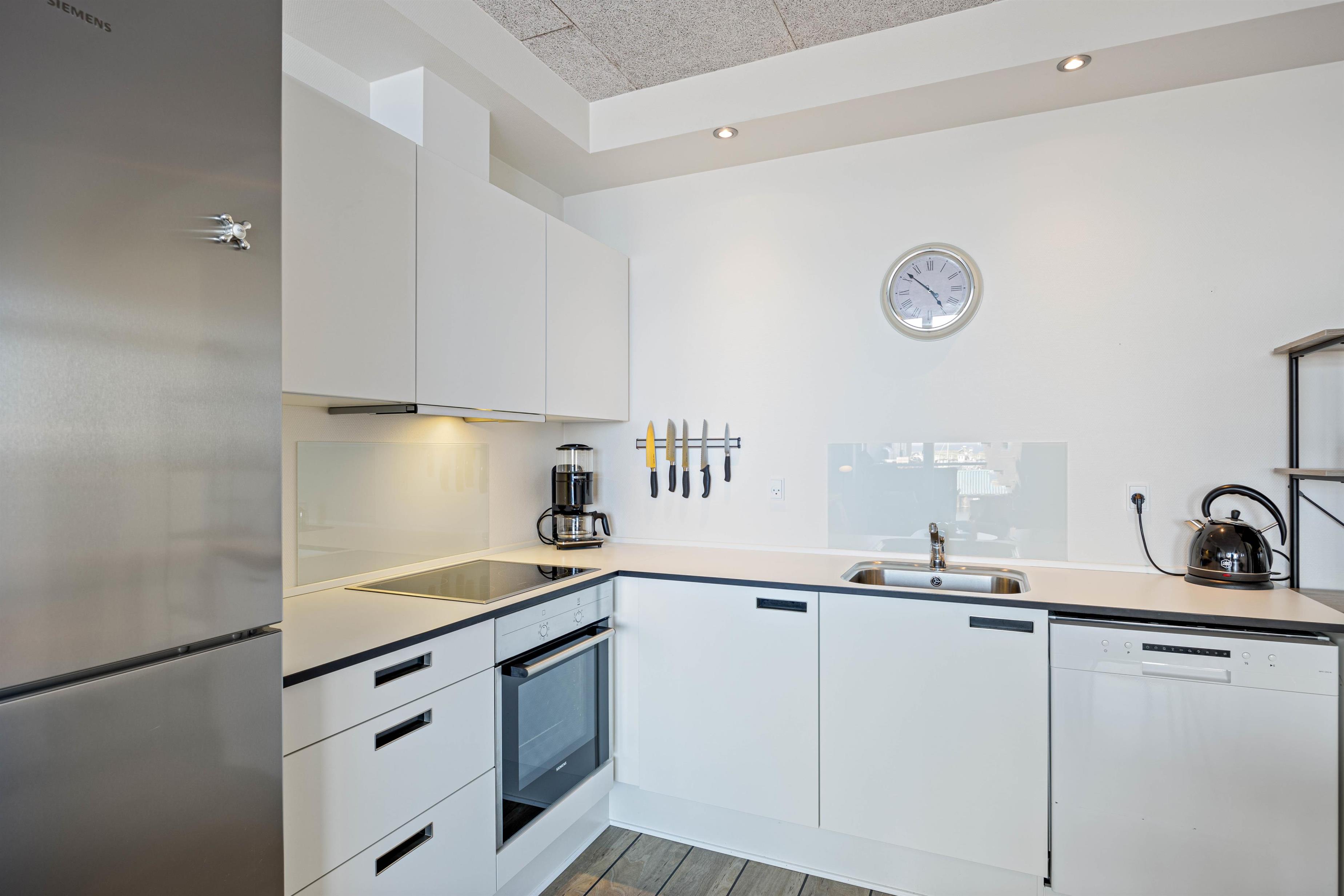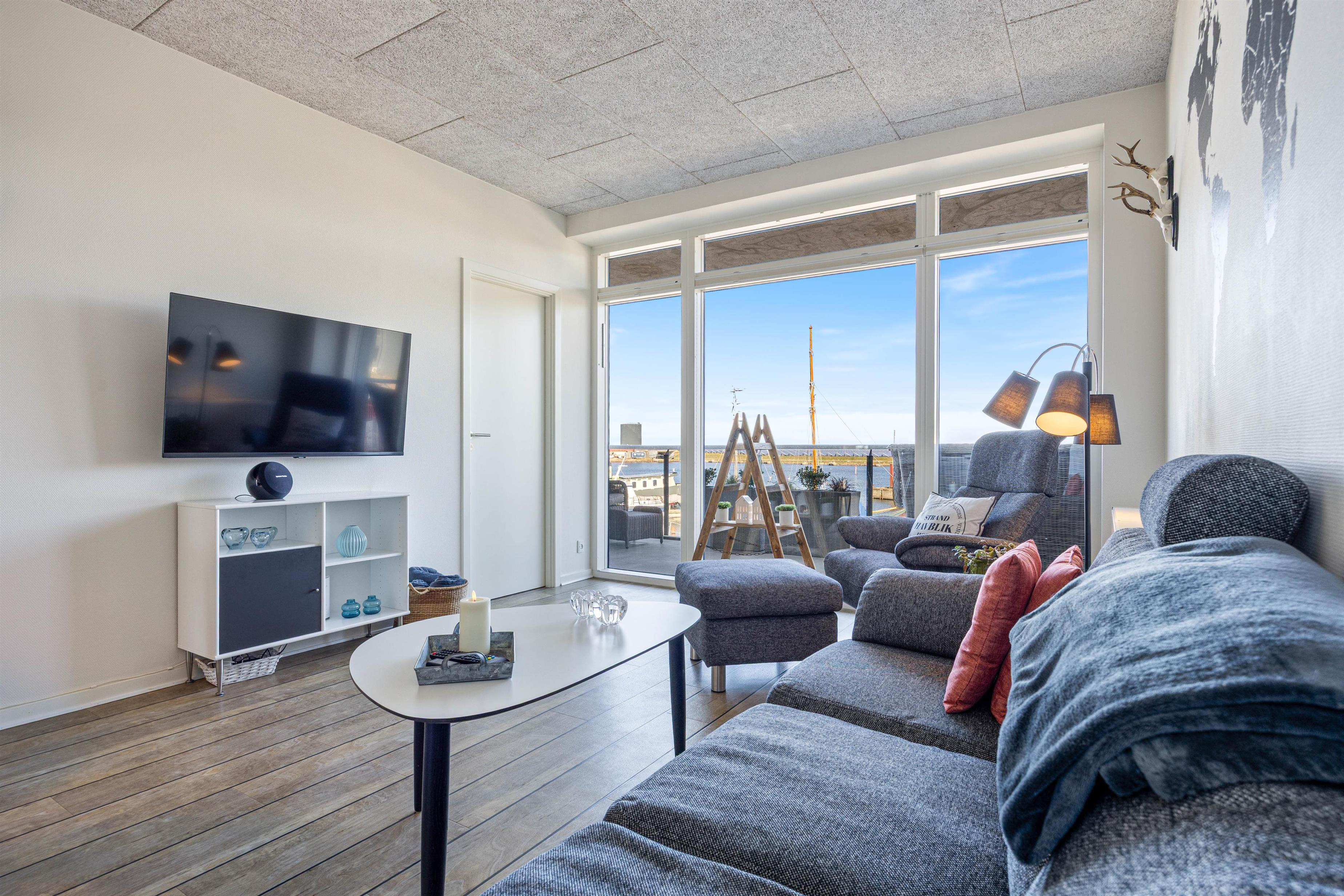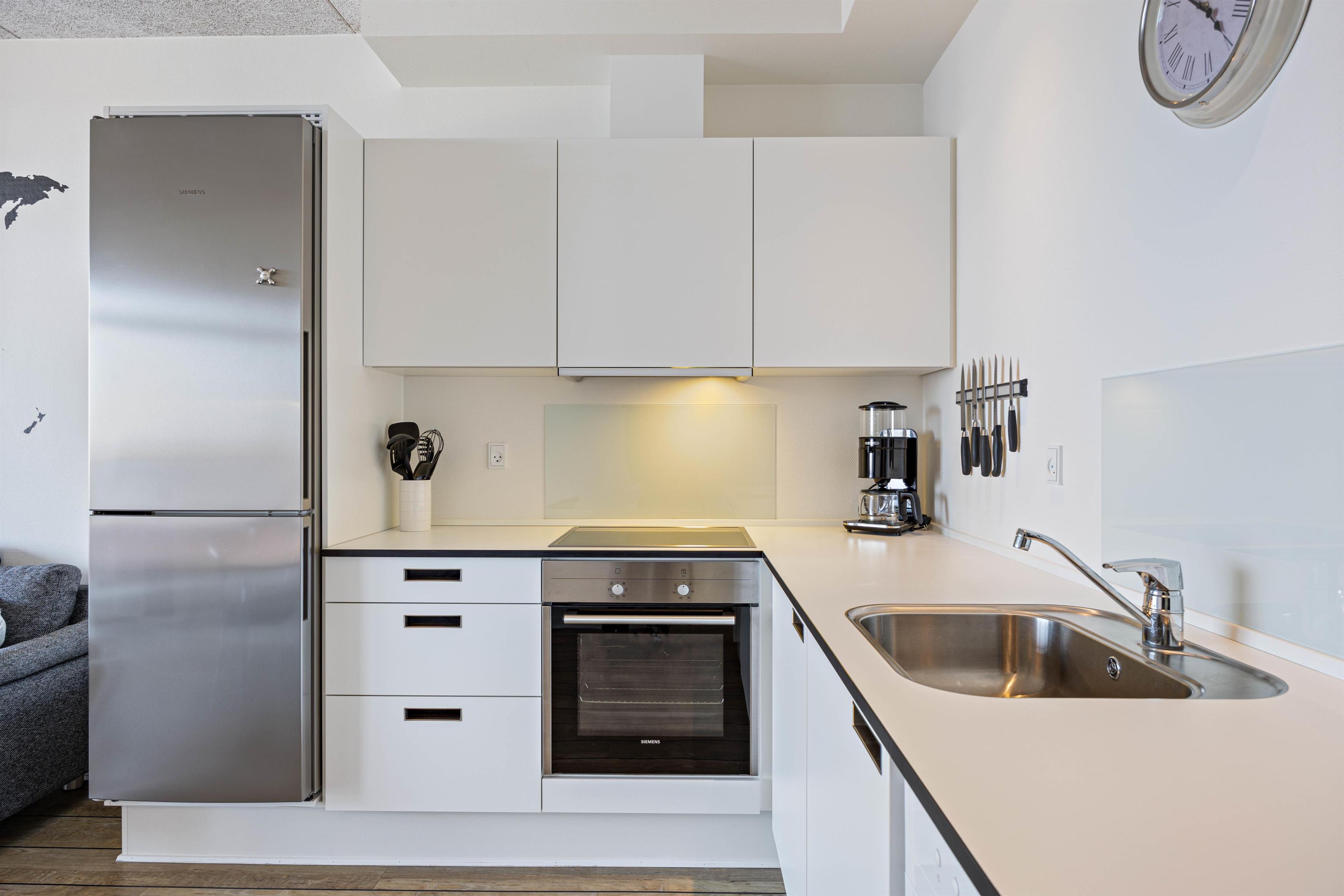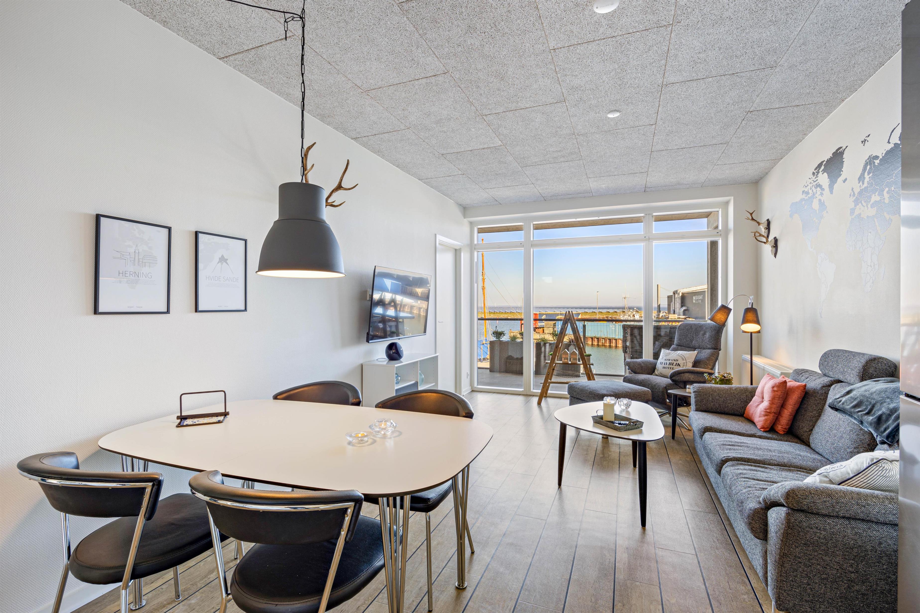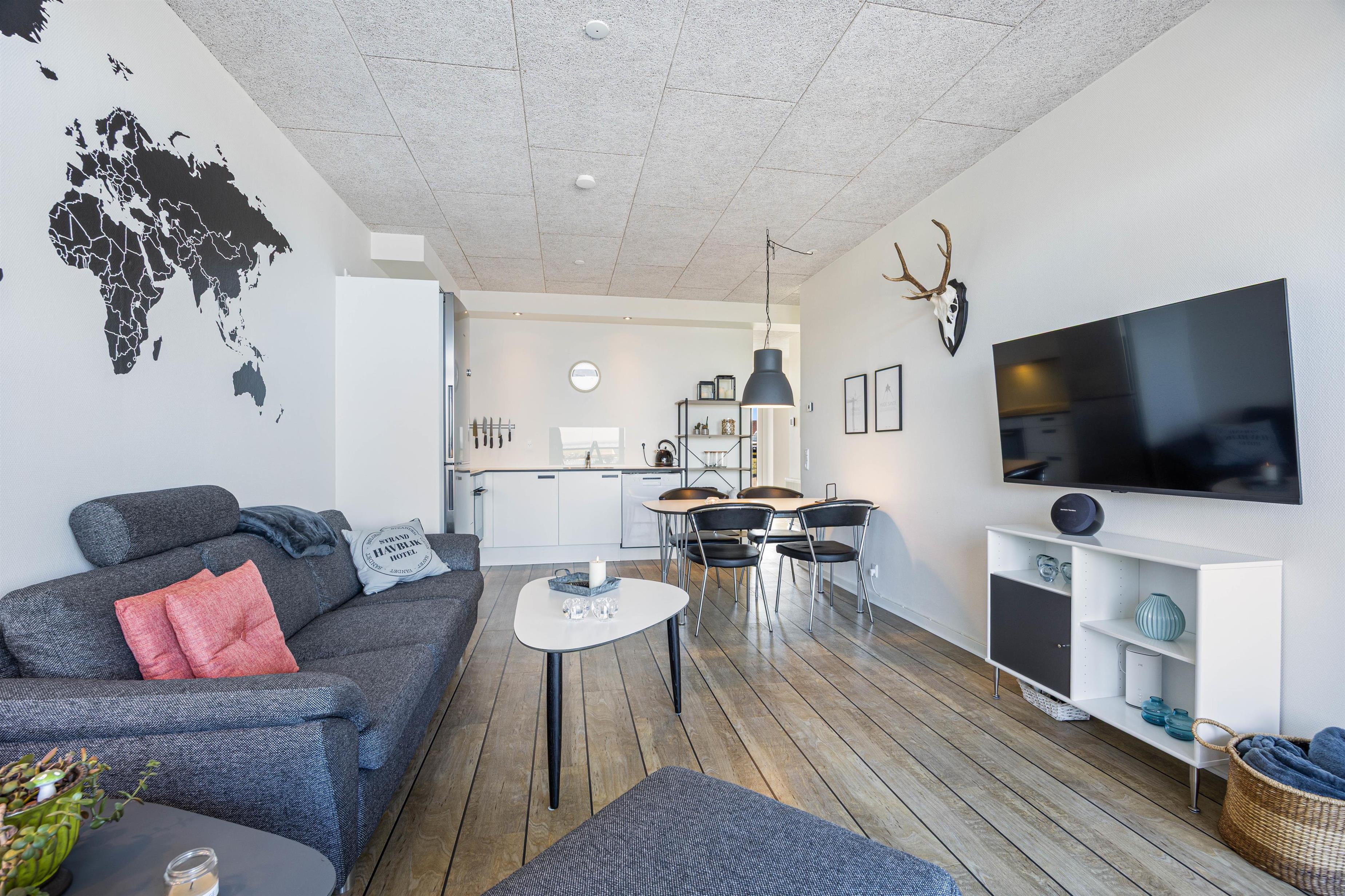 Ferielejligheden byder på et hyggeligt køkken-alrum, hvor der er plads til fælles madlavning og afslapning i sofaen. Fra sofaen kan I se en god film på tv’et eller lade blikket vandre ud over den smukke havn gennem de store vinduer.