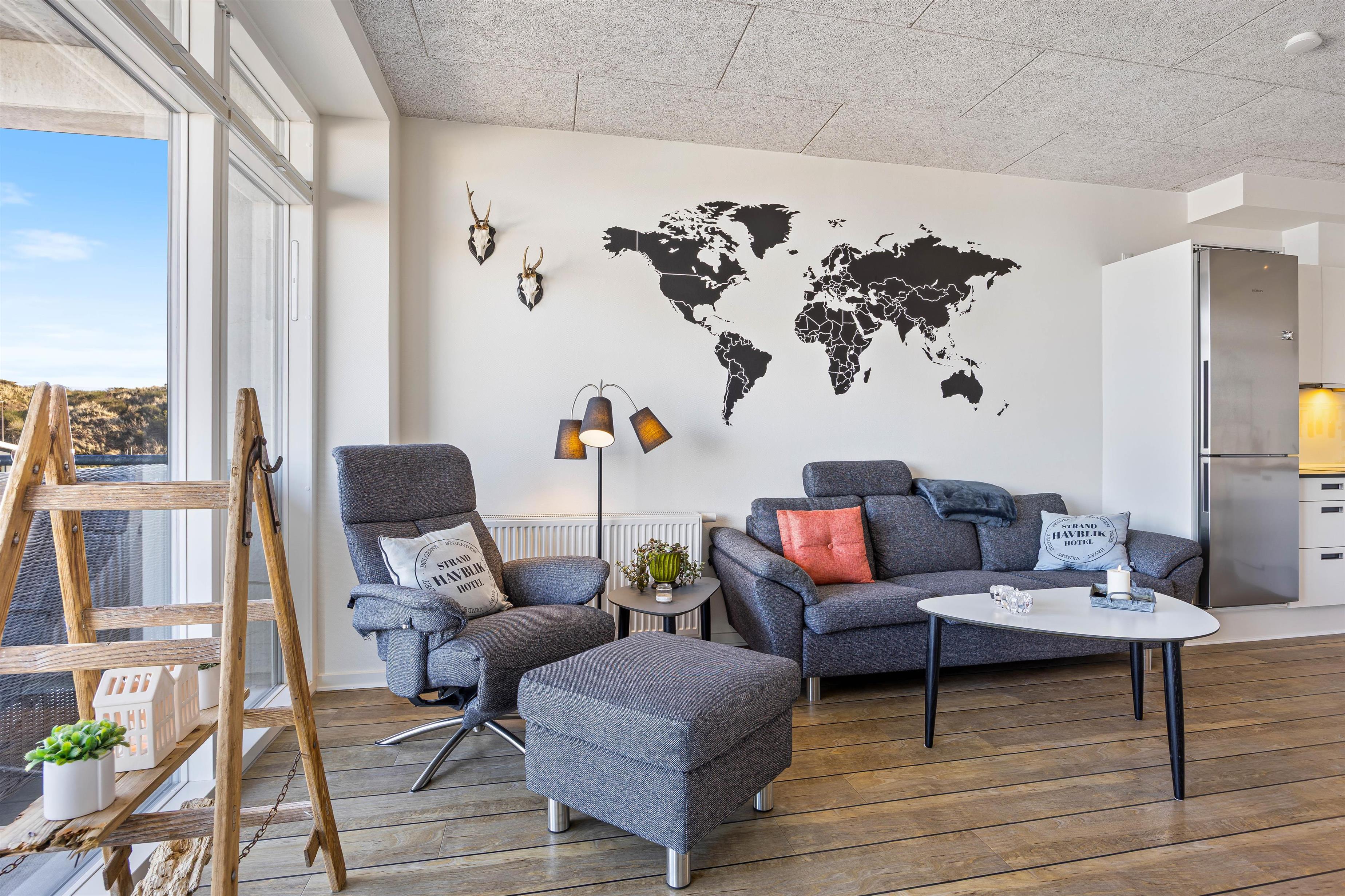 Fra ferielejligheden har I kun 550 meter til stranden, hvor I kan nyde lange gåture langs kysten. Hvis benene er lidt trætte efter gåturen, er der en elevator ved lejligheden, som I kan benytte jer af. Indkøbsmulighederne ligger kun 150 meter væk, så det er nemt at handle ind til dagens måltider. Hvide Sande byder på et væld af aktiviteter, herunder vandsport som windsurfing, hyggelige caféer og gode restauranter. Besøg også det lokale røgeri, eller tag en tur på havnen og få en is.