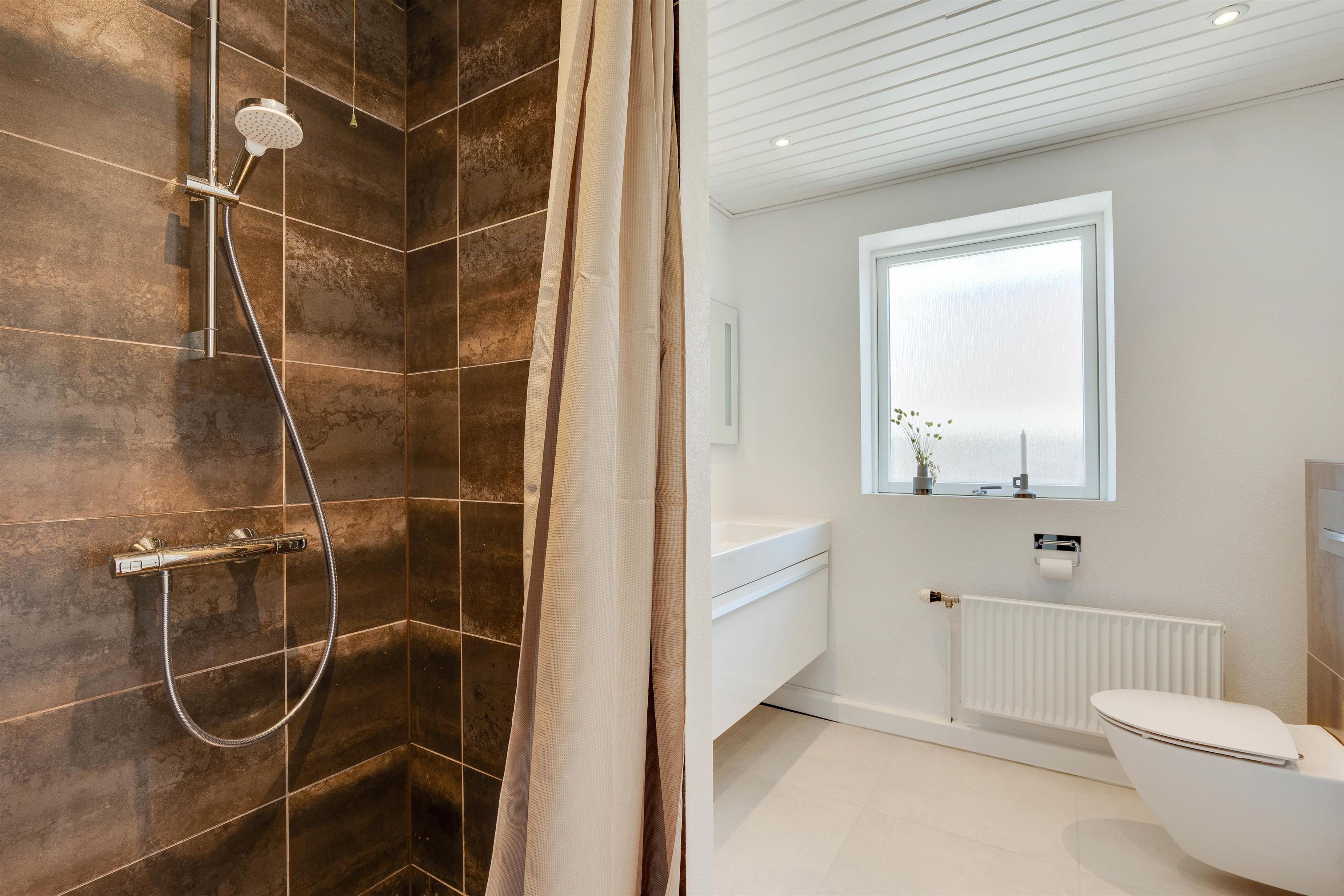 Sommerhusets badeværelse er udstyret med gulvvarme, og her er desuden både vaskemaskine samt tørretumbler.