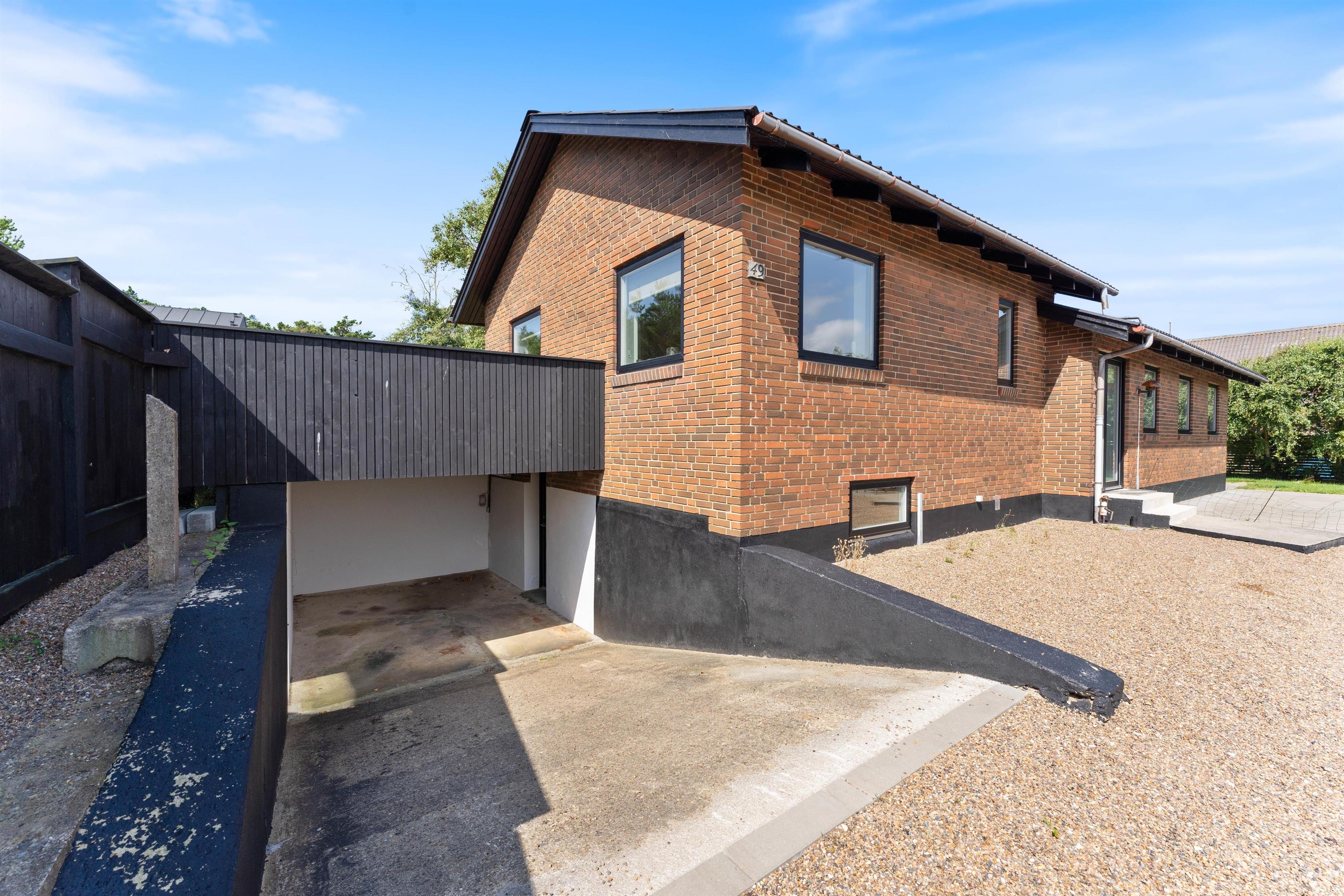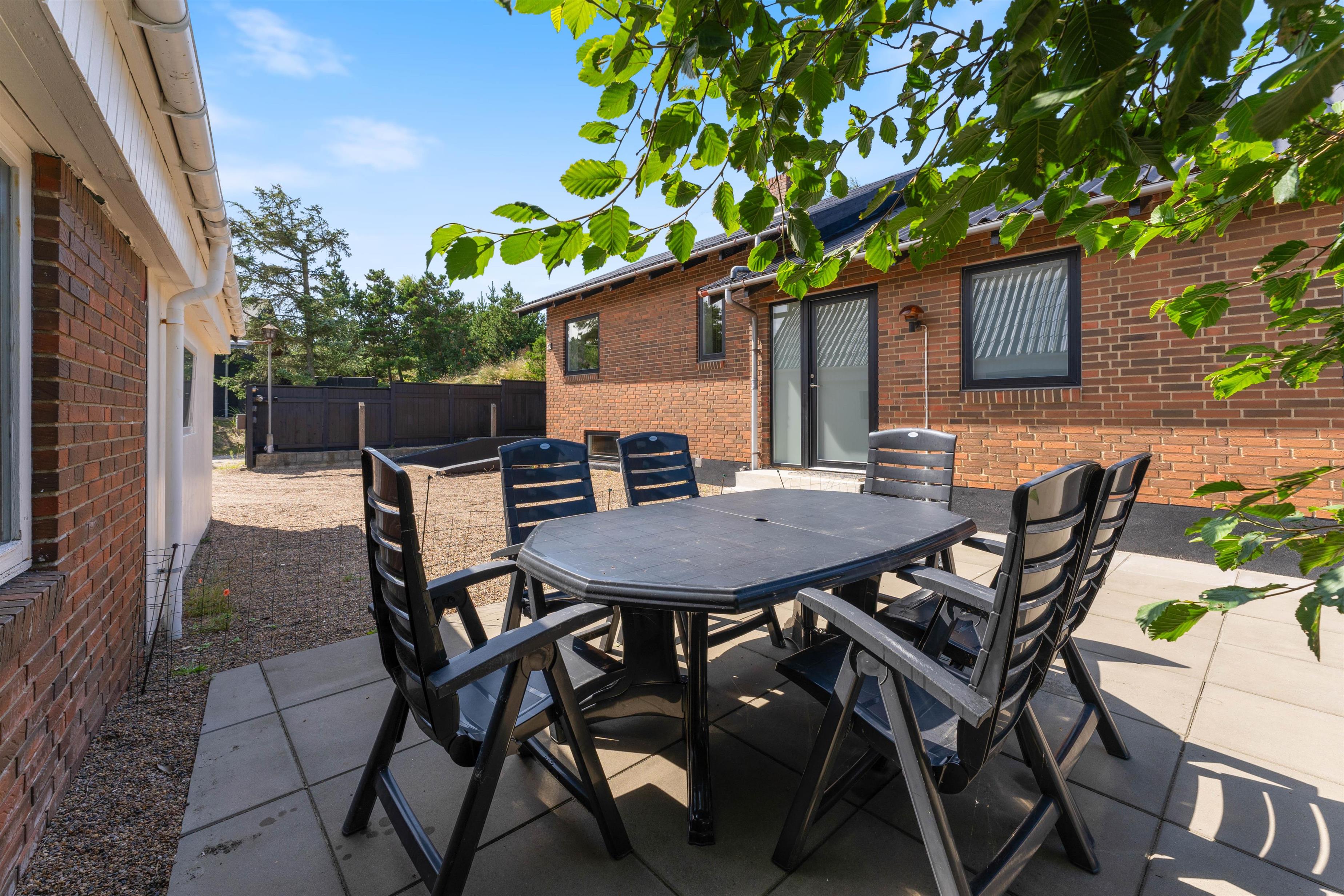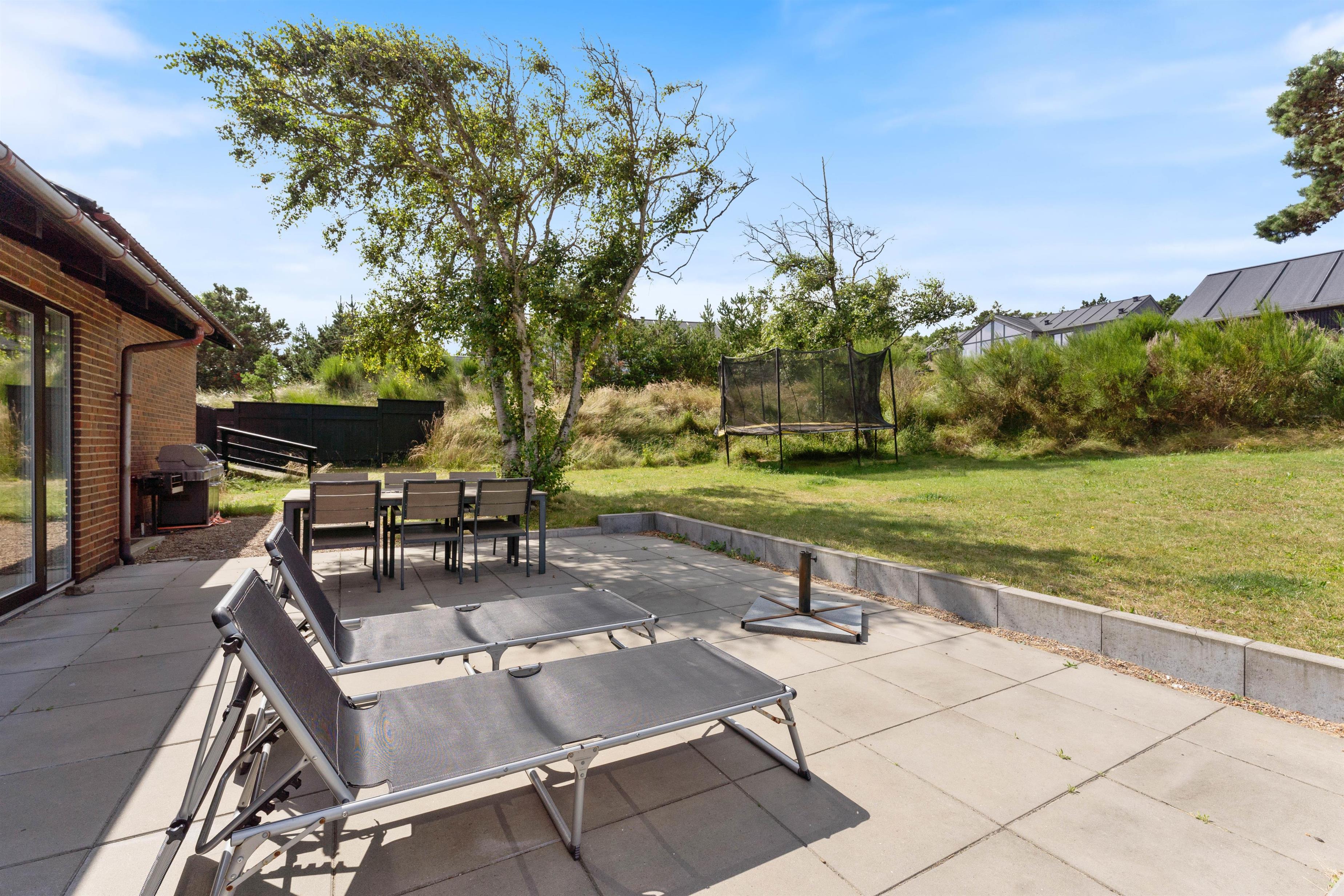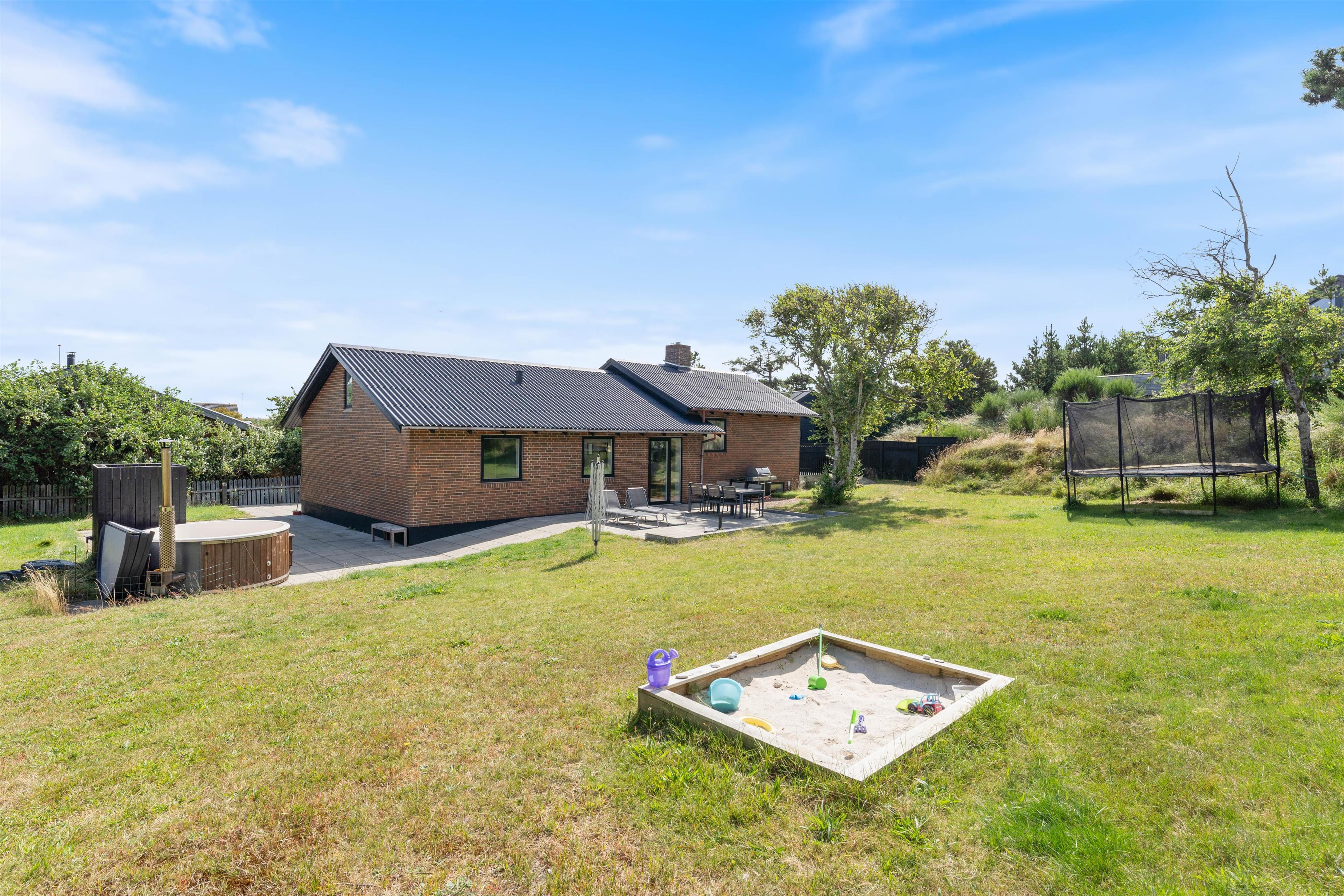 Feriehuset ligger på en skøn plænegrund, hvor der er god plads til sjov og leg for børnene. Fra køkkenet har I direkte udgang til have og dejlige terrasser med vildmarksbad. Der er også en udebruser, som er tilgængelig fra april til november. Her kan I nyde et lækkert grillmåltid, inden turen går til stranden, hvor I kan se den smukke solnedgang.
