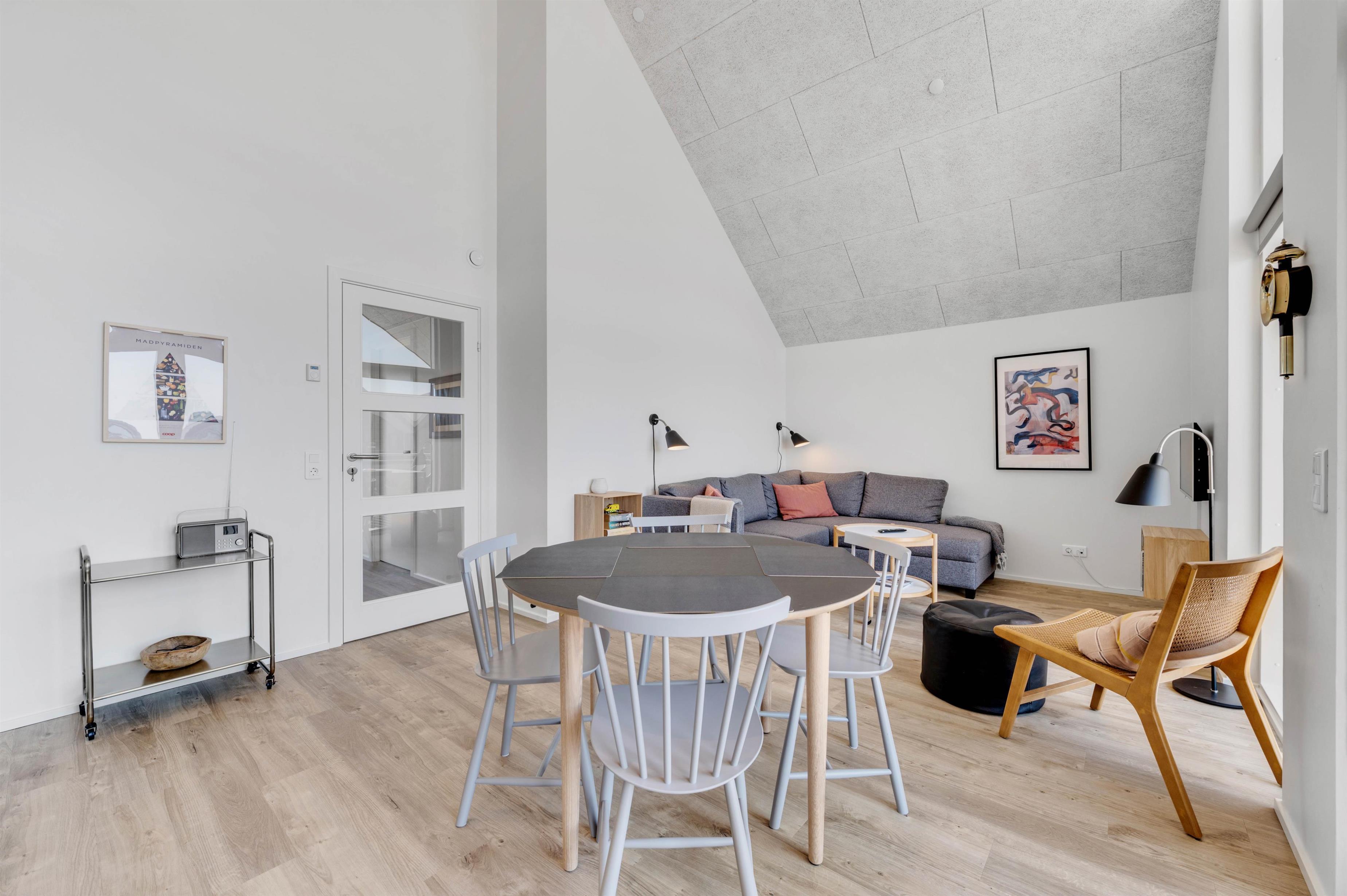 Der er også tænkt på det praktiske i indretningen. Køkkenet er udstyret med opvaskemaskine, og der er også vaskemaskine og tørretumbler i ferielejligheden – her er de huslige pligter hurtigt overstået, så I har endnu bedre tid til at nyde feriedagene og det gode selskab. Opholdsrummet med integreret køkken og soveværelset er desuden begge udstyret med gulvvarme, så I året rundt har en behagelig temperatur i hele lejligheden.
