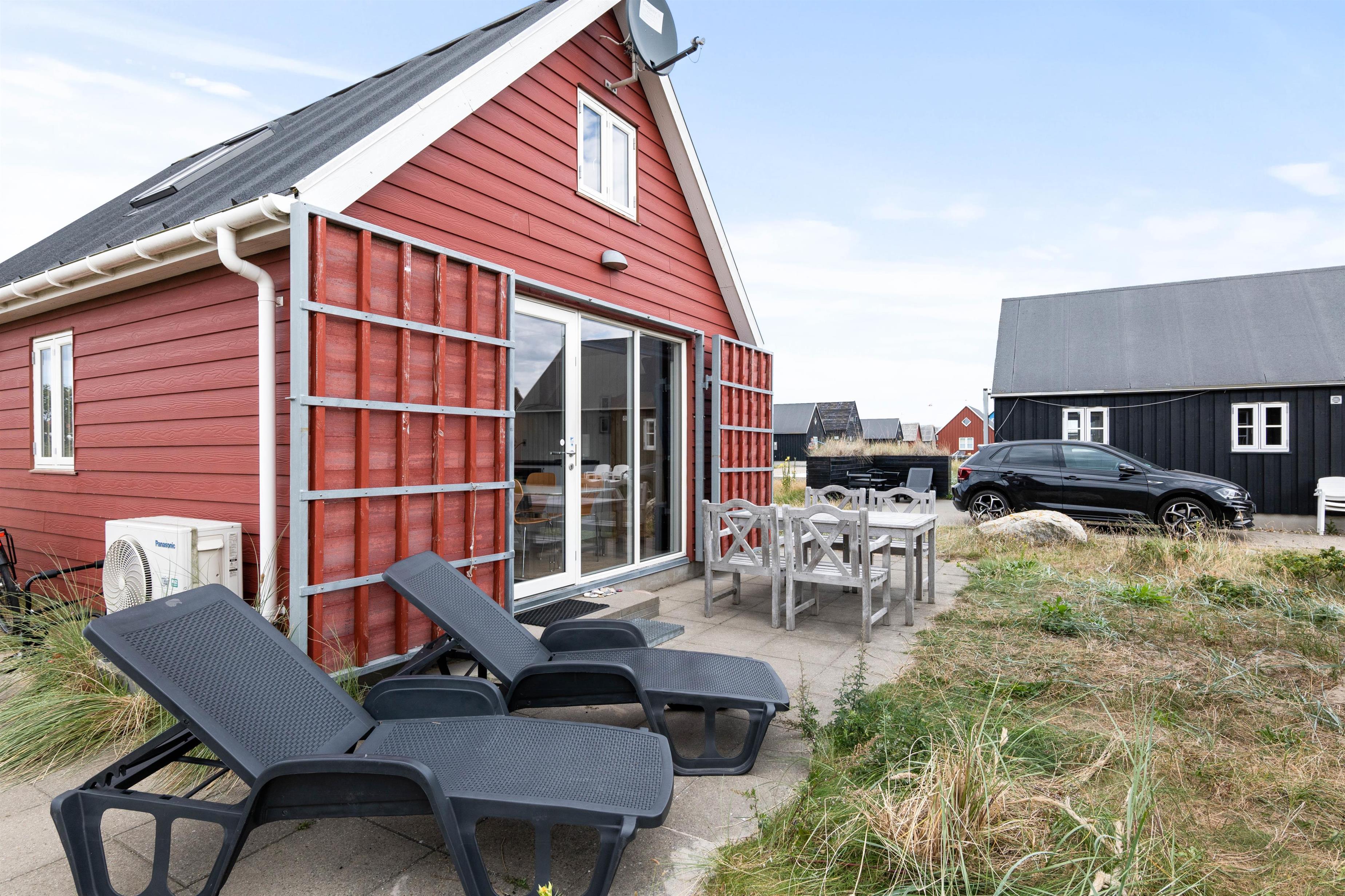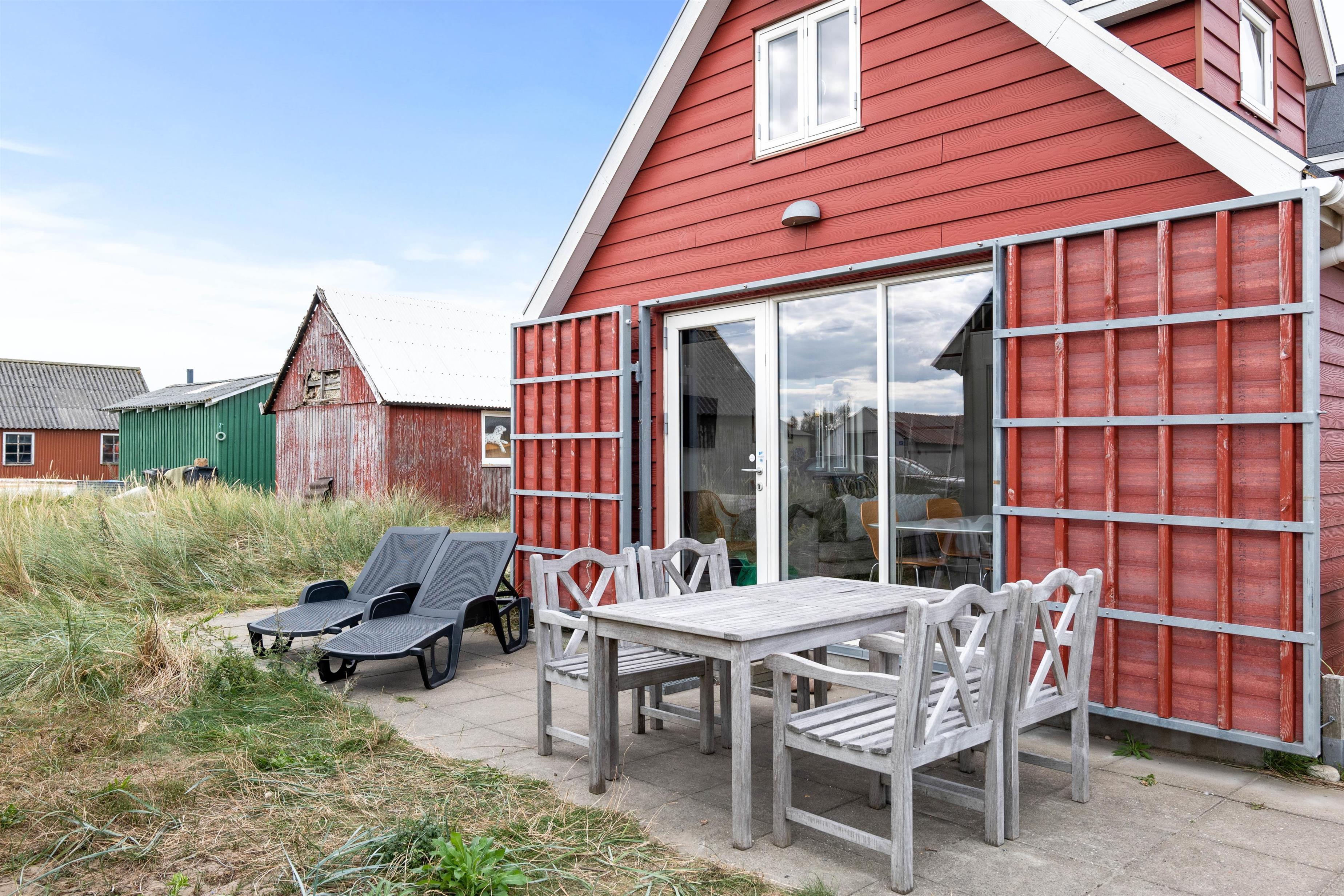 Huset har udgang mod syd til en fin lille terrasse, som er møbleret og her er naturligvis også et par liggestole og en grill til de gode sommeraftner. Findes der noget bedre, end at sidde på terrassen med familie eller venner, – et glas køligt hvidvin og friskfanget fisk på grillen? Det skulle da lige være en slentretur i de skønne omgivelser, en snak med de lokale fiskere på havnen, og tur på stranden ved solnedgang med det smukke Vesterhav som baggrund.