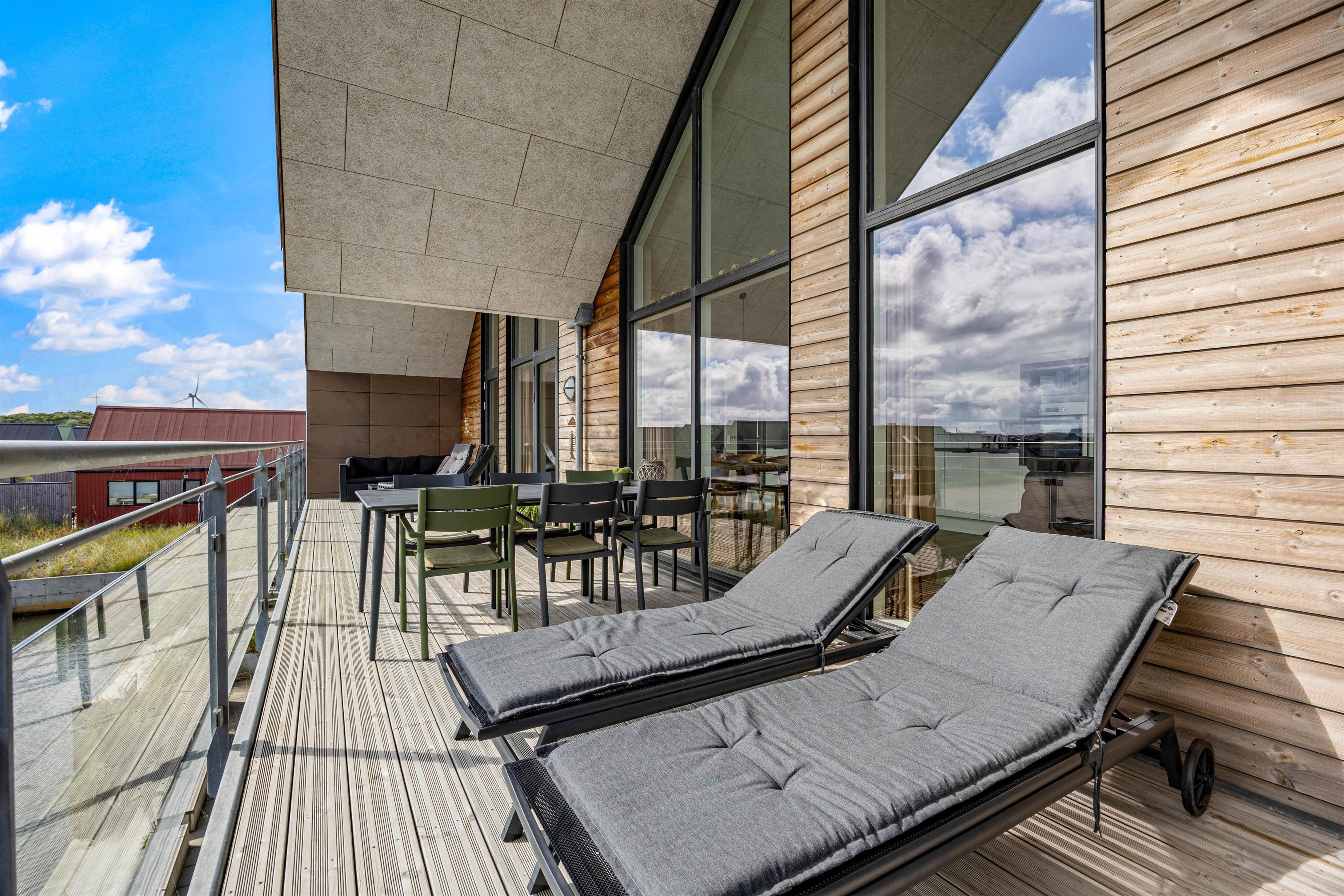 Den skønne feriebolig fuldendes af en stor, sydvendt terrasse, som både har afskærmning og overdækning. Fra terrassen har I udsigt til Ringkøbing Fjord, og dagens første kop kaffe kommer kun til at smage bedre af, at den drikkes med fjorden i baggrunden, der bliver oplyst af den lave morgensol.