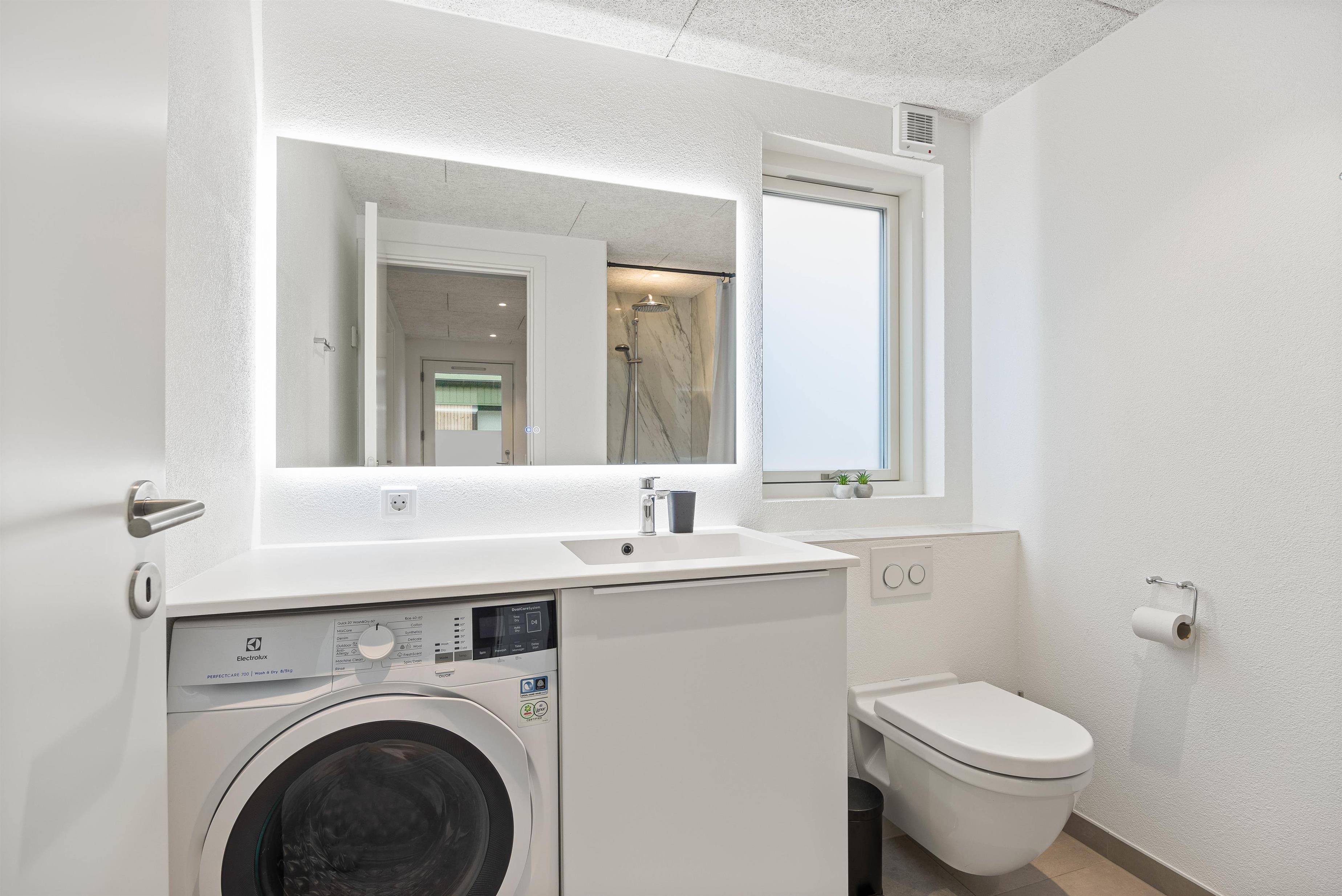 I sommerhuset er der installeret gulvvarme på både badeværelset og i køkkenalrummet, som sørger for at holde en tilpas temperatur i rummene. Desuden er der også vaskemaskine og tørretumbler til fri benyttelse.