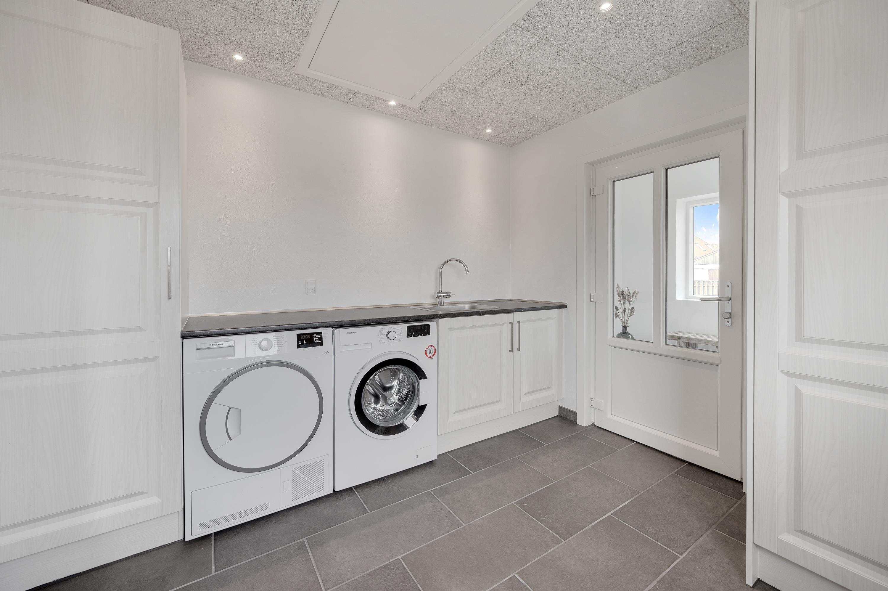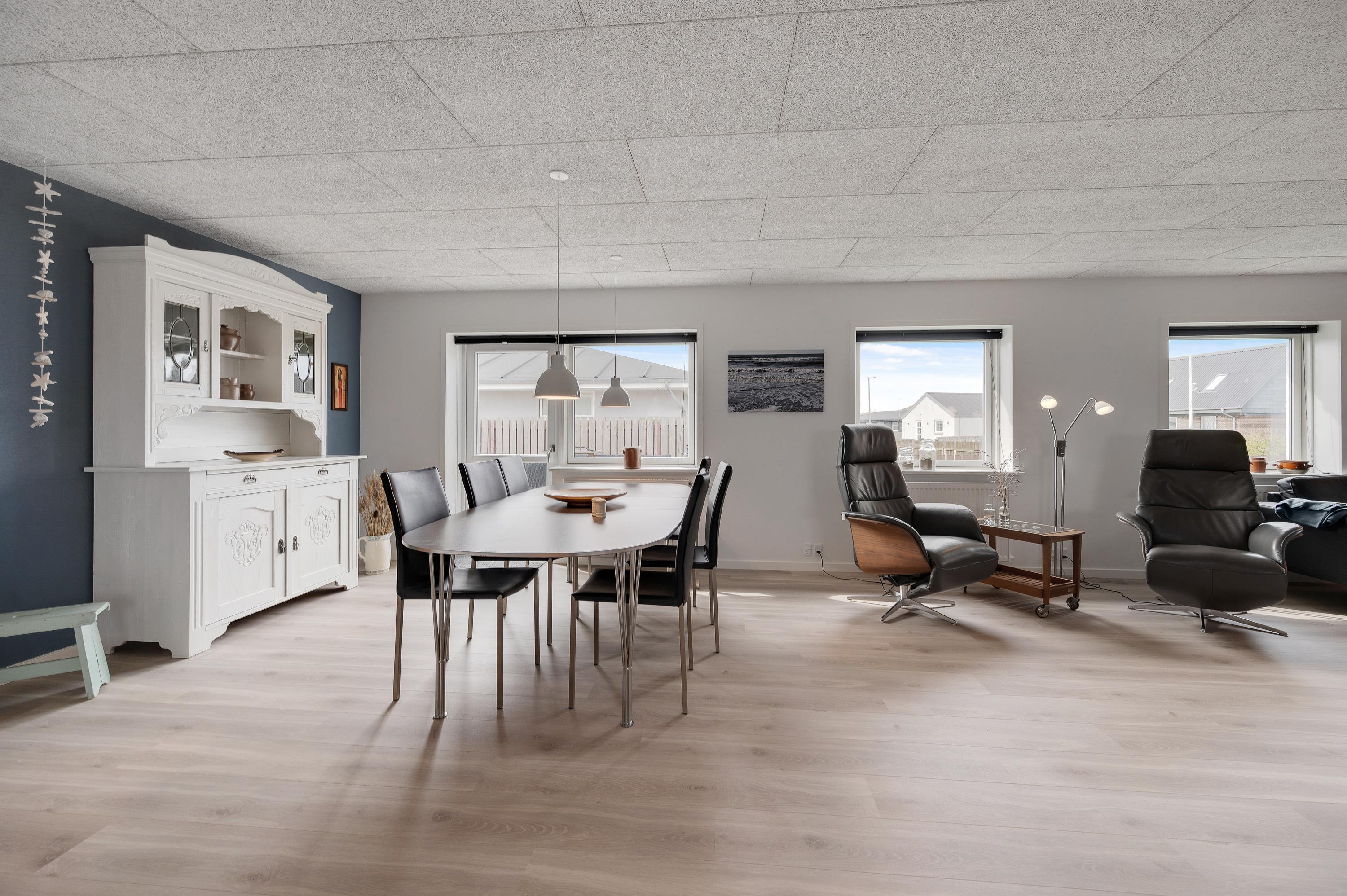 Feriehuset har så sent som i 2021 gennemgået en renovering, og overalt hersker flotte, moderne omgivelser. Som det første bliver I mødt af en god og rummelig entré, hvor der er fin plads til både fodtøj og overtøj. Fra entréen er der indgang til køkkenet, der ligger i åben tilgang til stuen. Det flotte gulv og de lyse vægge og lofter giver et venligt indtryk og danner rammerne for hyggeligt samvær i dejlige omgivelser.