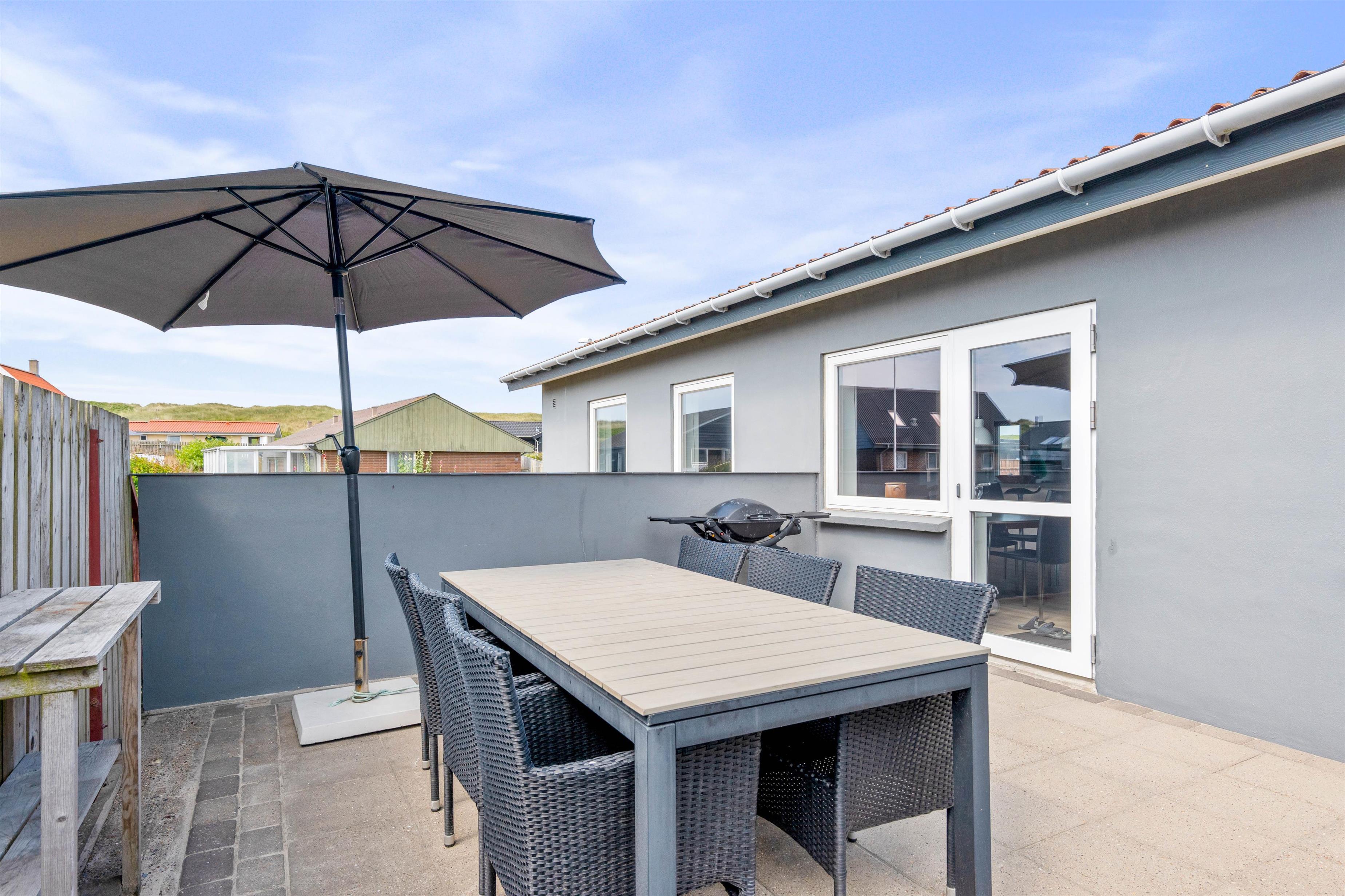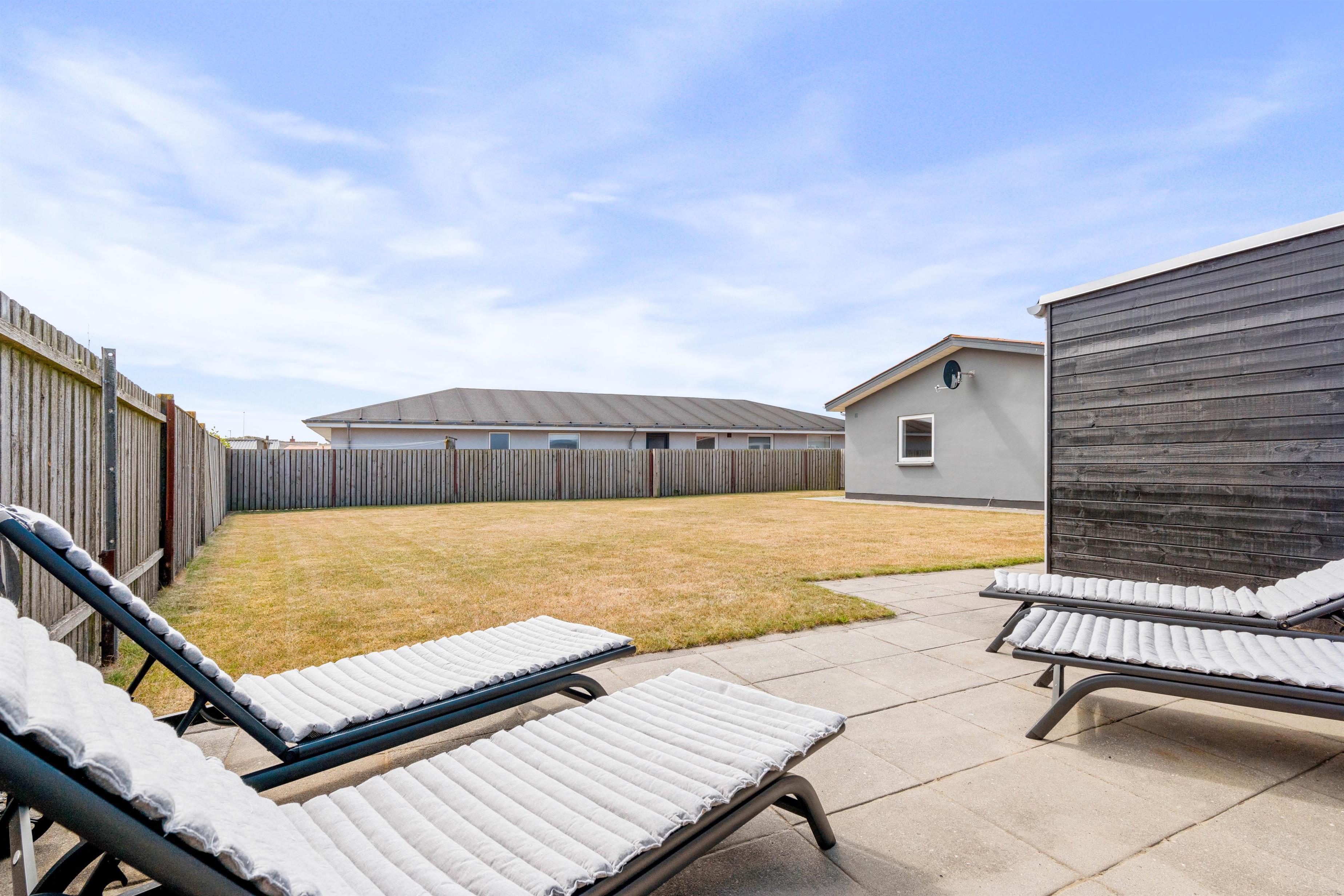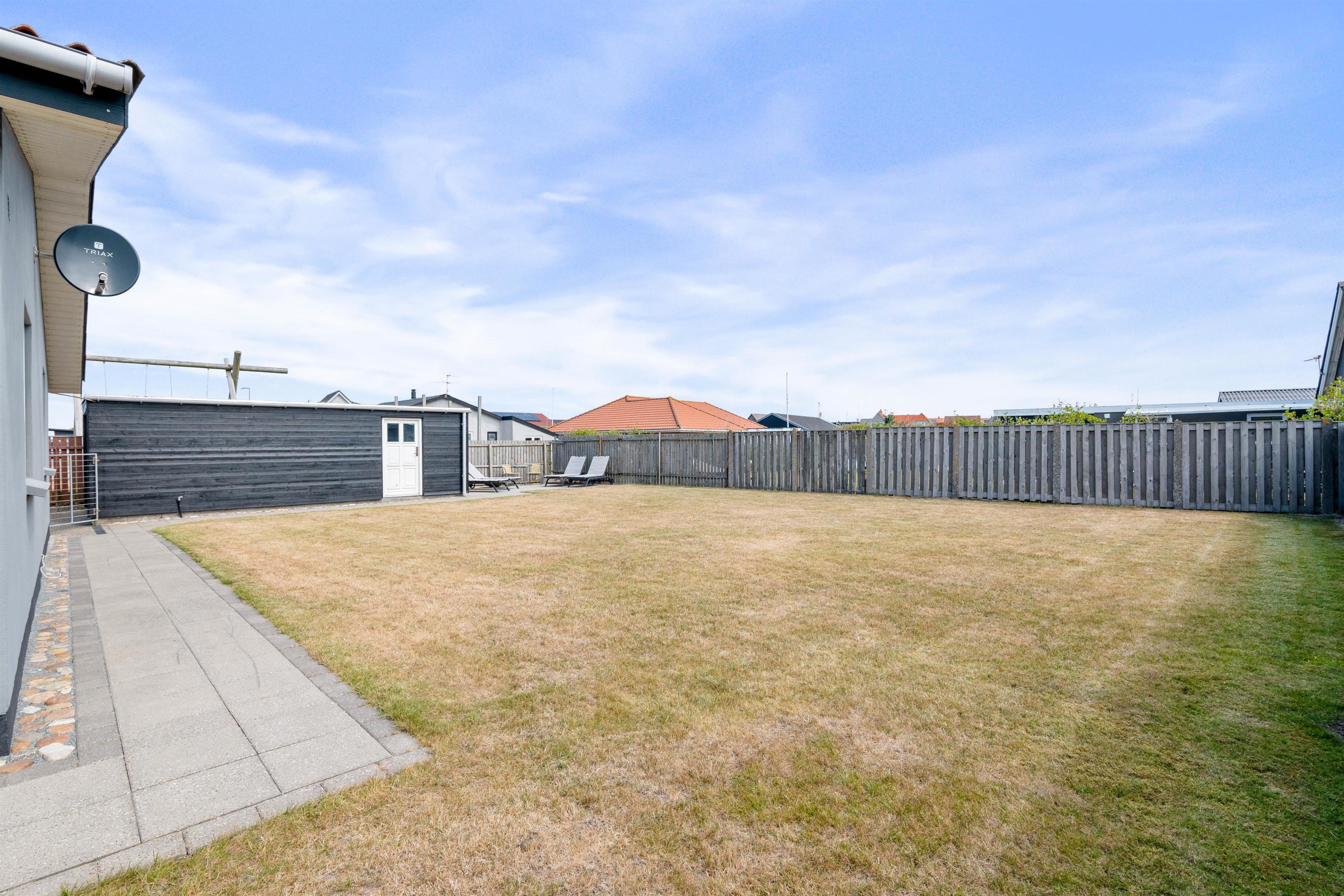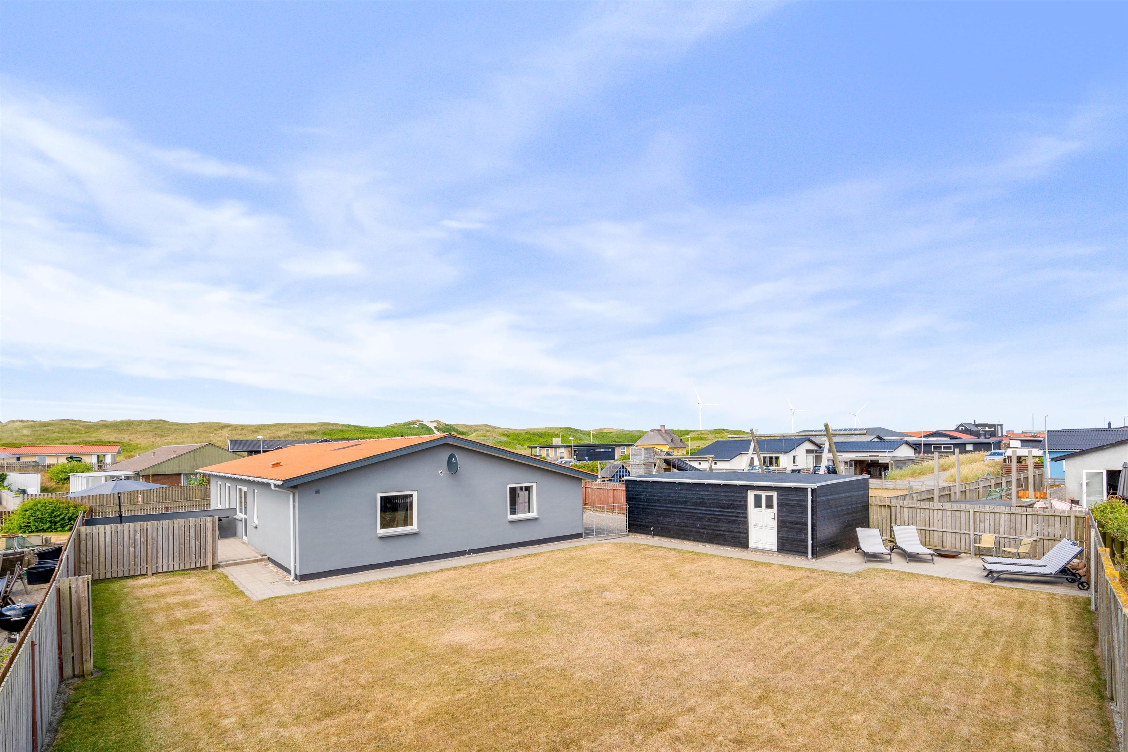 Feriehuset er placeret på en indhegnet plænegrund, så I kan ugeneret hygge jer udenfor med leg og boldspil. Den sydvestvendte terrasse indbyder til grill og aftenhygge med udsigt til smukke solnedgange, der også kan nydes fra 1. række på stranden, efter en gåtur på bare 150 meter.