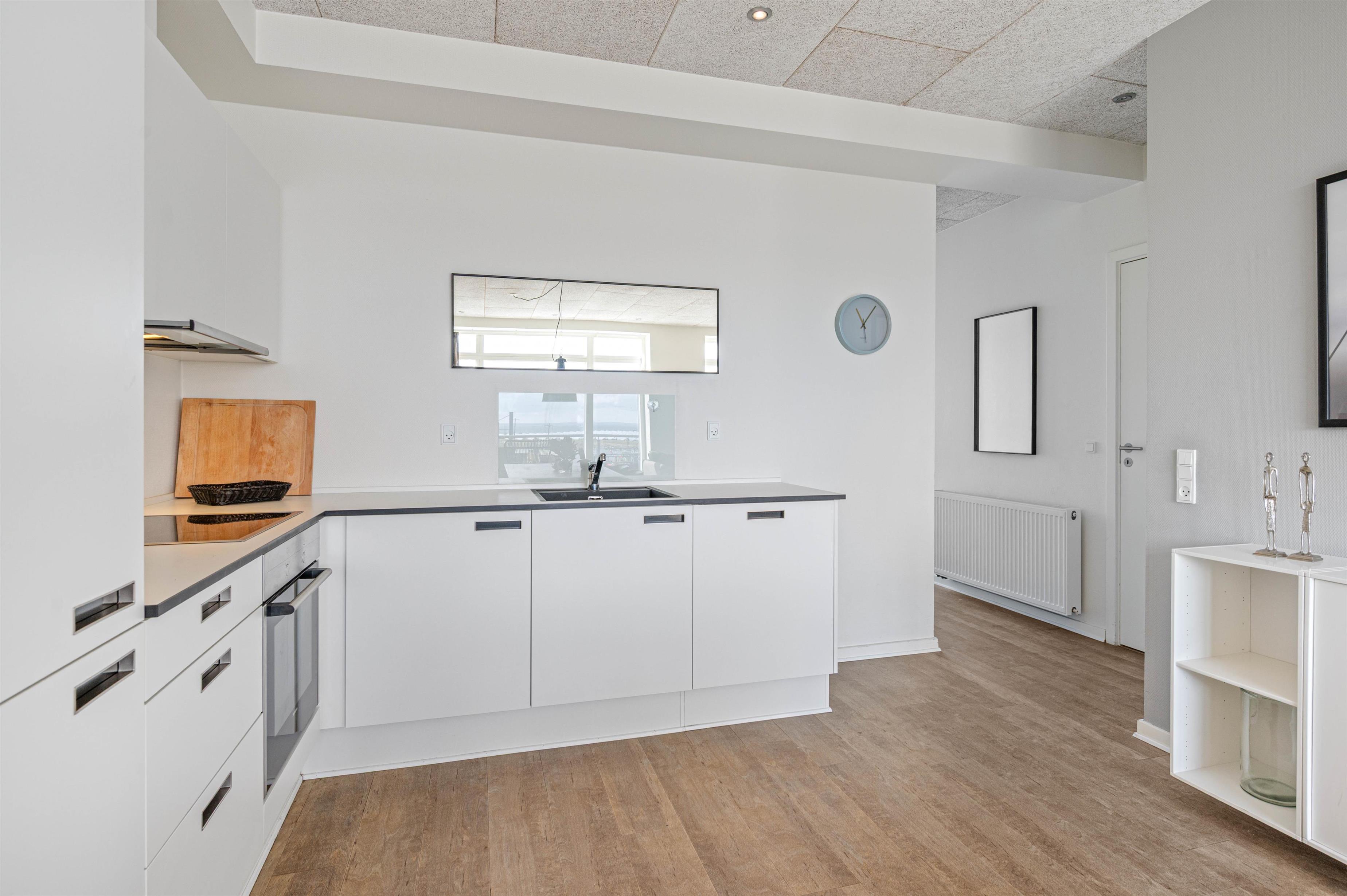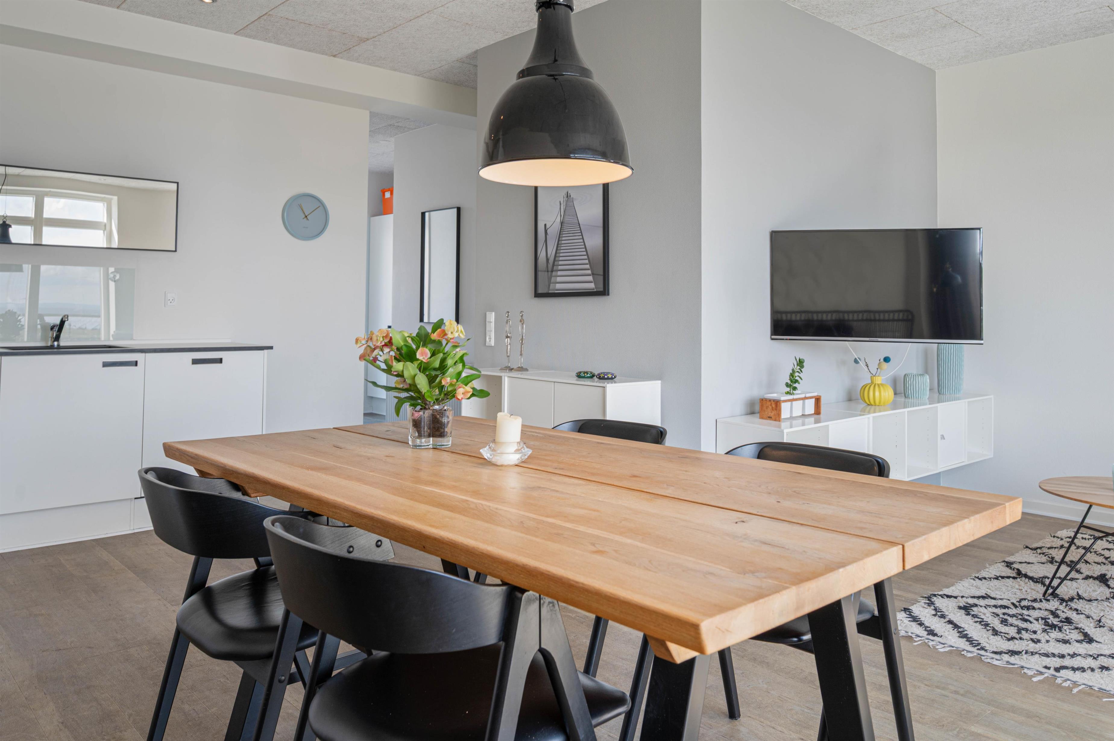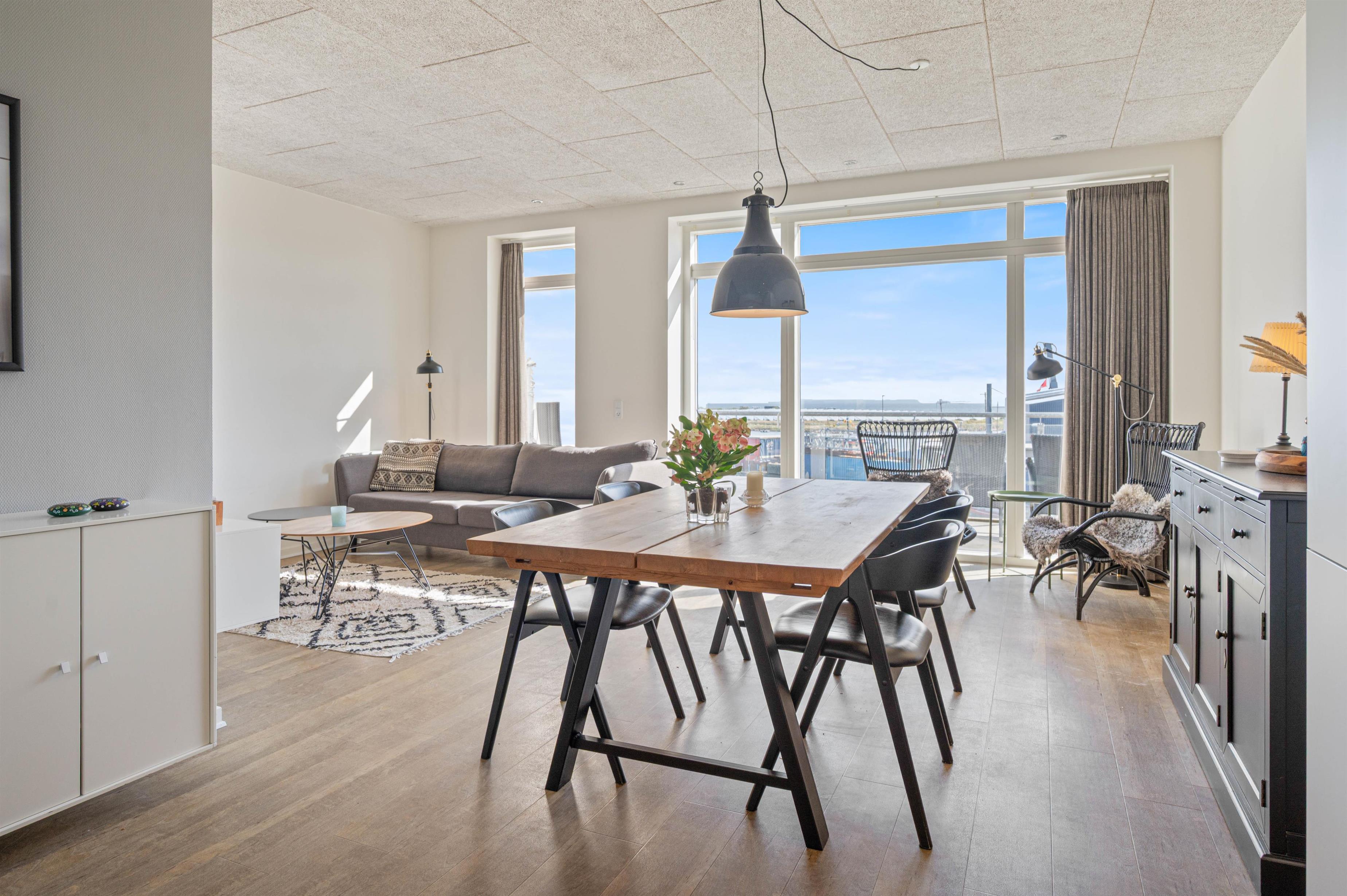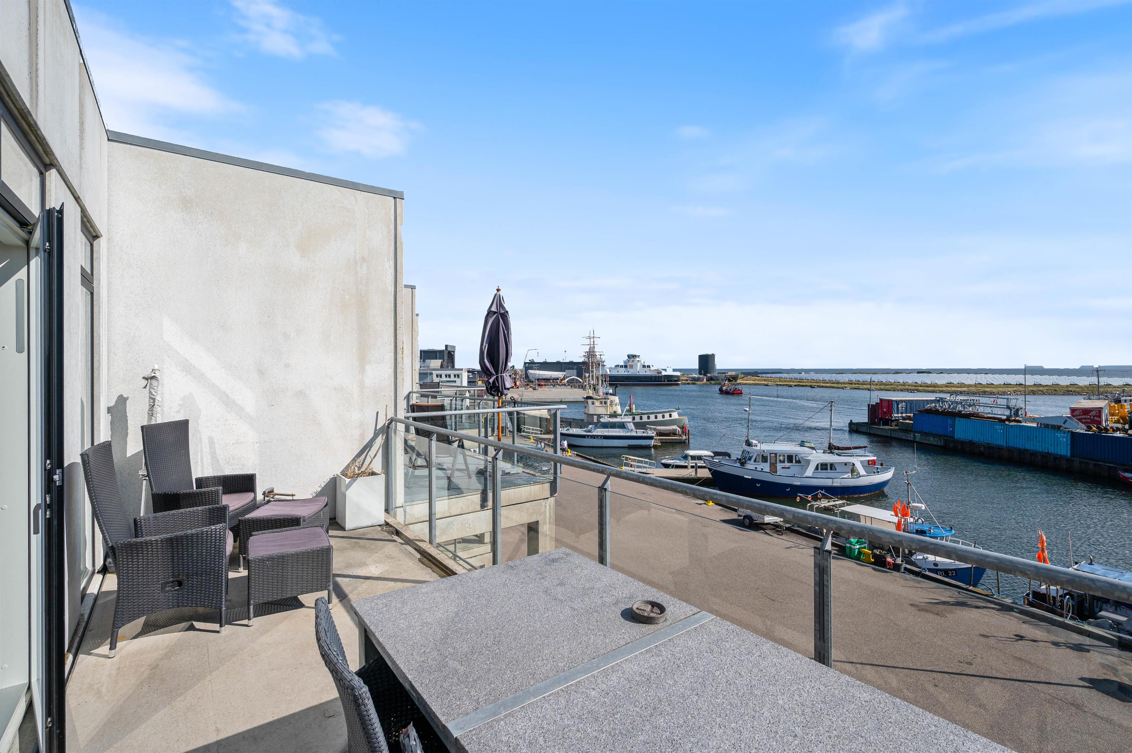 Fra den flotte stue er der udgang til den østvendte terrasse, som giver jer en fantastisk udsigt ud over den charmerende fjordhavn, som har en helt speciel atmosfære med de små fiskekuttere, der lægger til ved kajen. Der er også en lille vestvendt terrasse ved indgangen, så I kan følge solen rundt hele dagen.