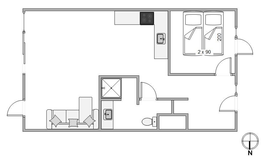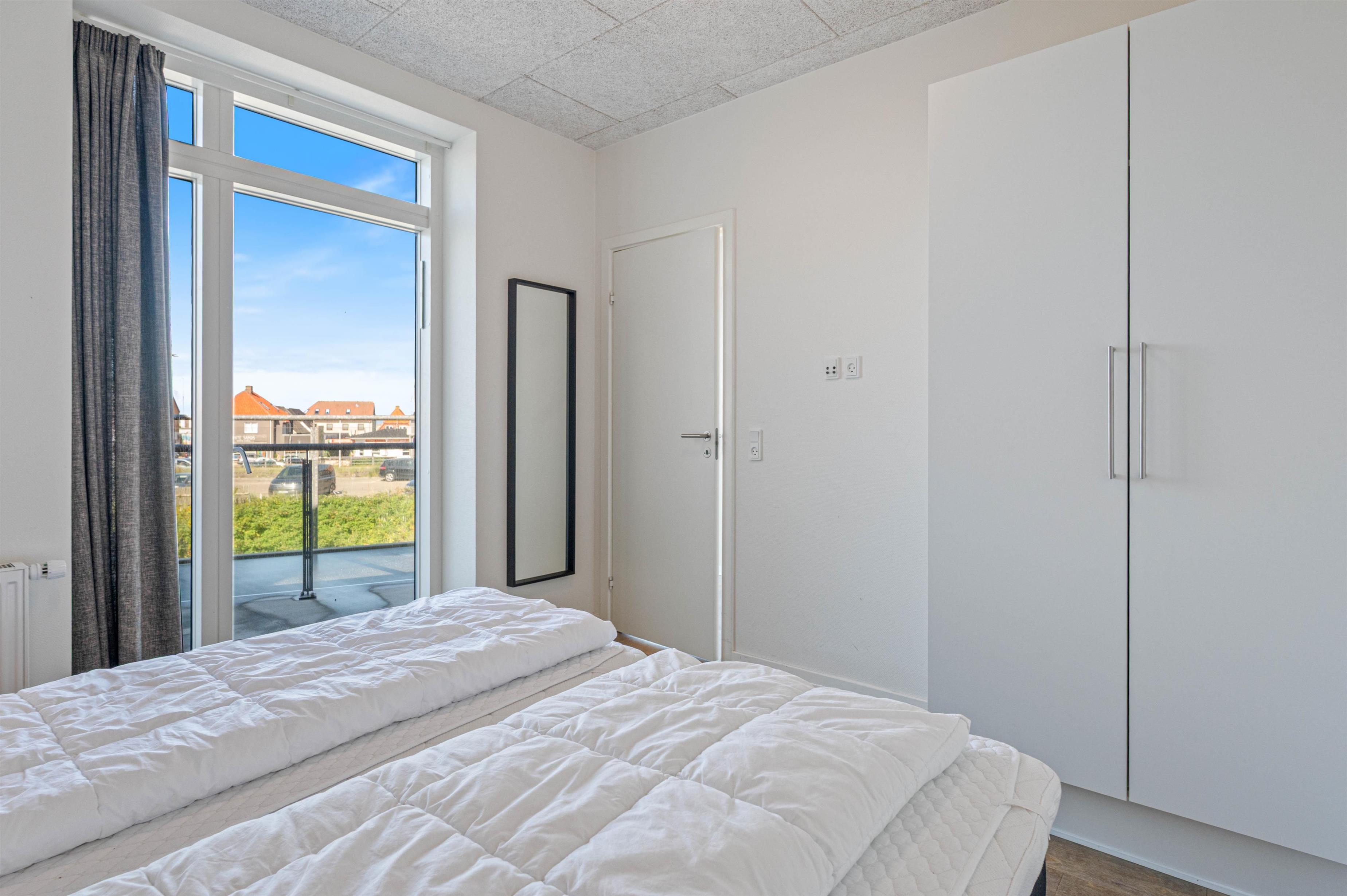 Lejligheden har 1 soverum med dobbeltseng - og så er der 2 sovepladser i stuen, hvor sofaen kan slås ud til en dobbelt soveplads.
