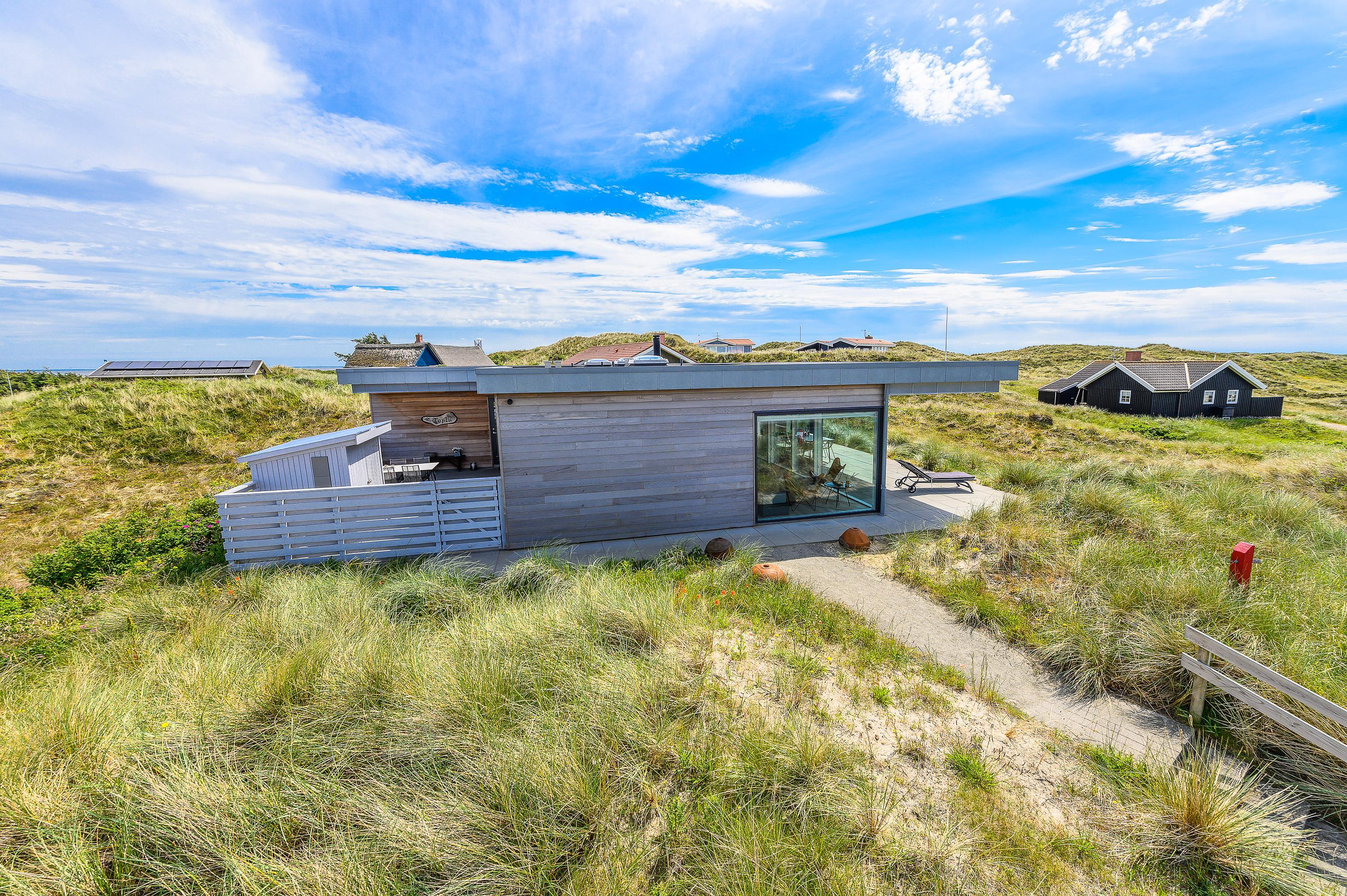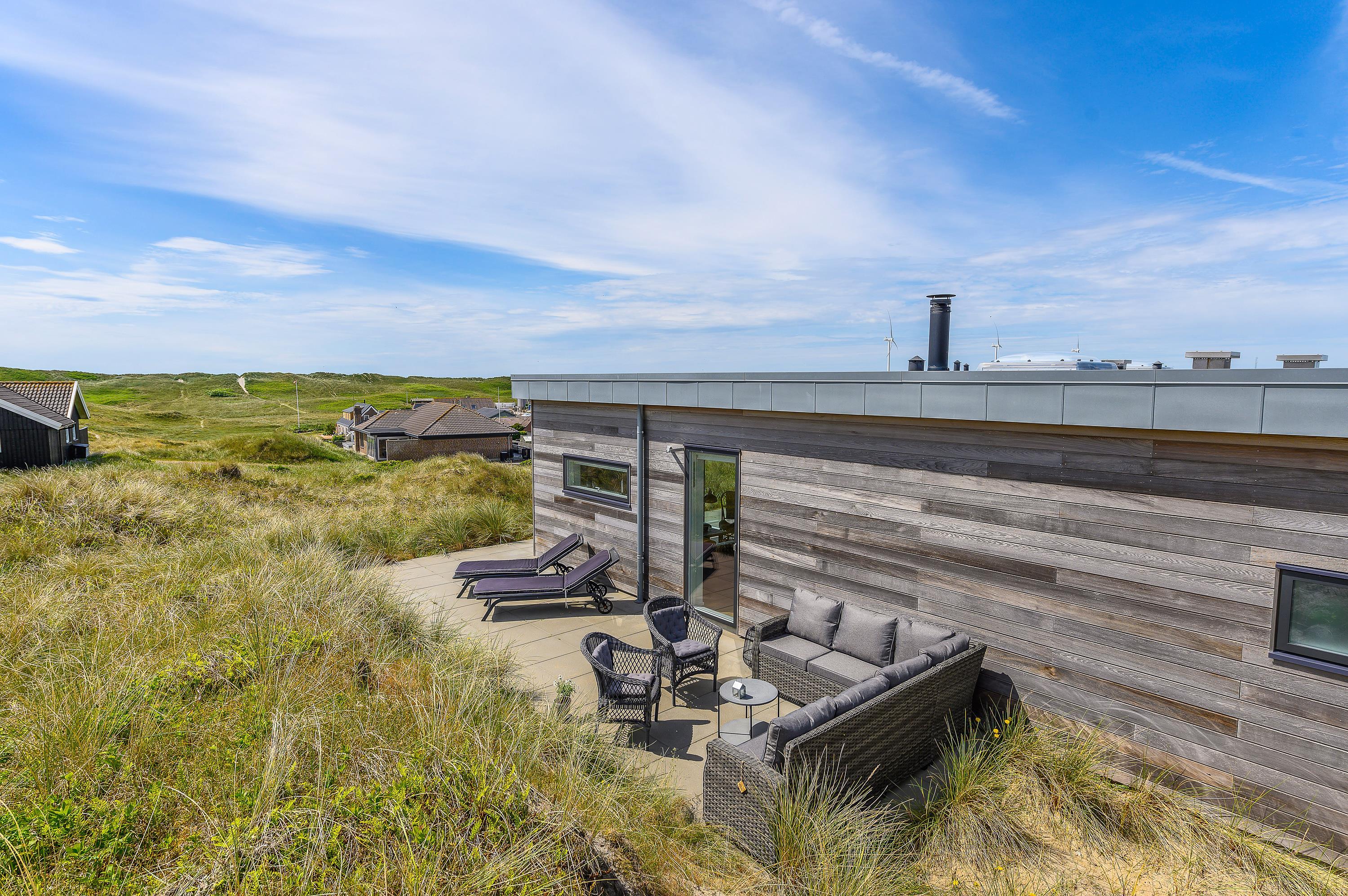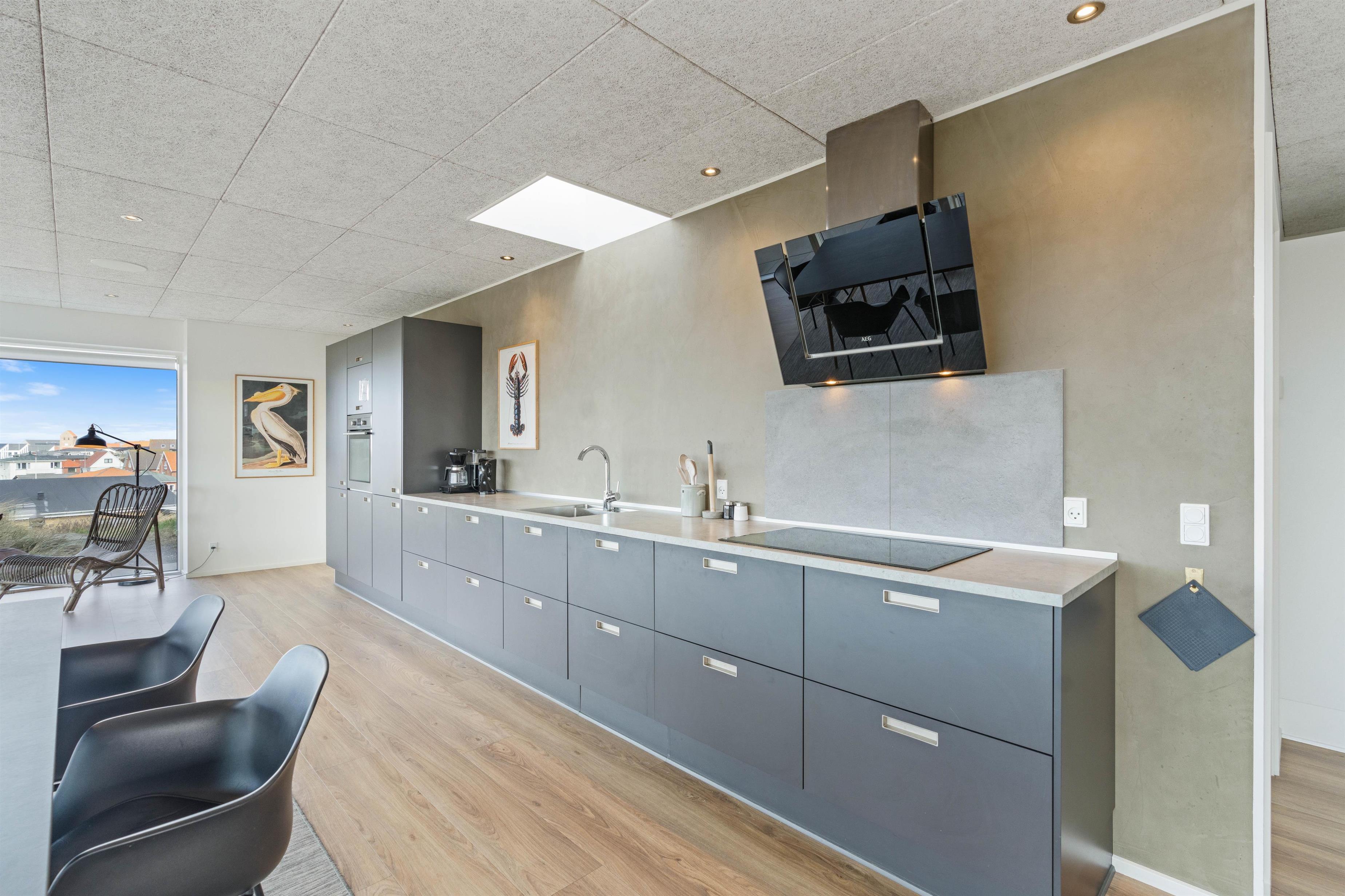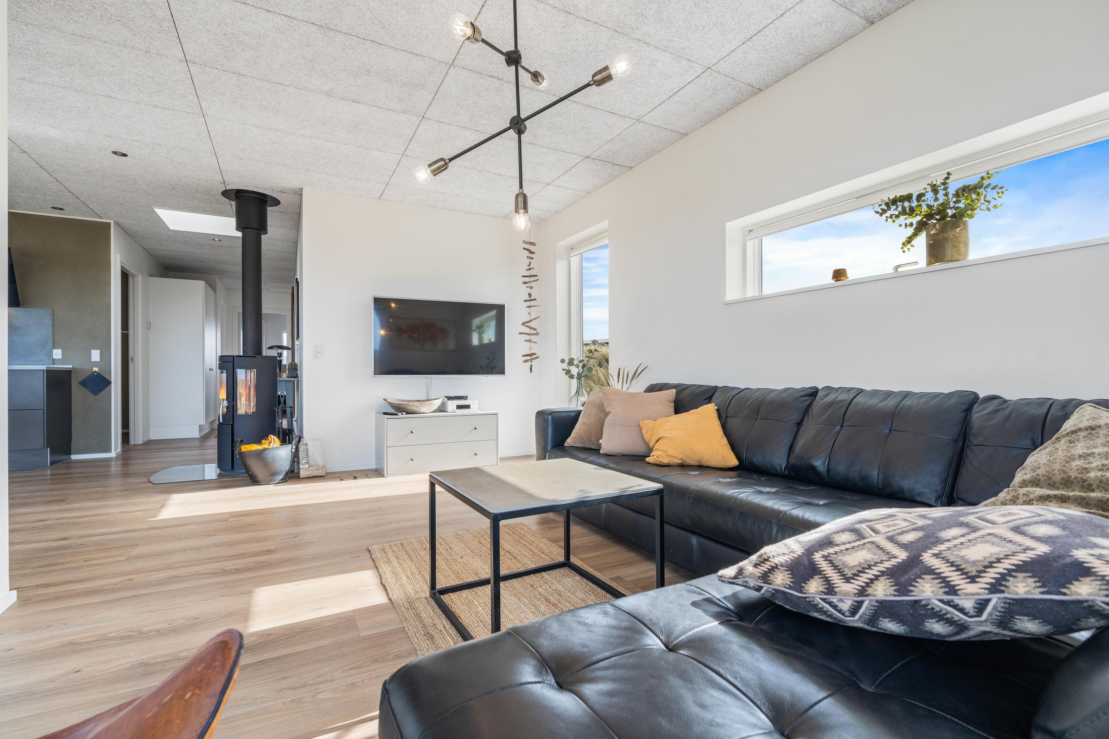 Med dette feriehus er der garanti for velvære og skønne naturoplevelser. Fra opholdsrummet med køkken, spisestue og stue i ét, er der et fantastisk view udover sommerhusområdet og klitlandskabet igennem de store panoramavinduer mod vest. De både giver et rigtig dejligt lys til rummet – og samtidigt tager de naturen med helt ind i stuen – her mærker I virkeligt, at I bor på toppen af en klit – og med udsigt til andre klitter.