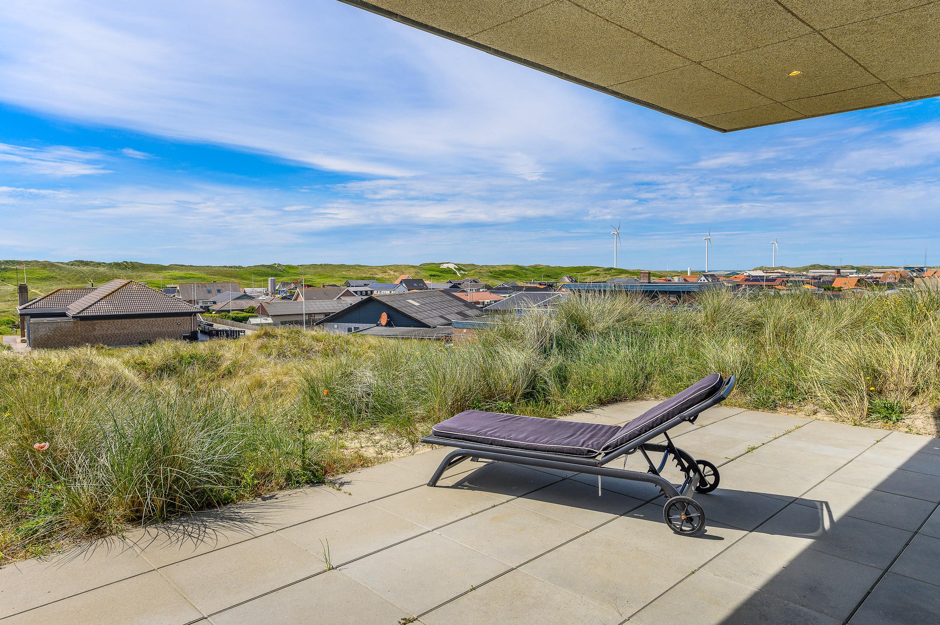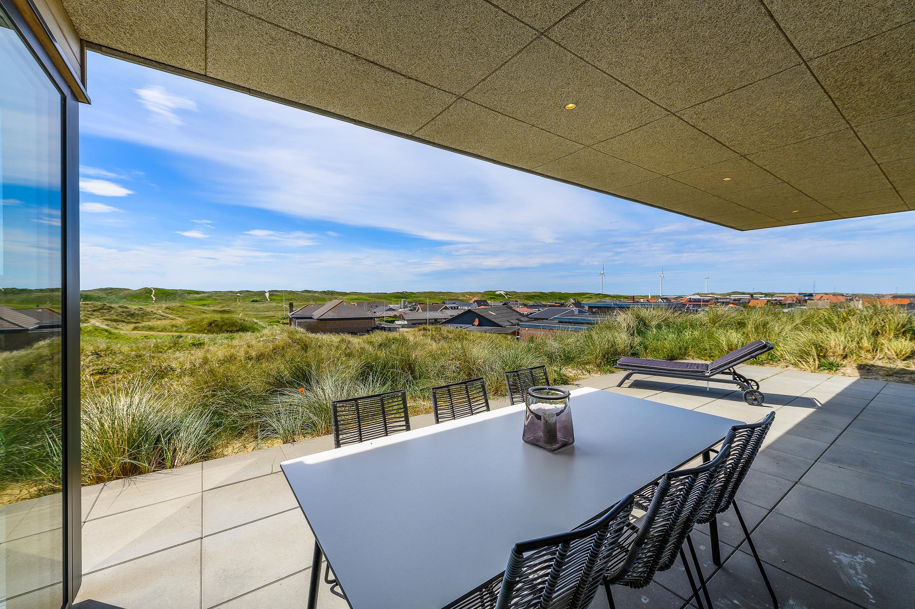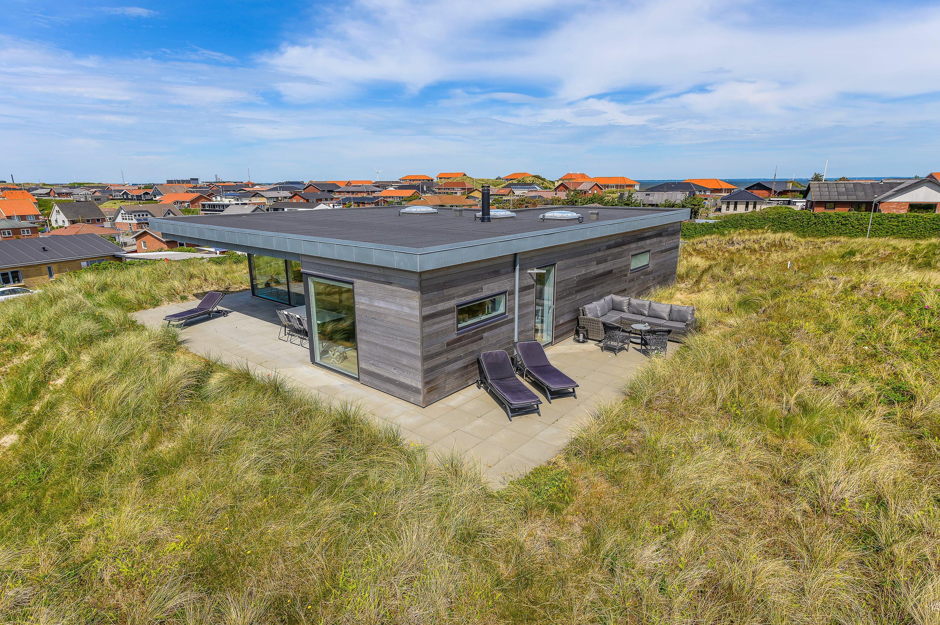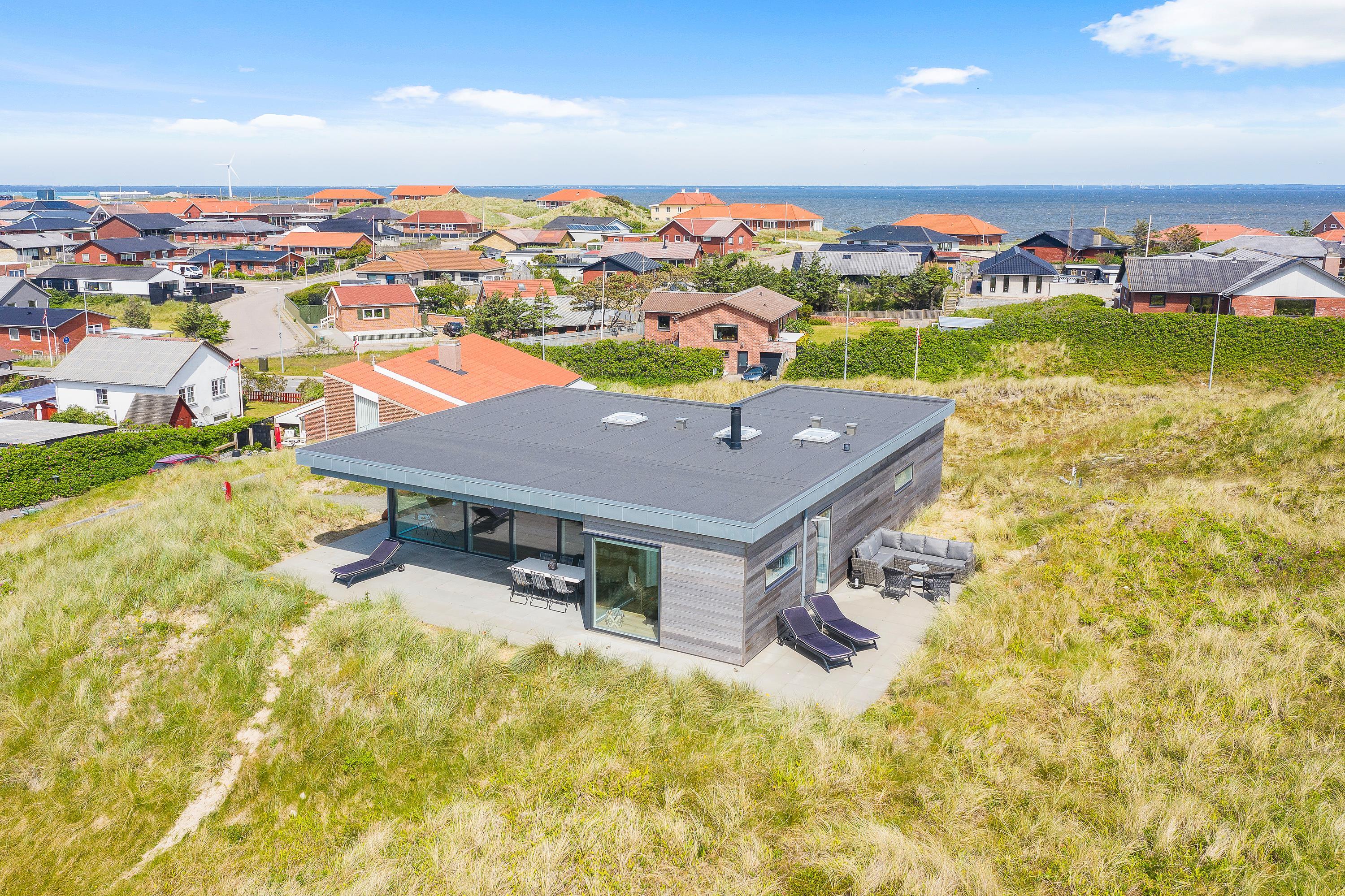 Med dette feriehus er der garanti for velvære og skønne naturoplevelser. Fra opholdsrummet med køkken, spisestue og stue i ét, er der et fantastisk view udover sommerhusområdet og klitlandskabet igennem de store panoramavinduer mod vest. De både giver et rigtig dejligt lys til rummet – og samtidigt tager de naturen med helt ind i stuen – her mærker I virkeligt, at I bor på toppen af en klit – og med udsigt til andre klitter.