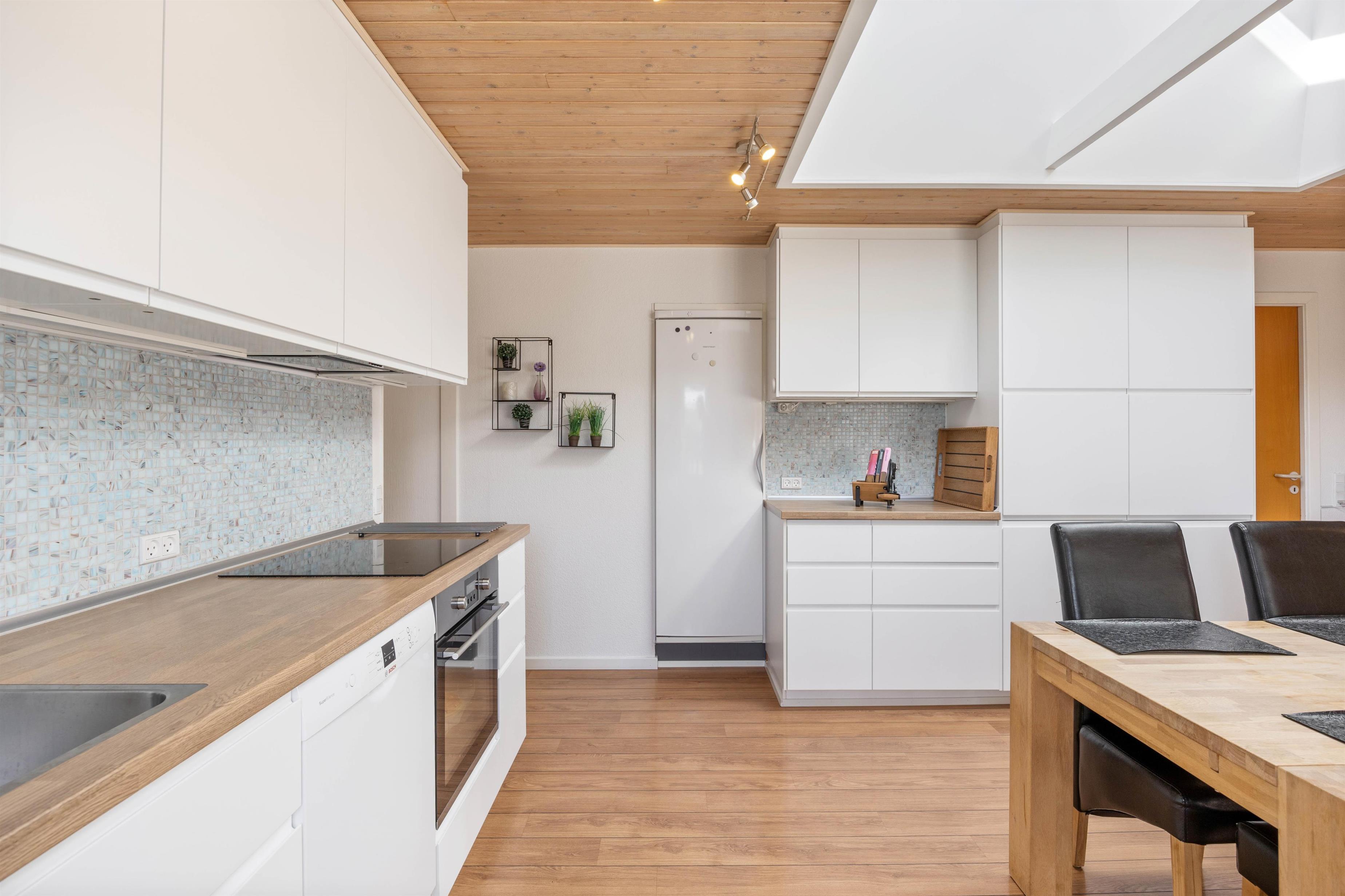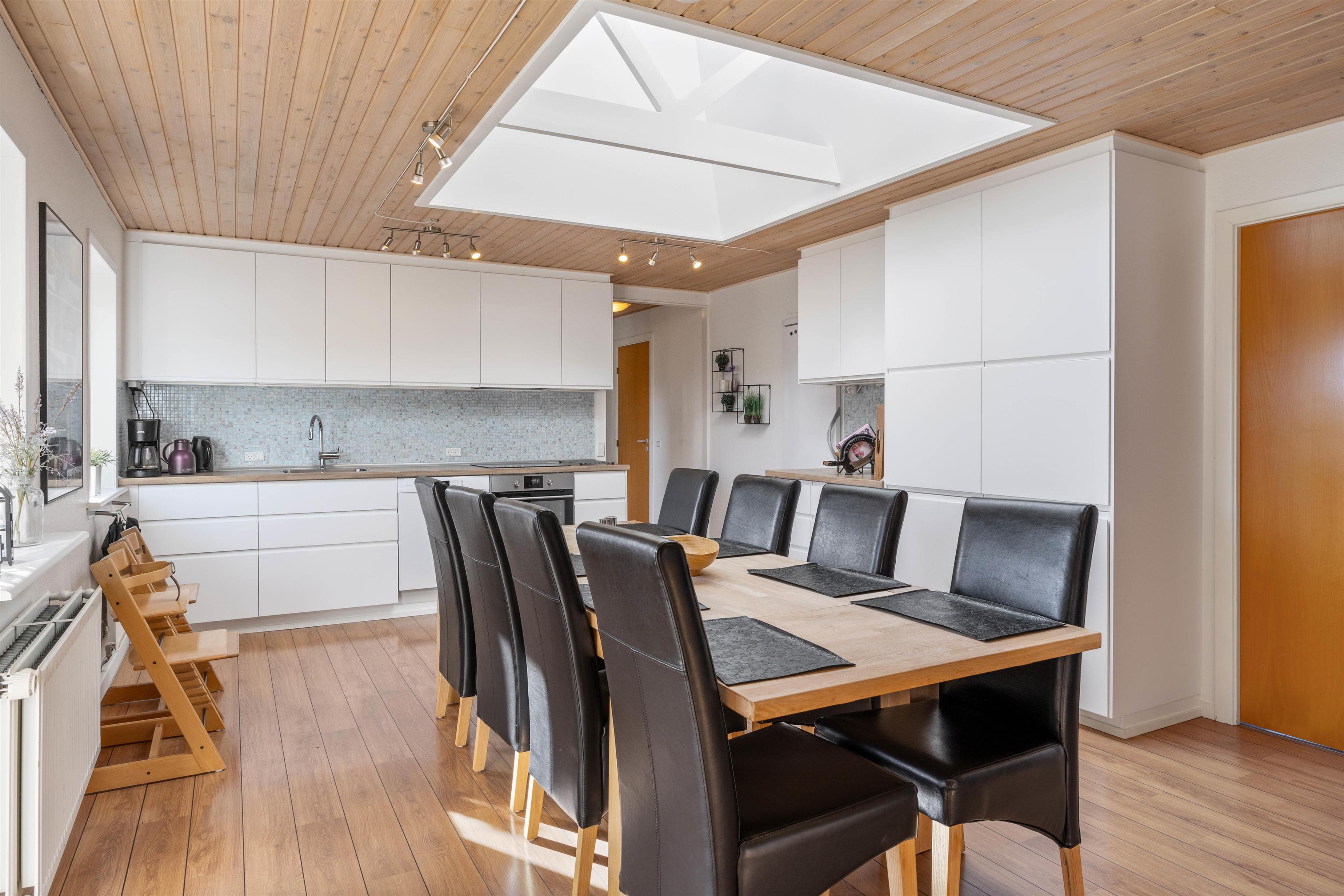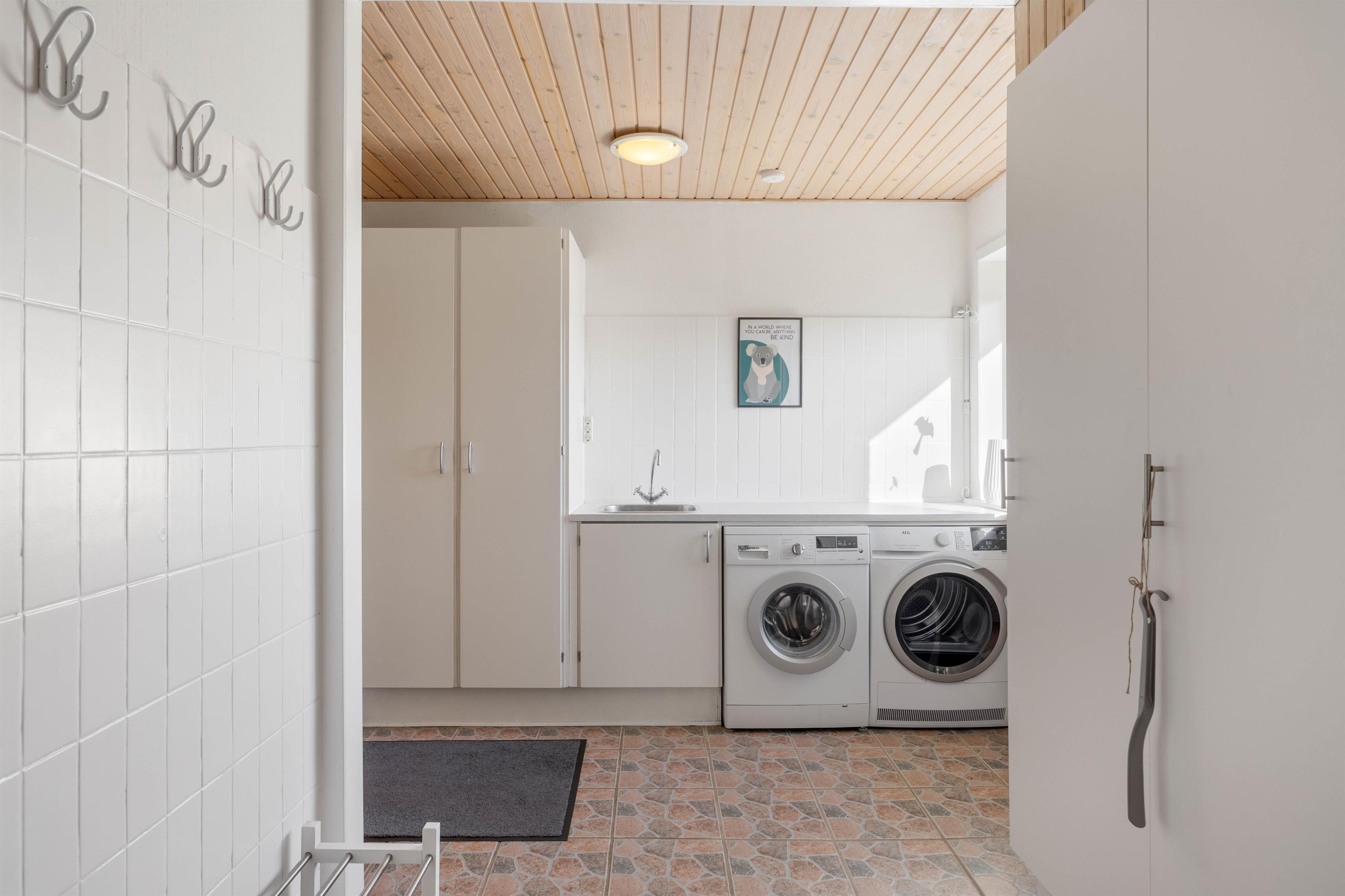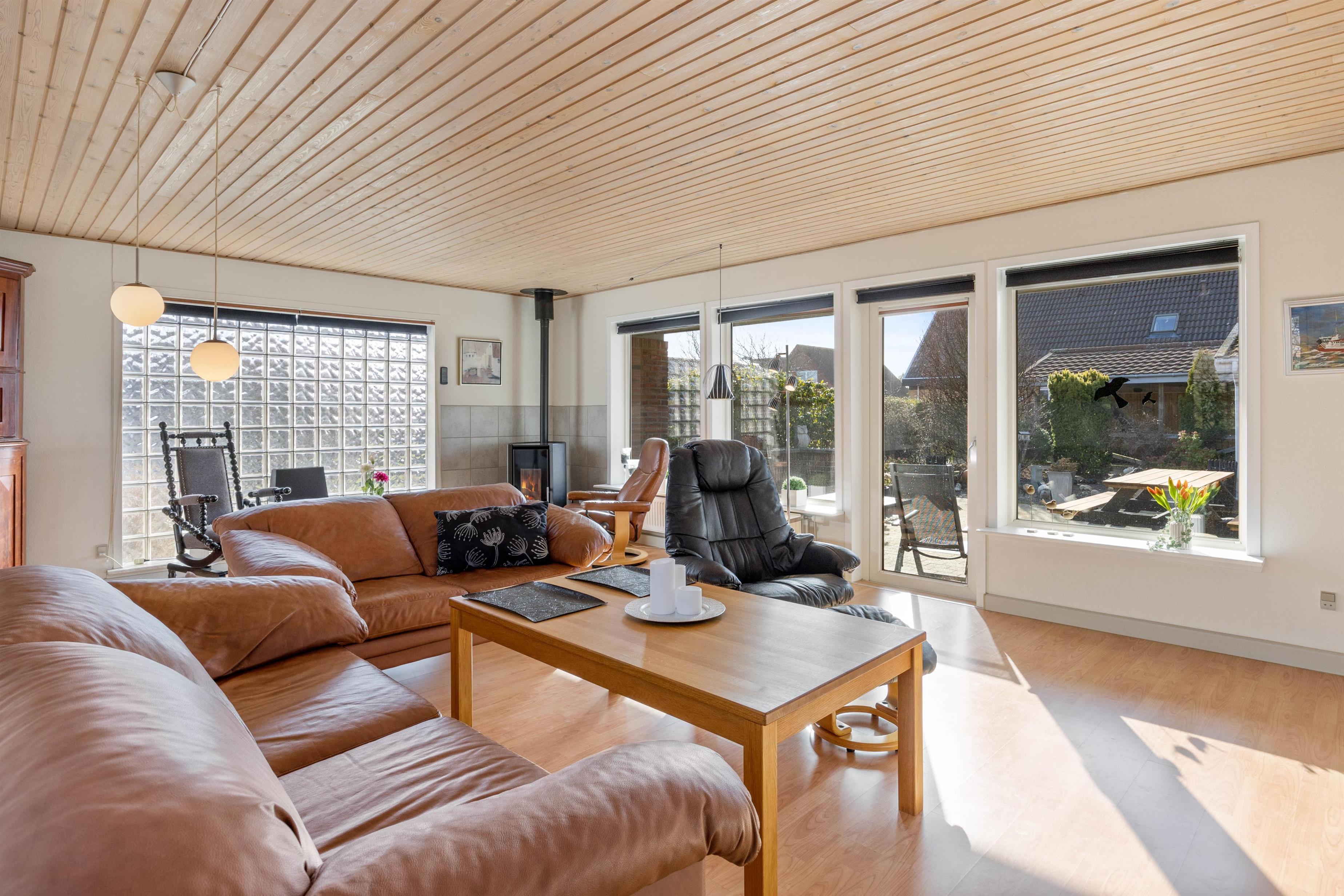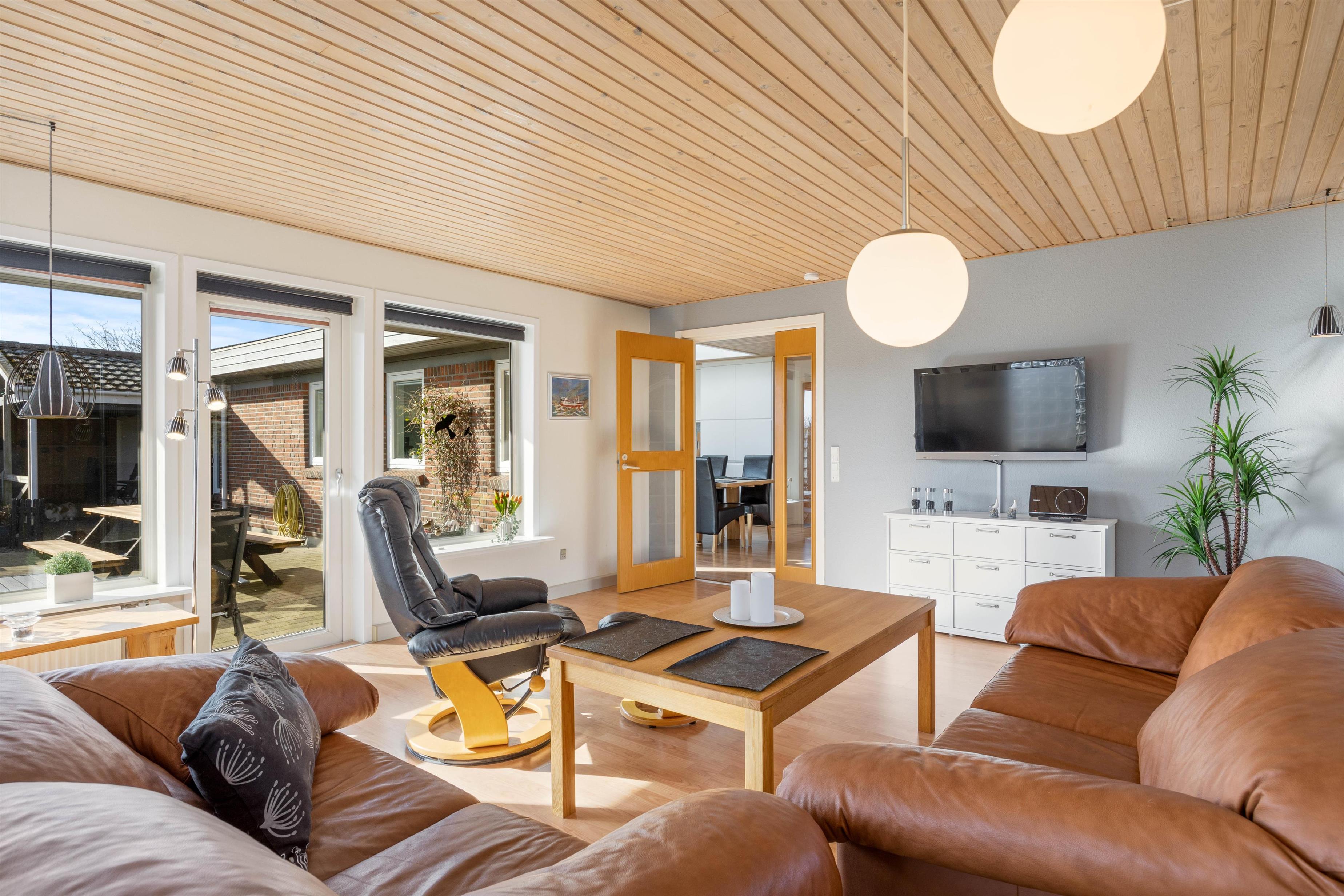 Stuen er desuden et stort, lyst rum med mange vinduer og behagelige siddepladser. Her kan du krølle dig sammen med et tæppe på sofaen sammen med din yndlingsbog, mens du kan høre træet knitre i brændeovnen i baggrunden. Der er 3 store soveværelser med dobbeltsenge til rådighed, hvor I alle kan få en god nats søvn. For at I kan starte dagen i ro og mag og uden stress om morgenen, er der to badeværelser med behagelig gulvvarme i dette feriehus. Derudover sørger husets vaskemaskine og tørretumbler for rent og tørt vasketøj.