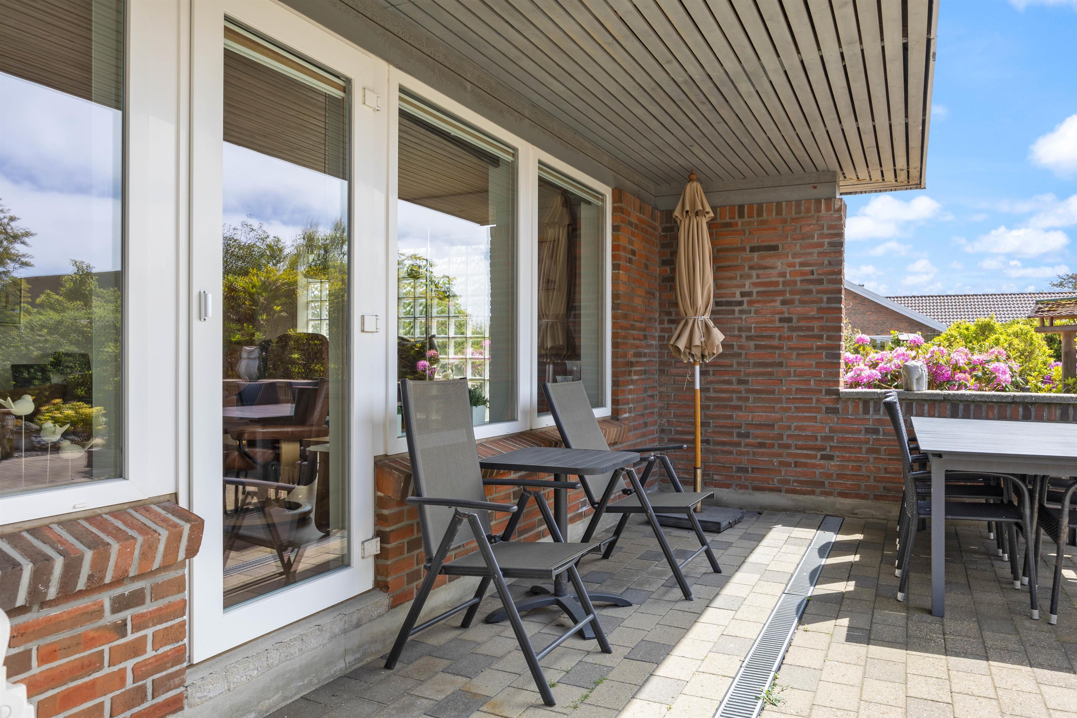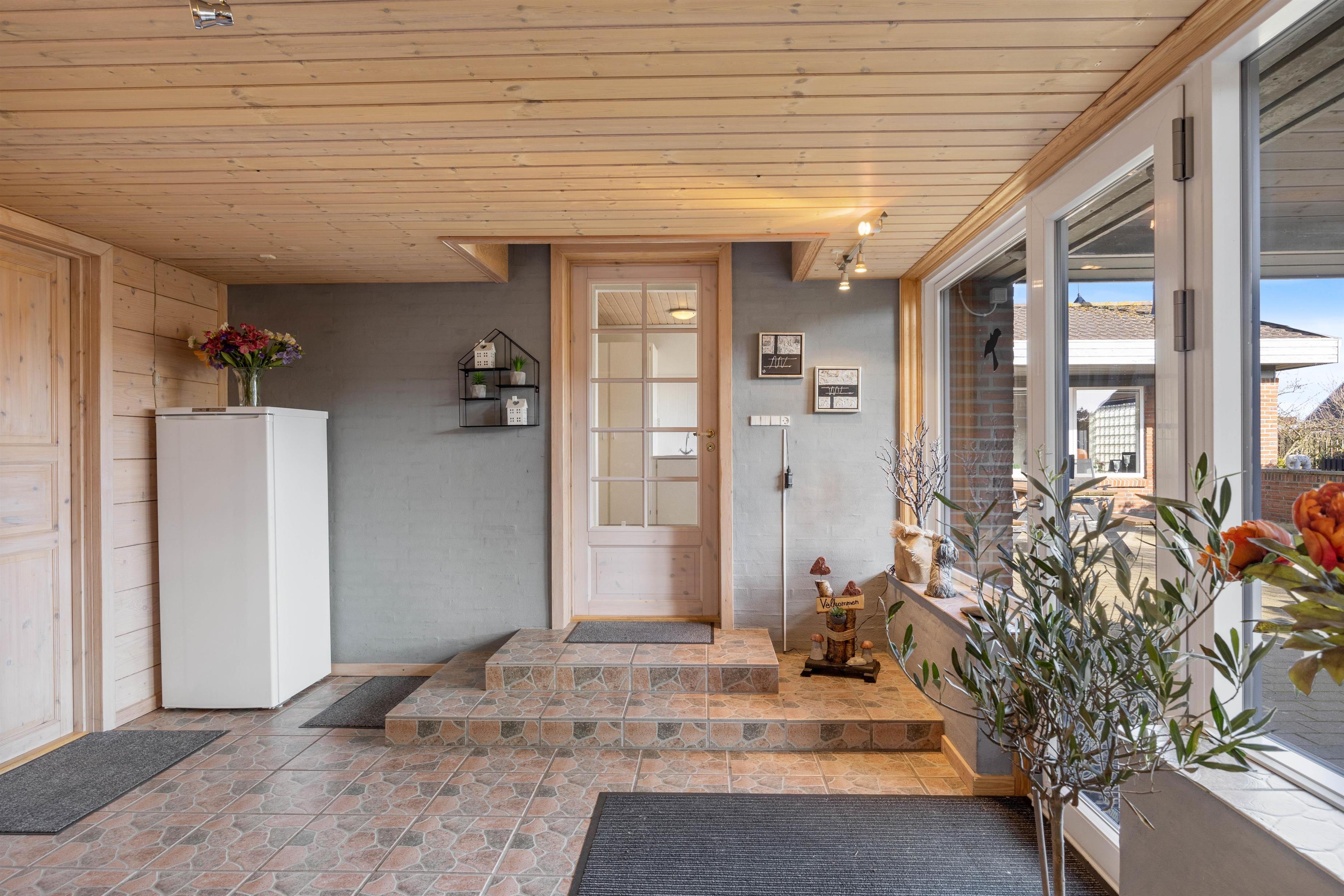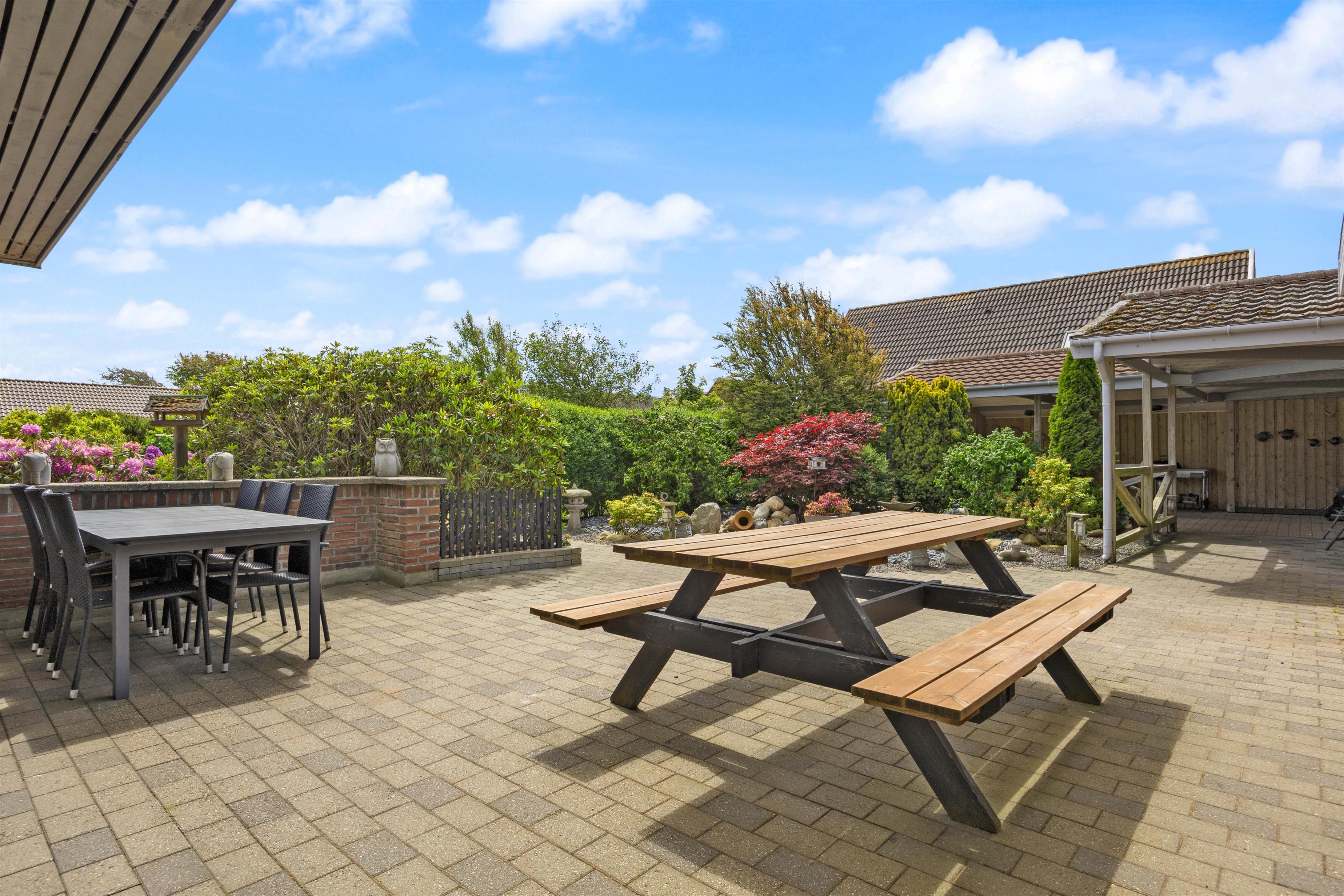 I kan parkere bilen i carporten, og hvis det regner, kan I komme tørt ind i huset fra bilen, idet indgangspartiet er overdækket. Under carporten er også et lille havebord, hvor I kan nyde en kop kaffe om morgenen.