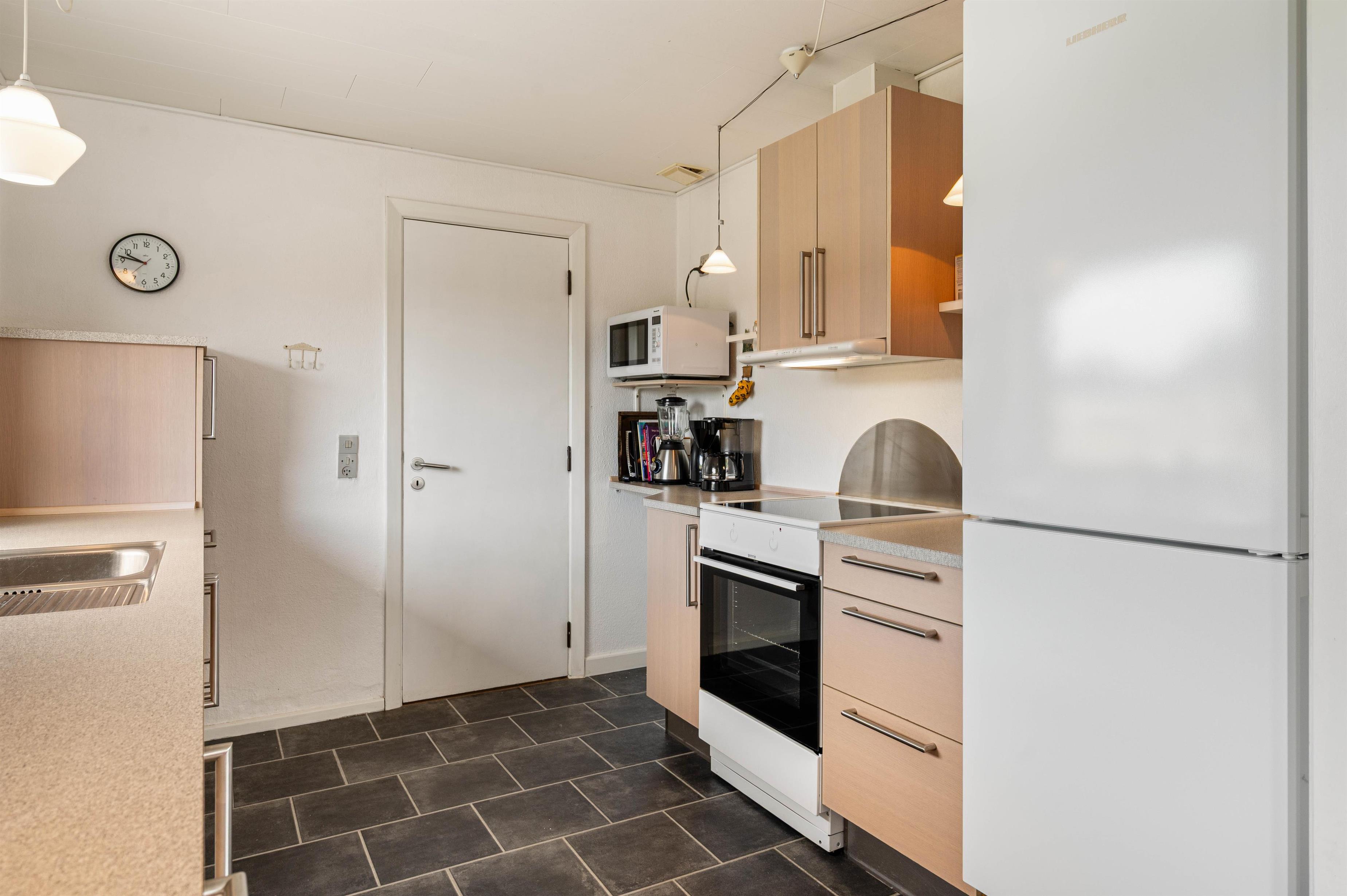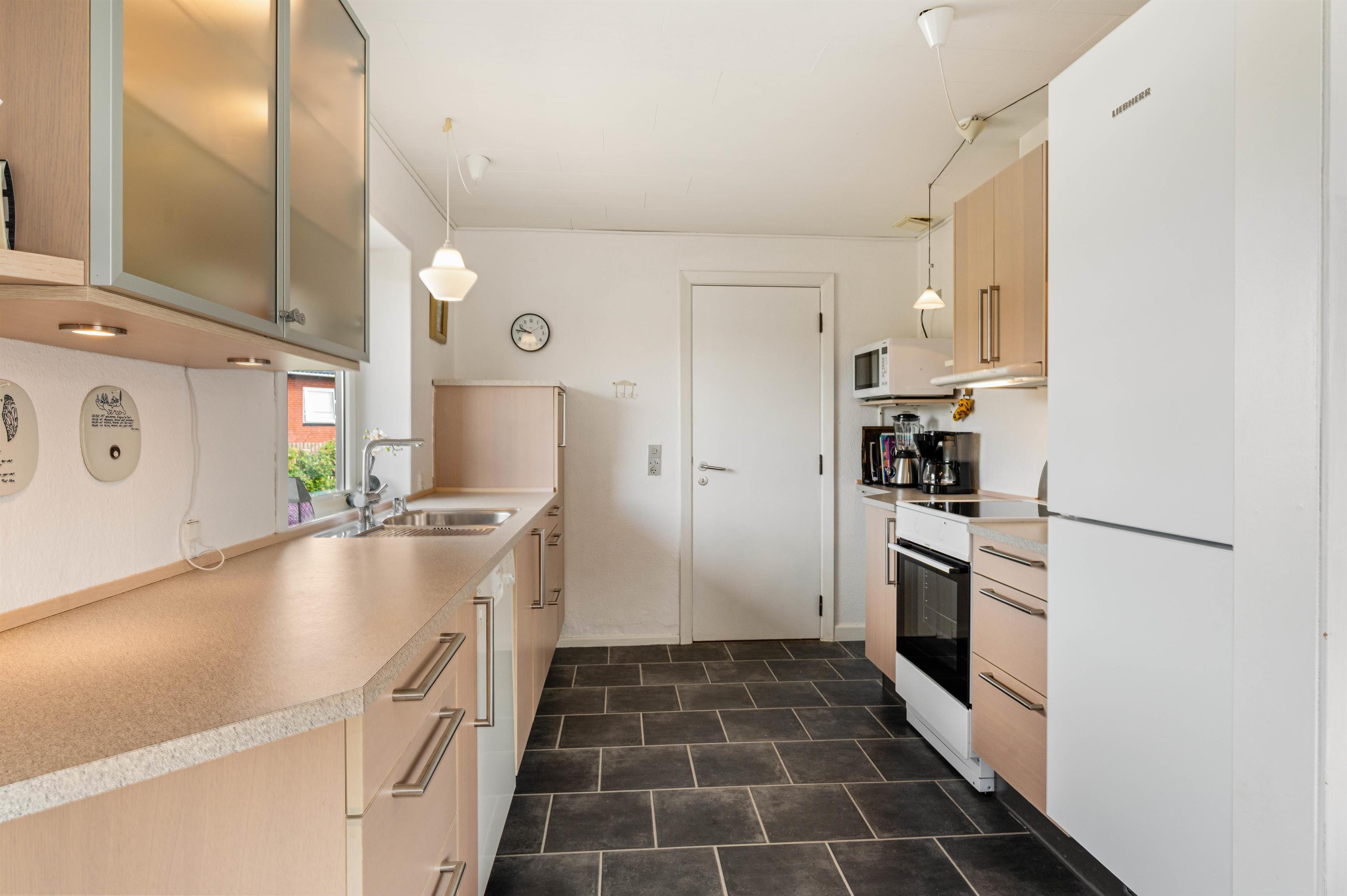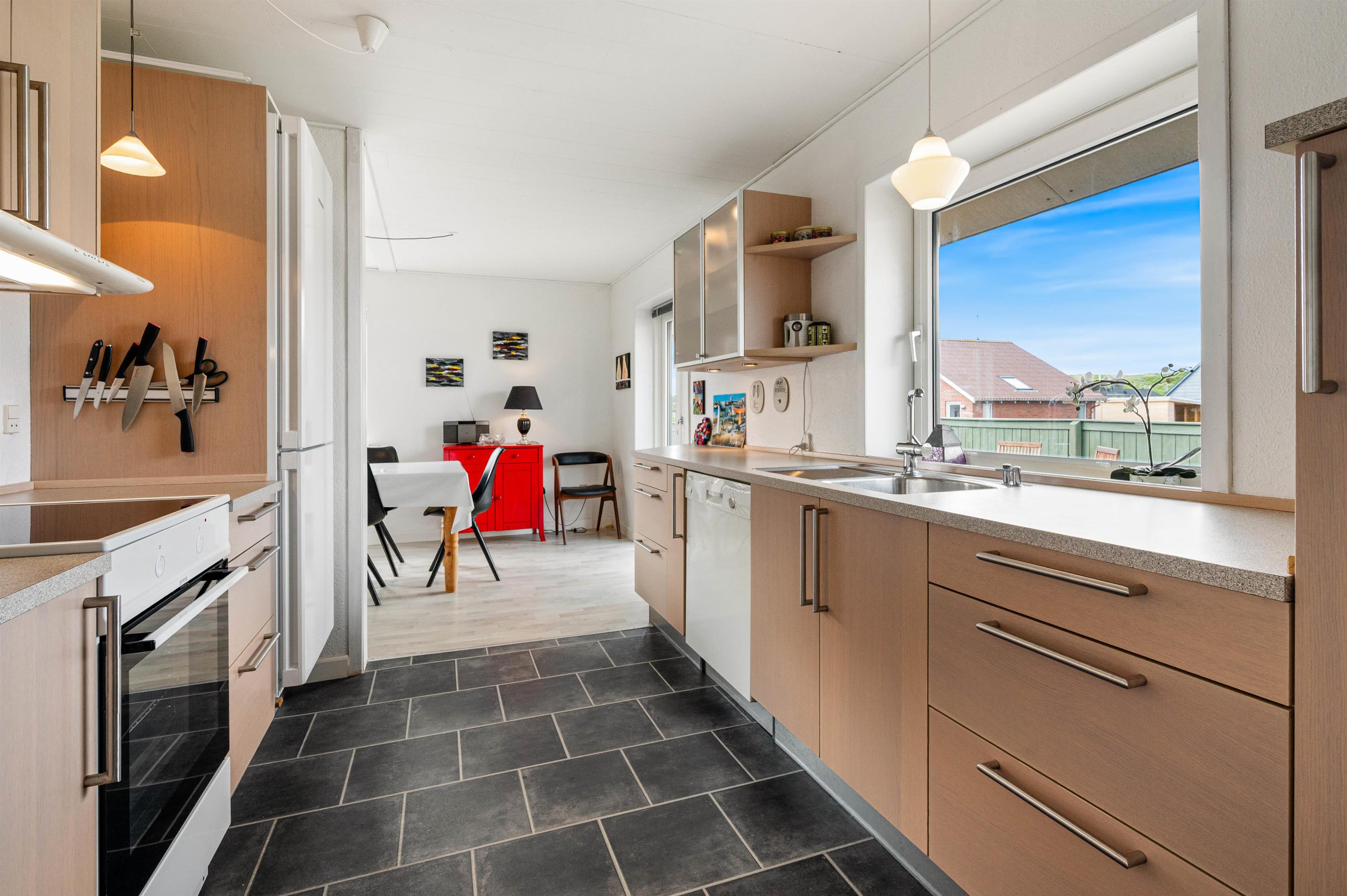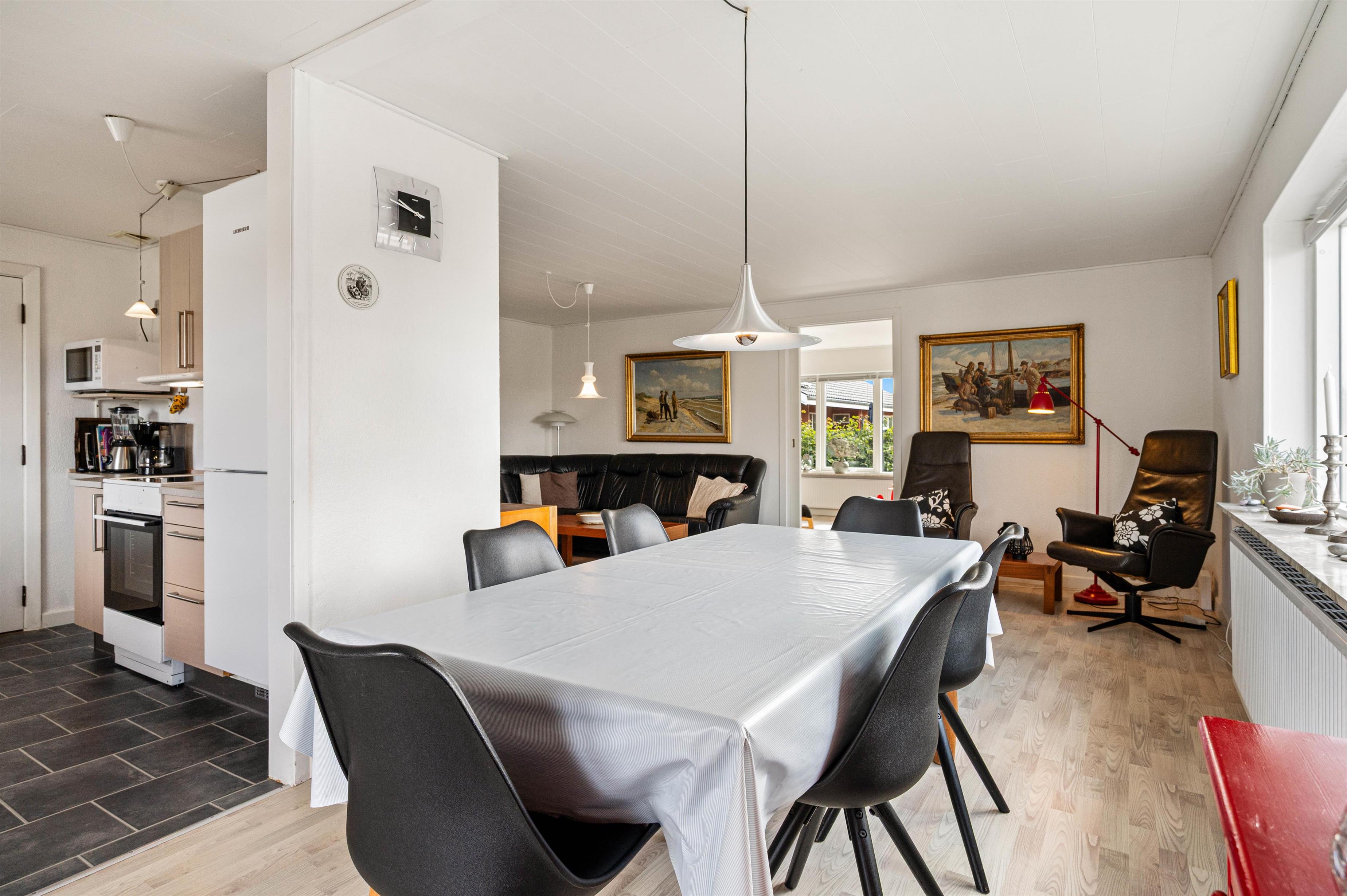Centrum i huset er det lyse og godt indrettede opholdsrum med stue, køkken og spisestue i ét. Den praktiske og velindrettede køkkenafdeling er bl.a. med opvaskemaskine. Herfra er der åbent ind til den hyggelige spiseafdeling og opholdsstuen.