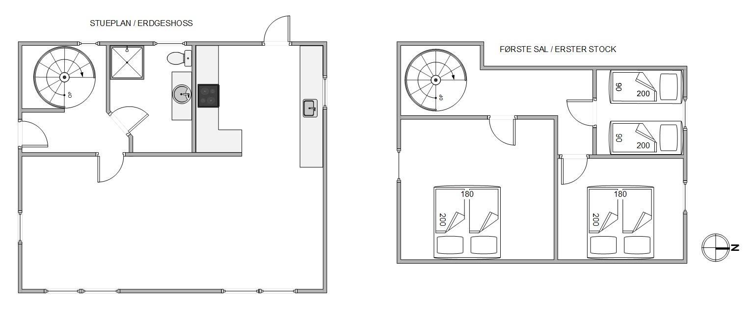 Feriehuset er fordelt på flere etager og husets hjerte er det centralt beliggende opholdsrum, hvor et komfortabelt sofahjørne indbyder til afslapning. Spisebordet er placeret i direkte forlængelse af stueområdet, så børnene kan tegne eller spille, mens du læser den nyeste krimi.