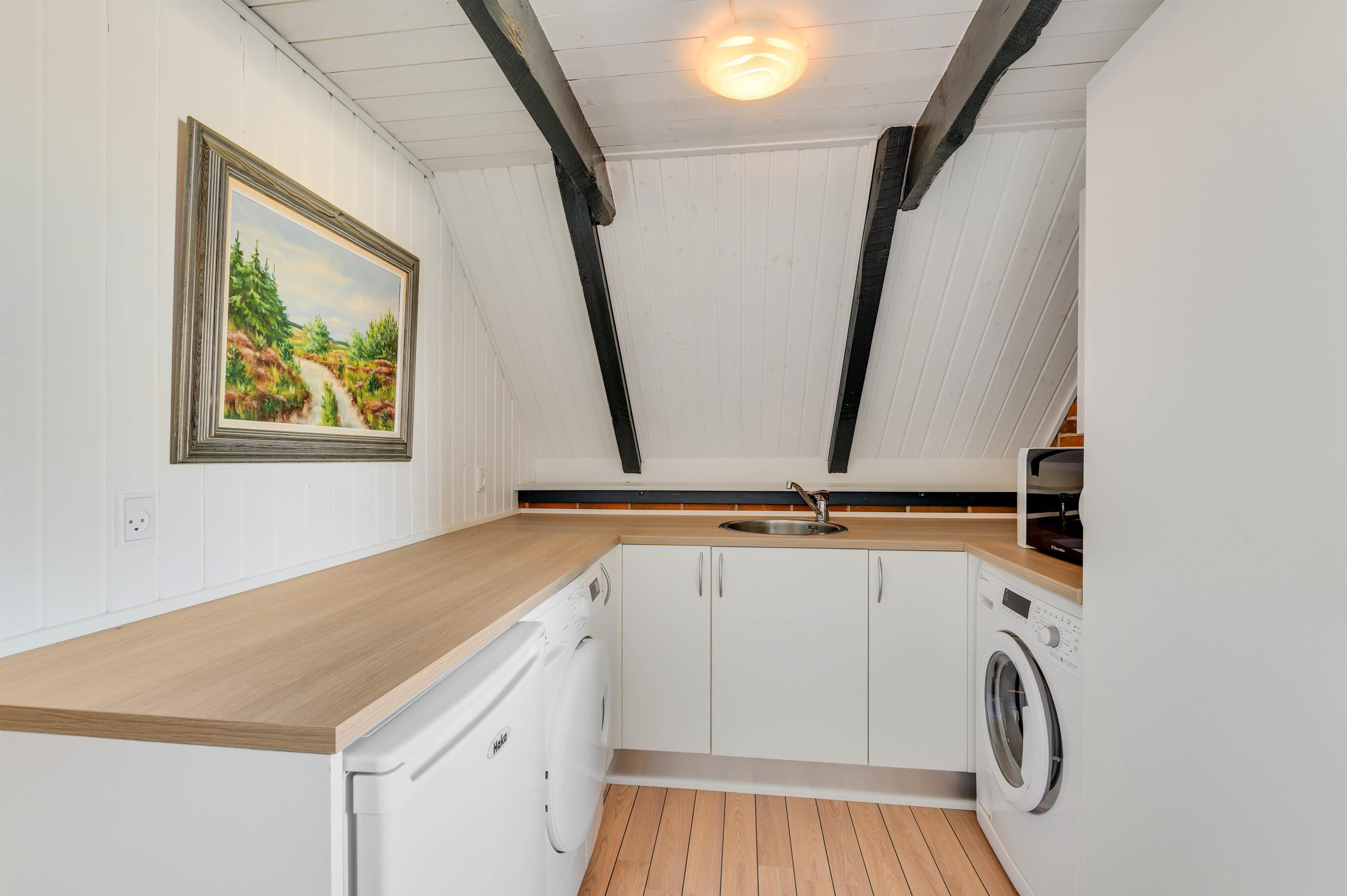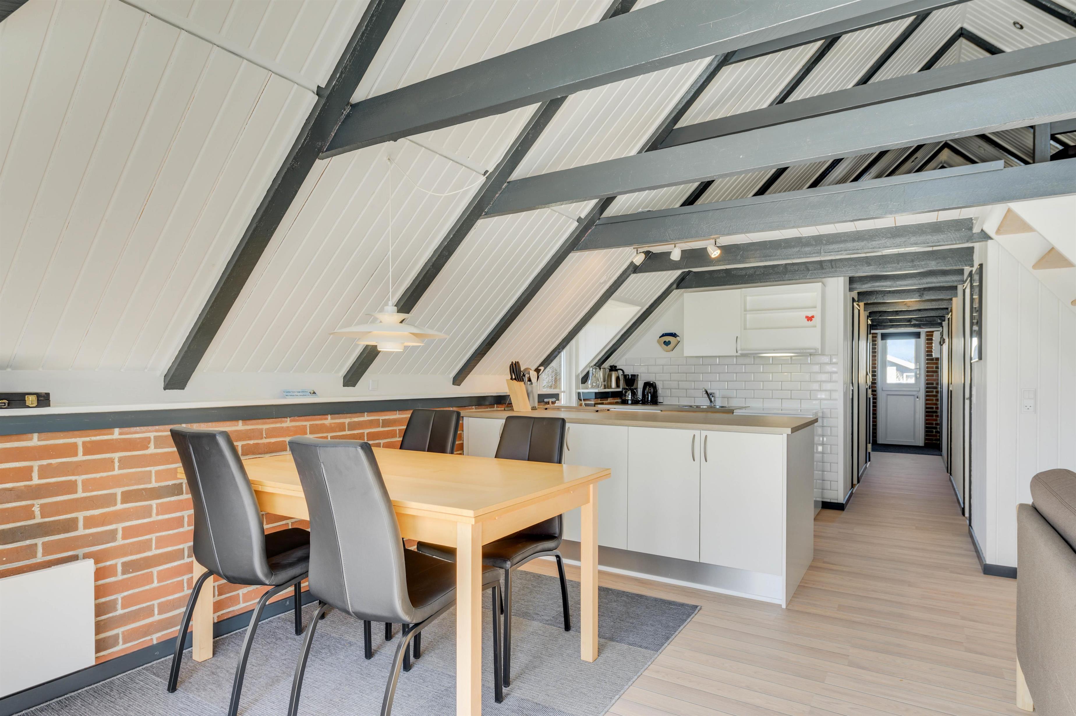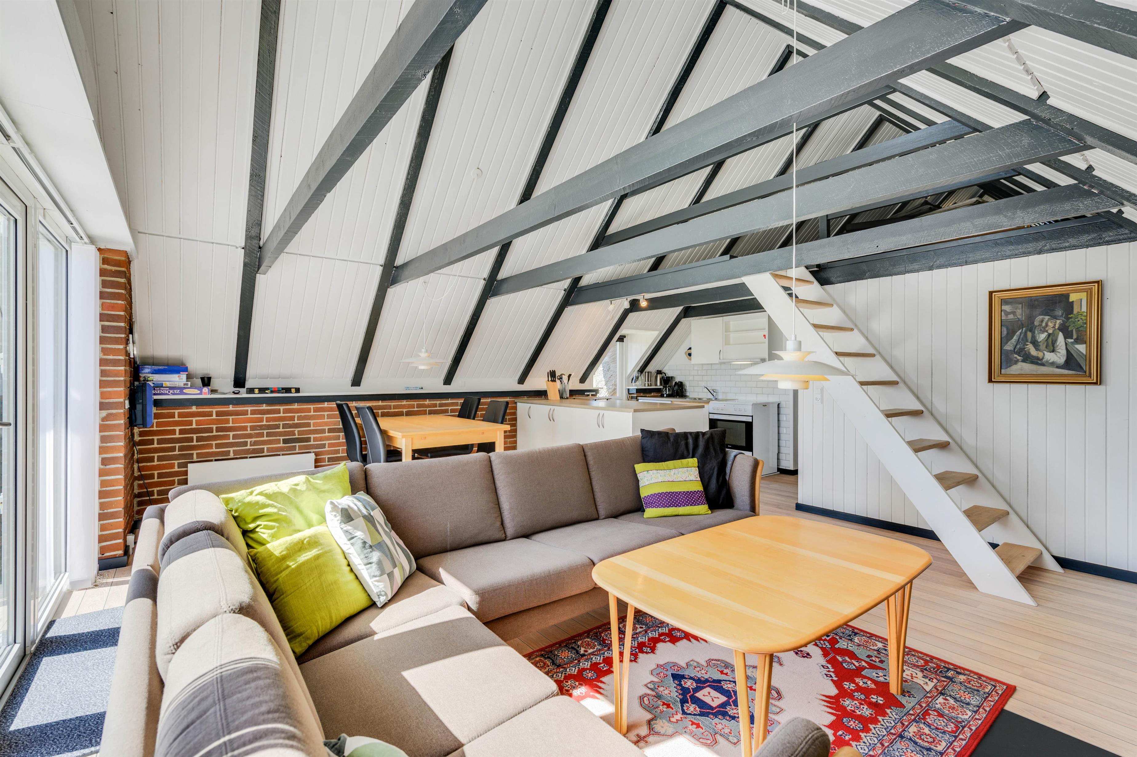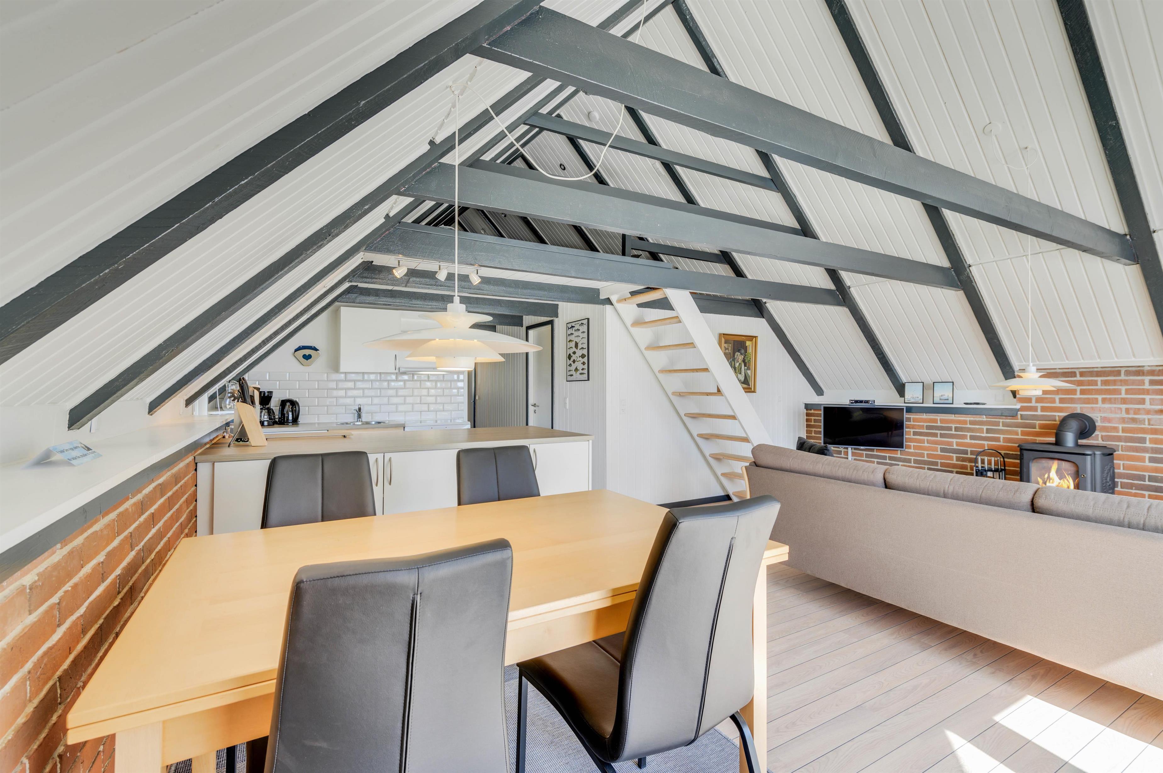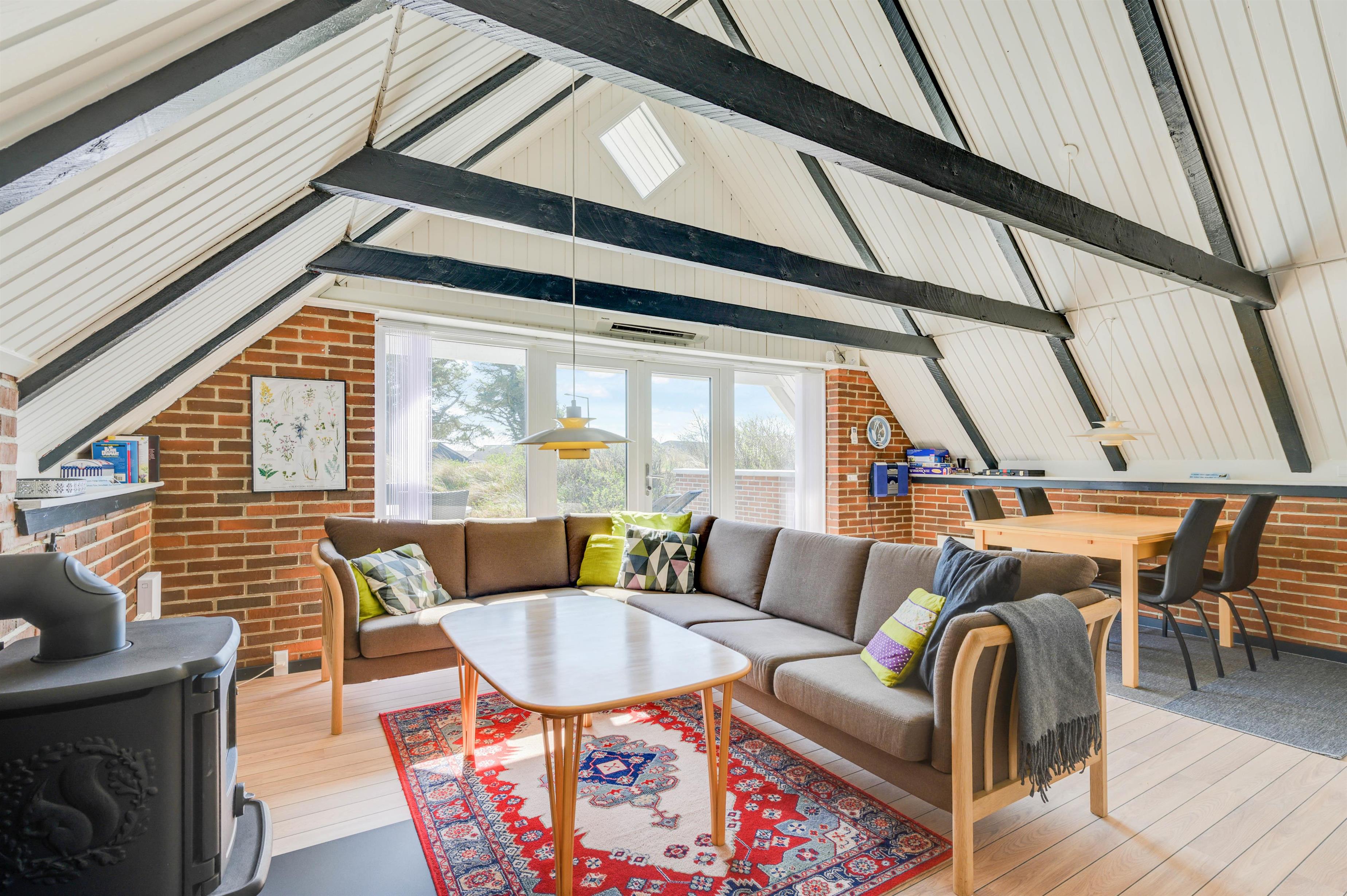I det hyggelige sofahjørne kan I smide benene opad med en god film og en gang hjemmelavede popcorn, og på de frostklare vinterdage står brændeovnen for feriehyggen. I stueafdelingen finder I også spisebordet, og der gemmer sig en ekstra lille hyggekrog for enden af trapperne, nemlig en hems med sækkestole, ekstra sovepladser og eget fjernsyn.
