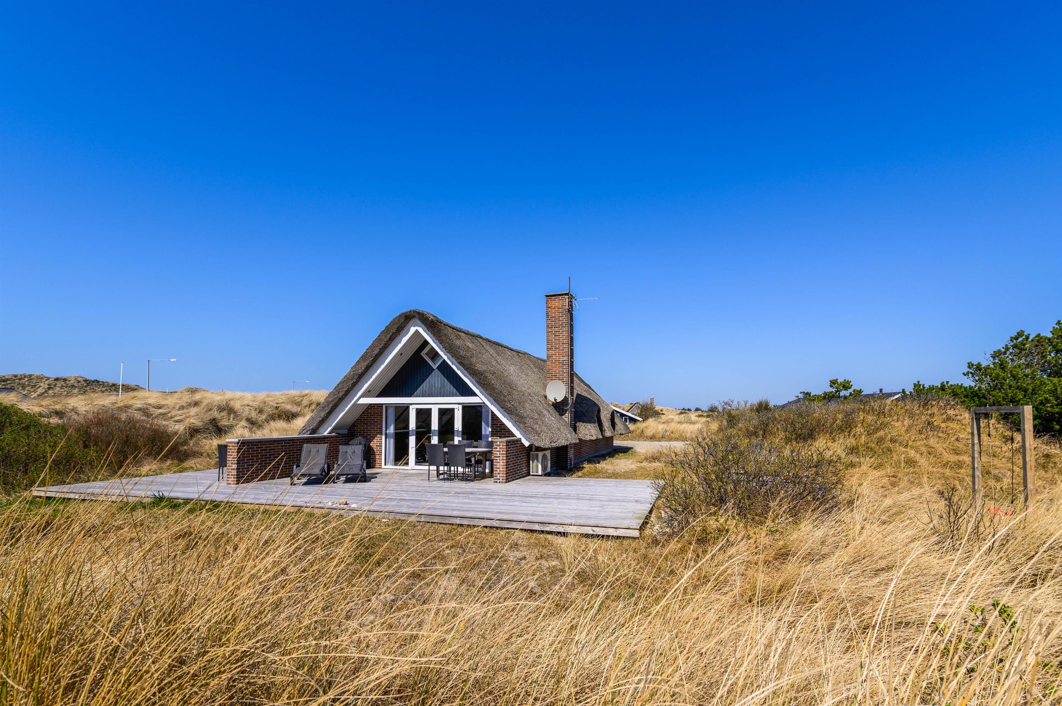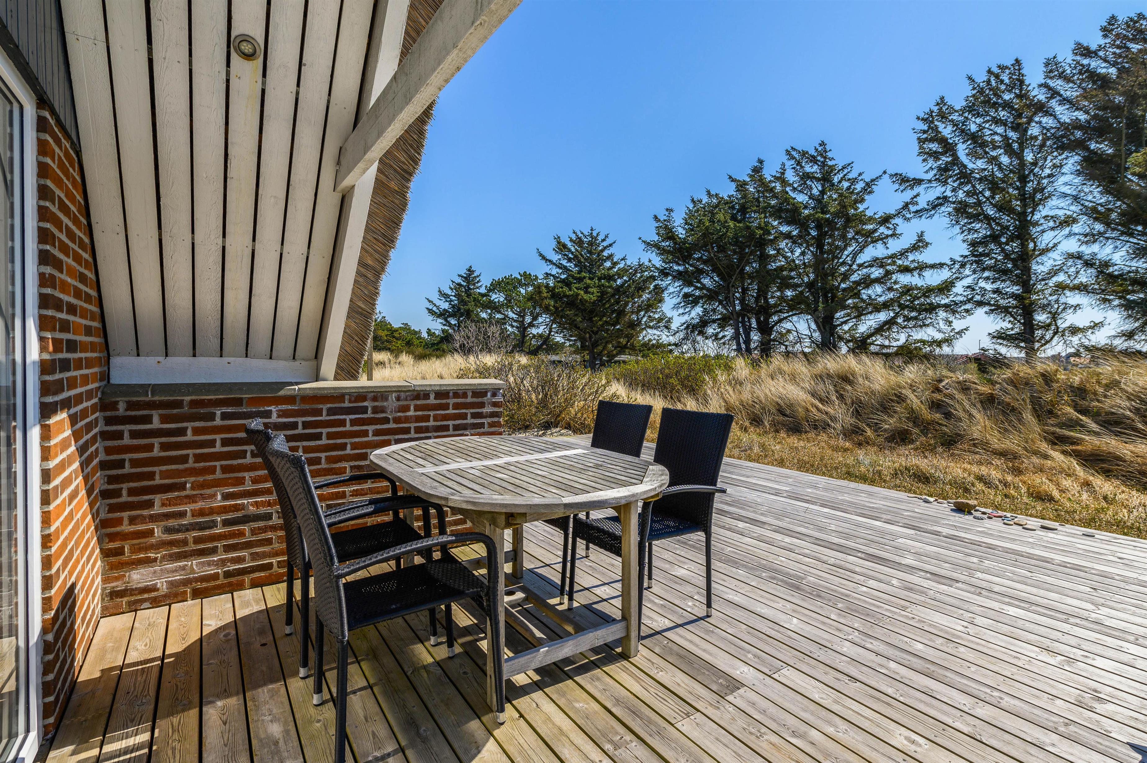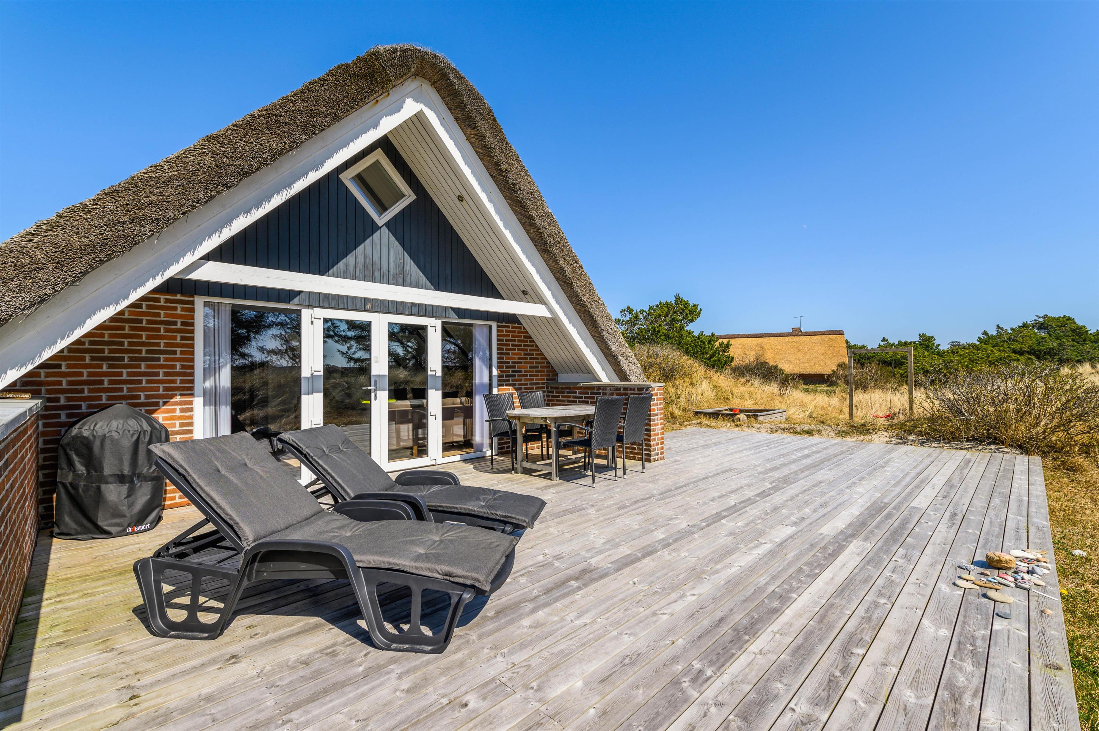 Fra stuen kommer I ud på den store, åbne træterrasse. Her finder alle en plads i solen, og på de ekstra varme dage kan I nyde solstrålerne fra liggestolene med en kold drink ved siden af. Til de mindste feriegæster står der et gyngestativ blandt klitterne.