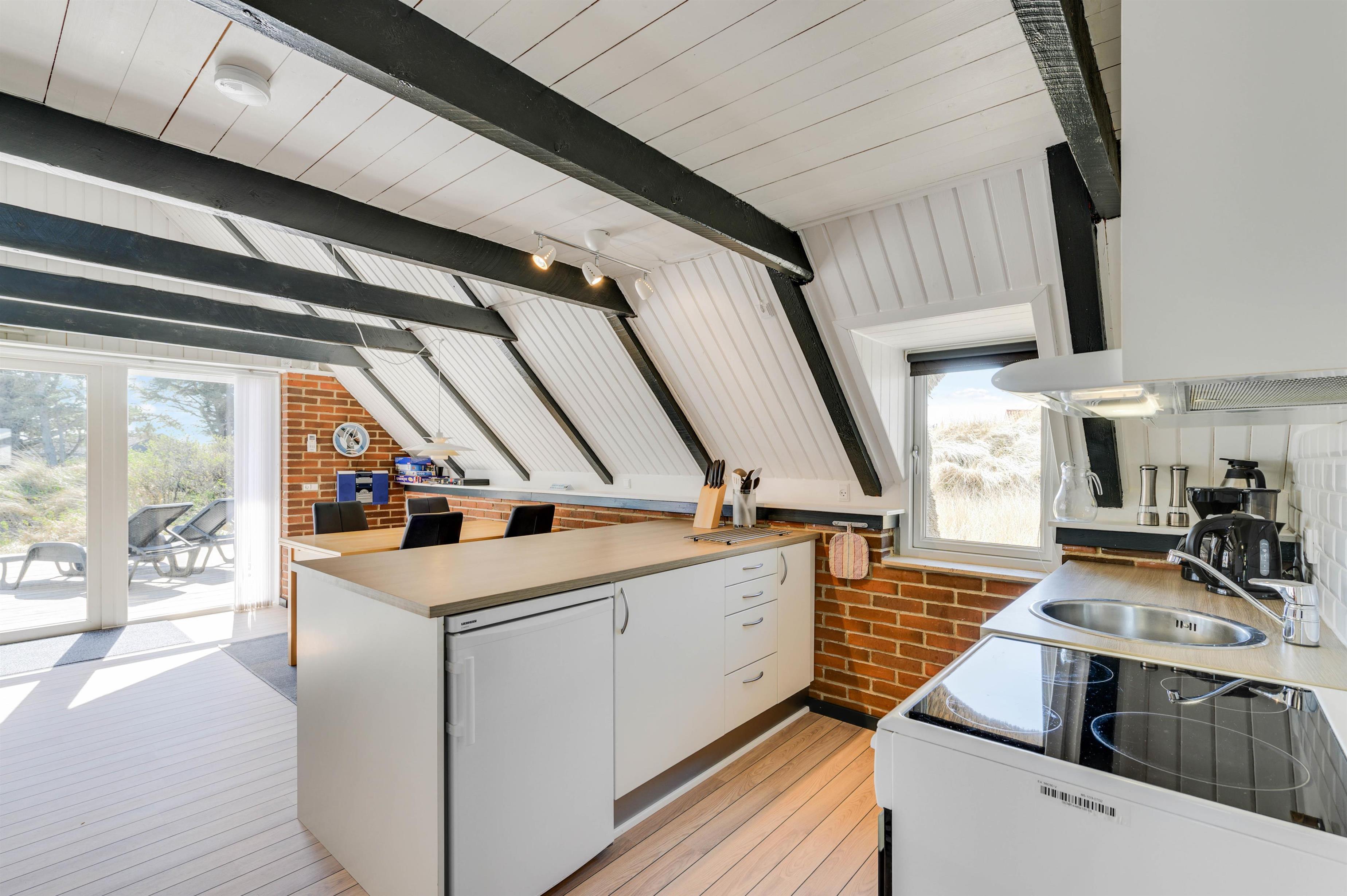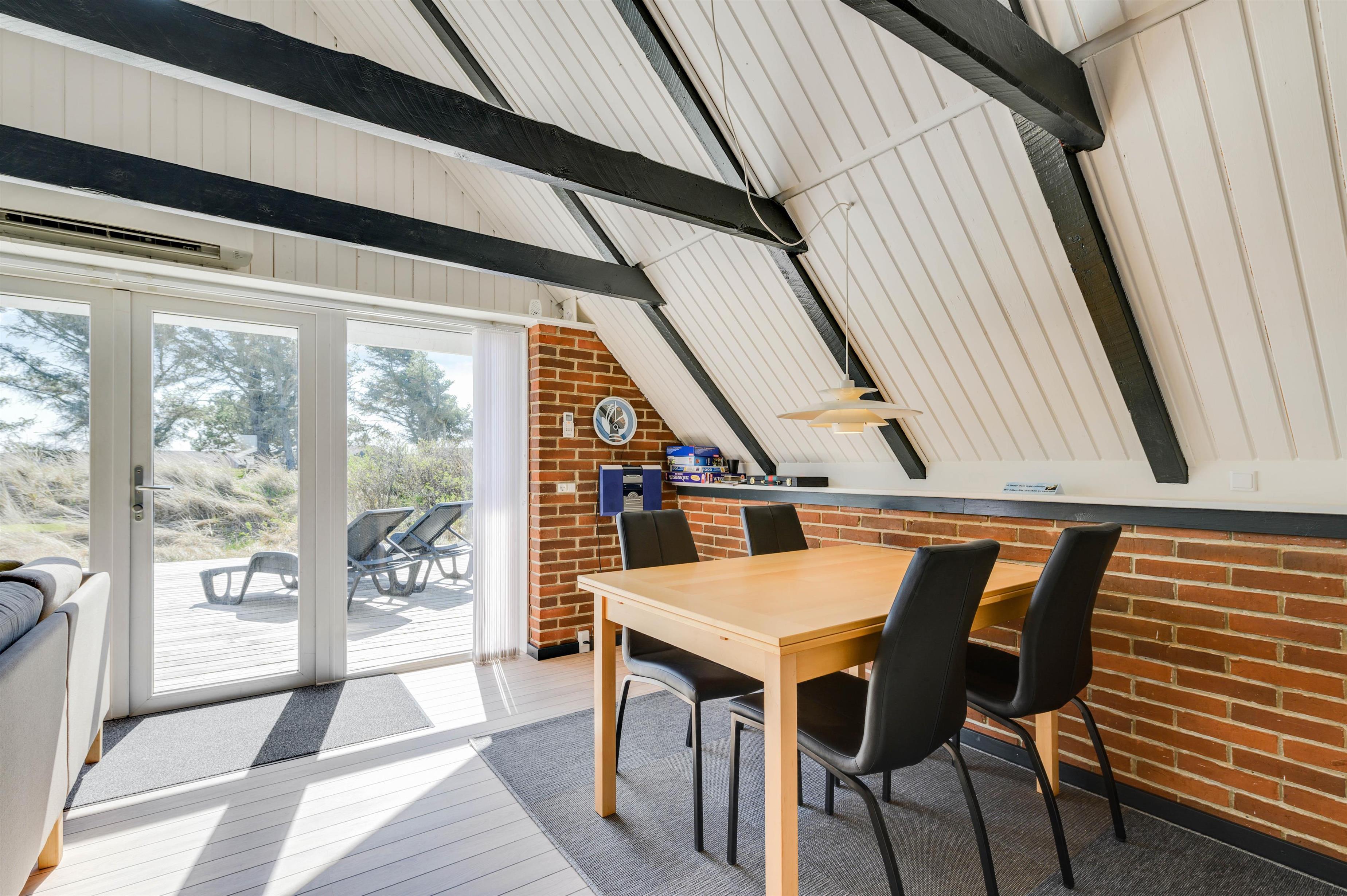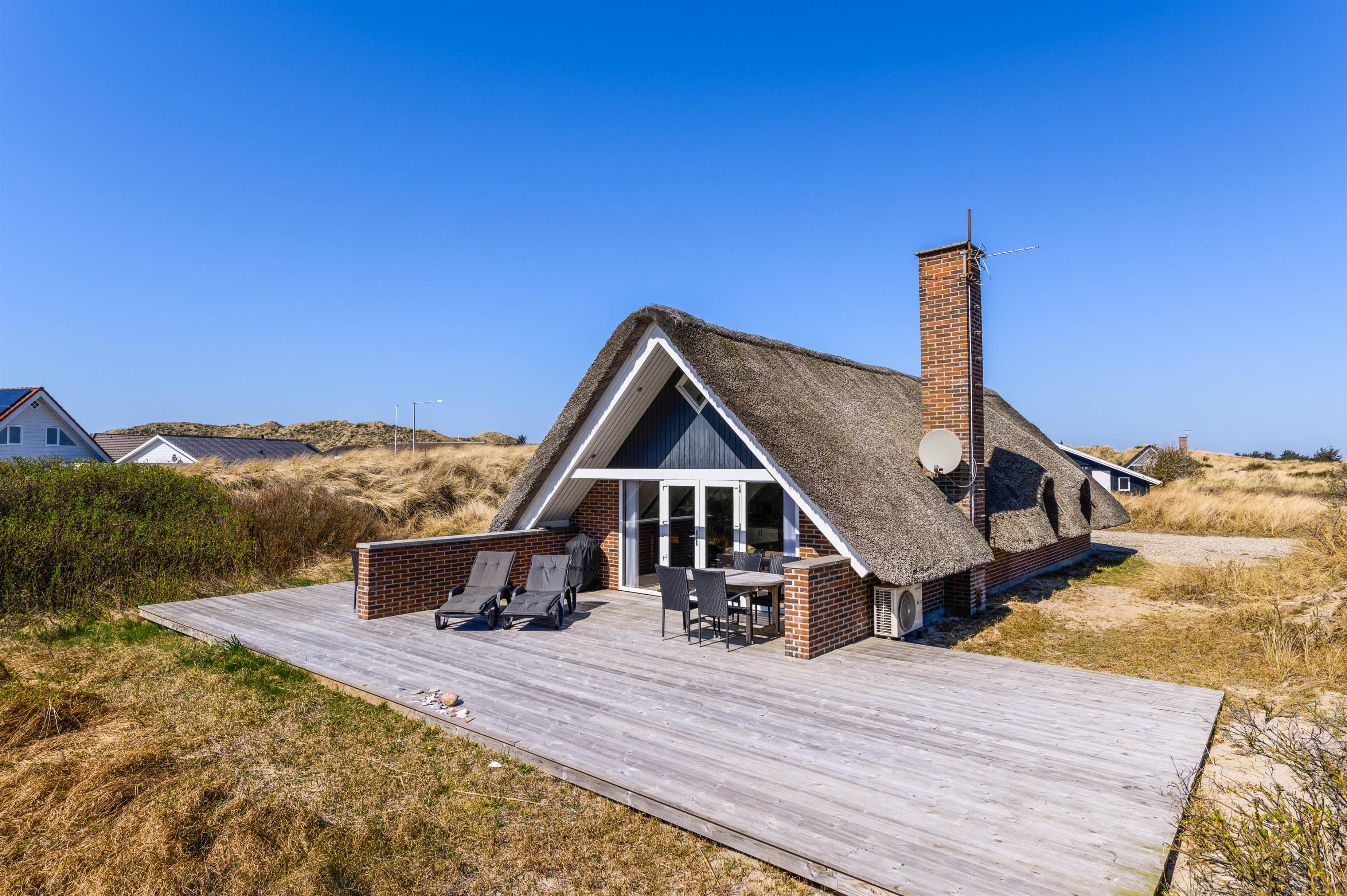 Fra stuen kommer I ud på den store, åbne træterrasse. Her finder alle en plads i solen, og på de ekstra varme dage kan I nyde solstrålerne fra liggestolene med en kold drink ved siden af. Til de mindste feriegæster står der et gyngestativ blandt klitterne.