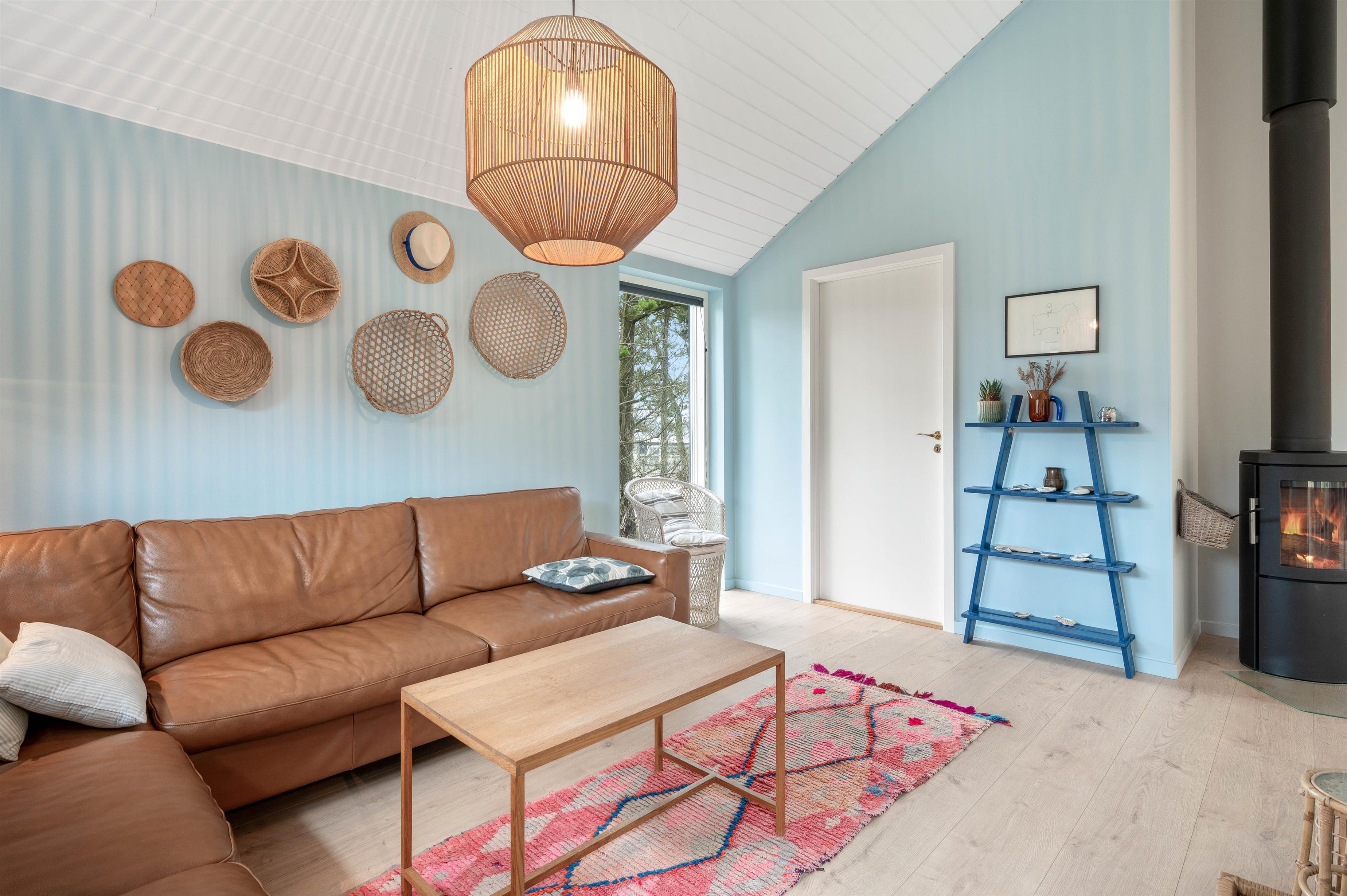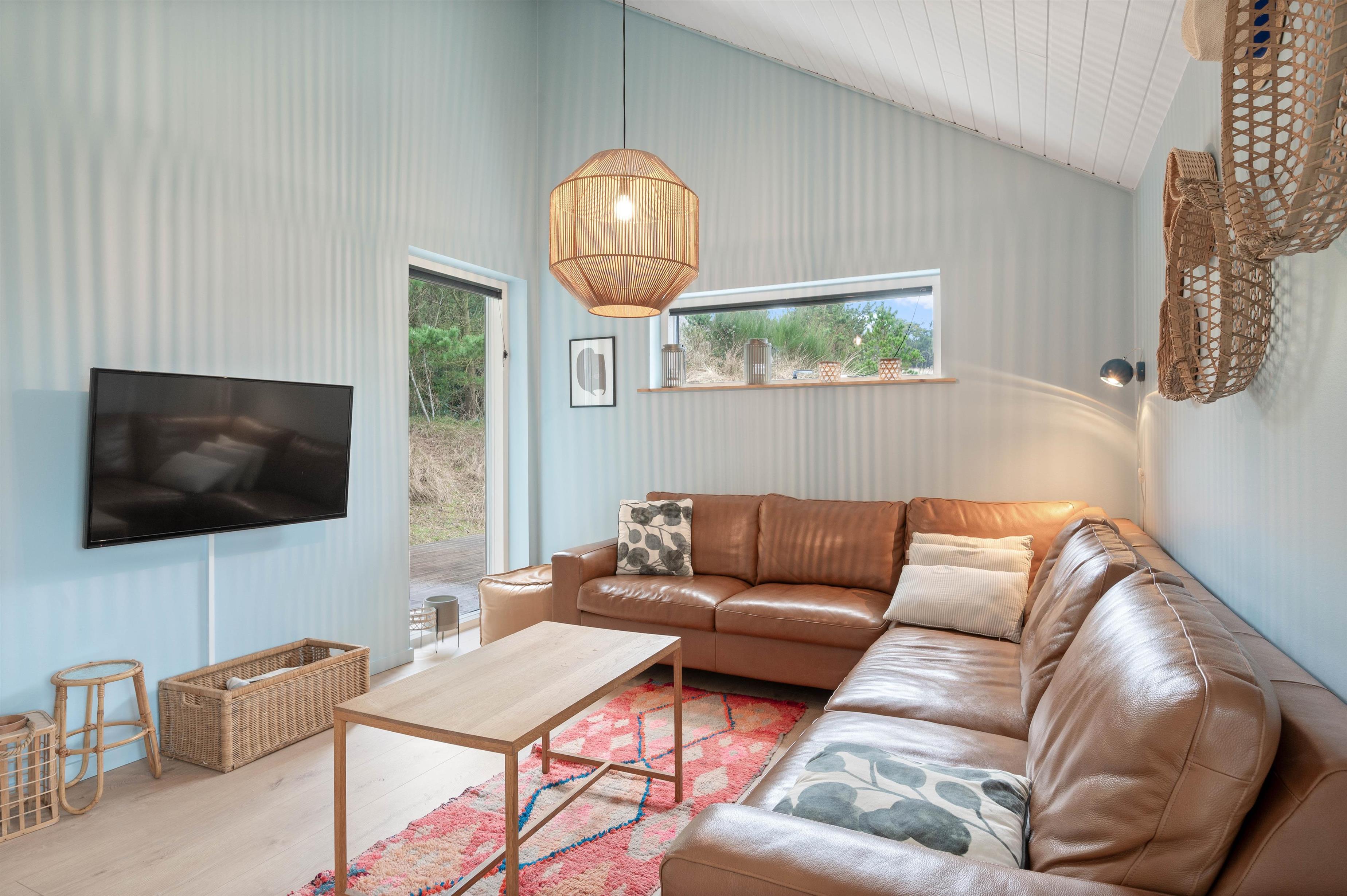 Samlingspunktet er det store hyggelige opholdsrum, hvor der ligesom i resten af sommerhuset, er åbnet op til kip. Her inviterer de store vinduespartier mod sydvest solen helt ind i huset for en lys og dejlig stemning.