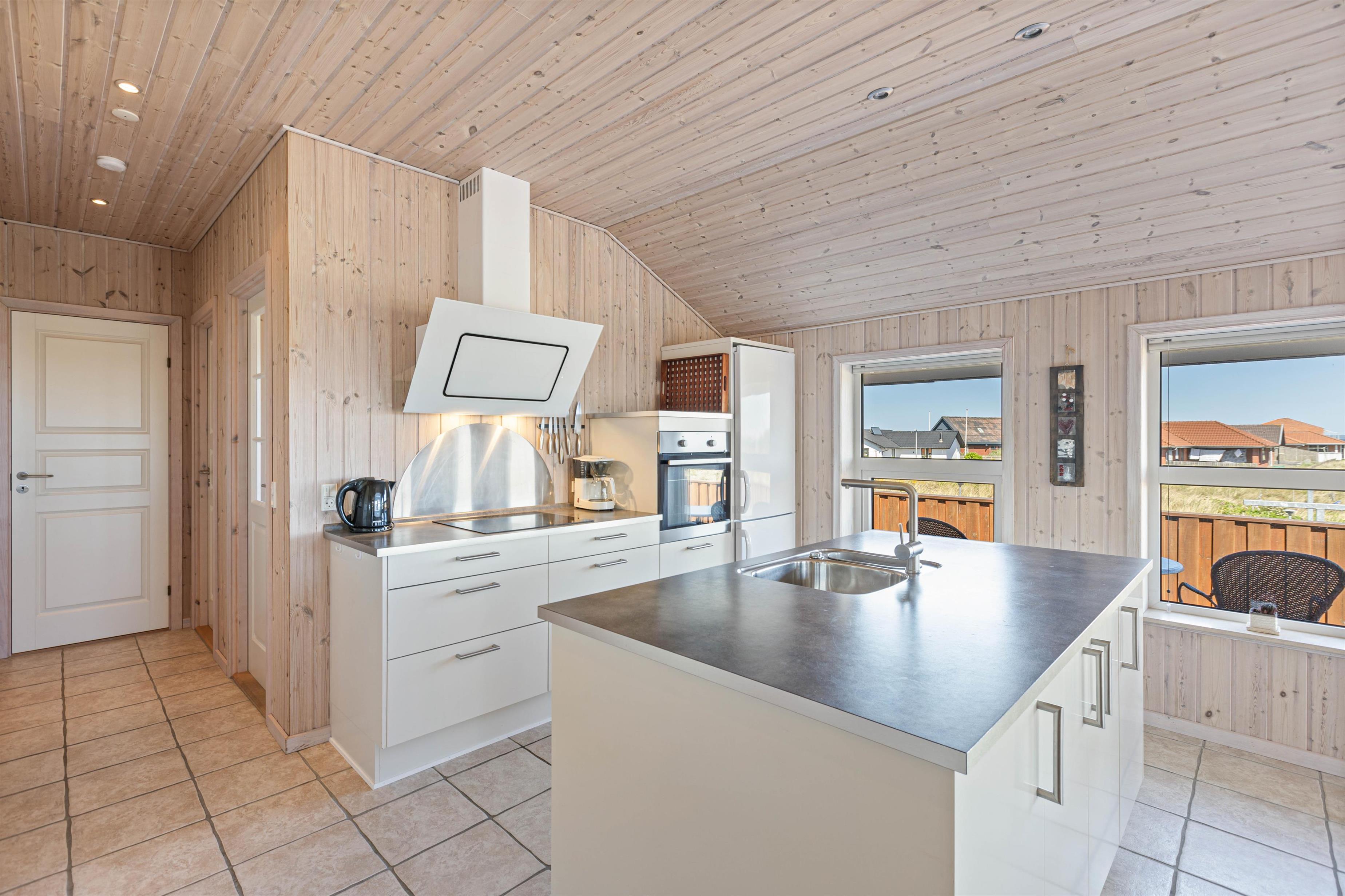 Det lyse og venlige feriehus er indrettet med et lækkert og veludstyret køkkenalrum, som virkelig lægger op til fællesskab og hygge omkring maden. Det skønne lys, som er så egen ved Vesterhavet blinker ind gennem ruderne, især i husets stue, hvorfra I kan se ud over fjorden. Med direkte udgang til den store dejlige terrasse, er der også super muligheder for at spise og grille udenfor, og nyde de smukke omgivelser – også når det blæser lidt, da der er sørget for mange læhjørner.