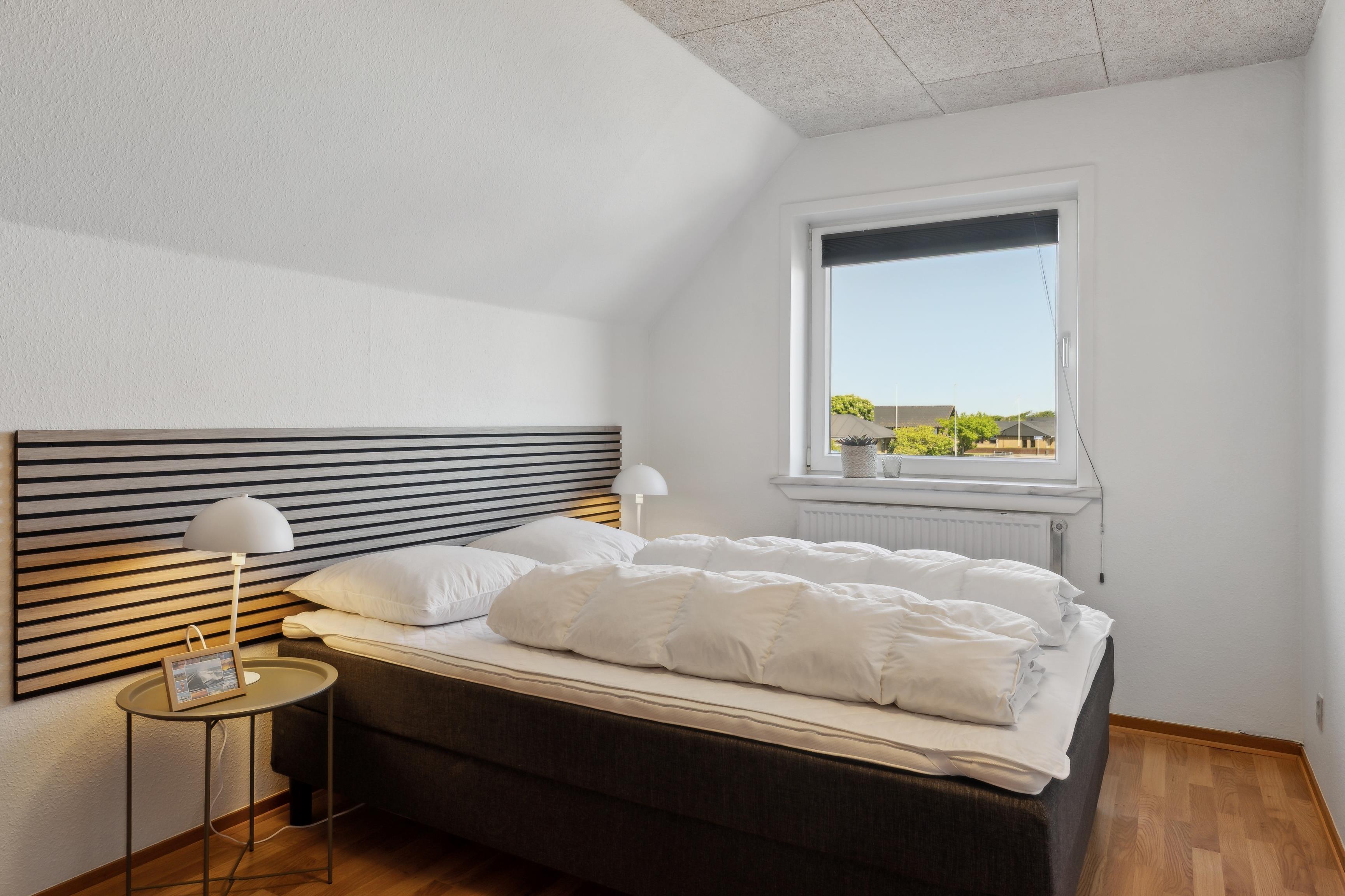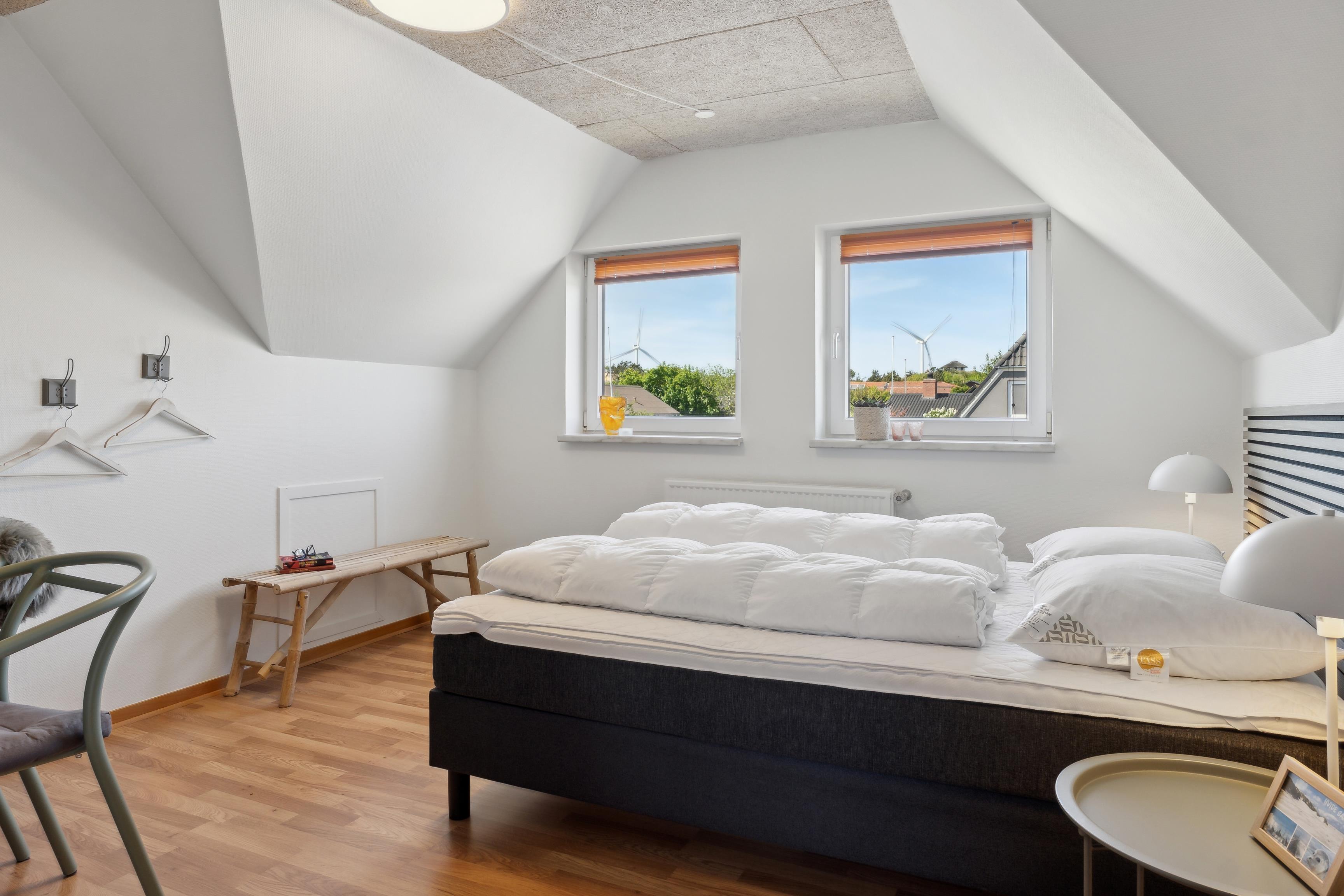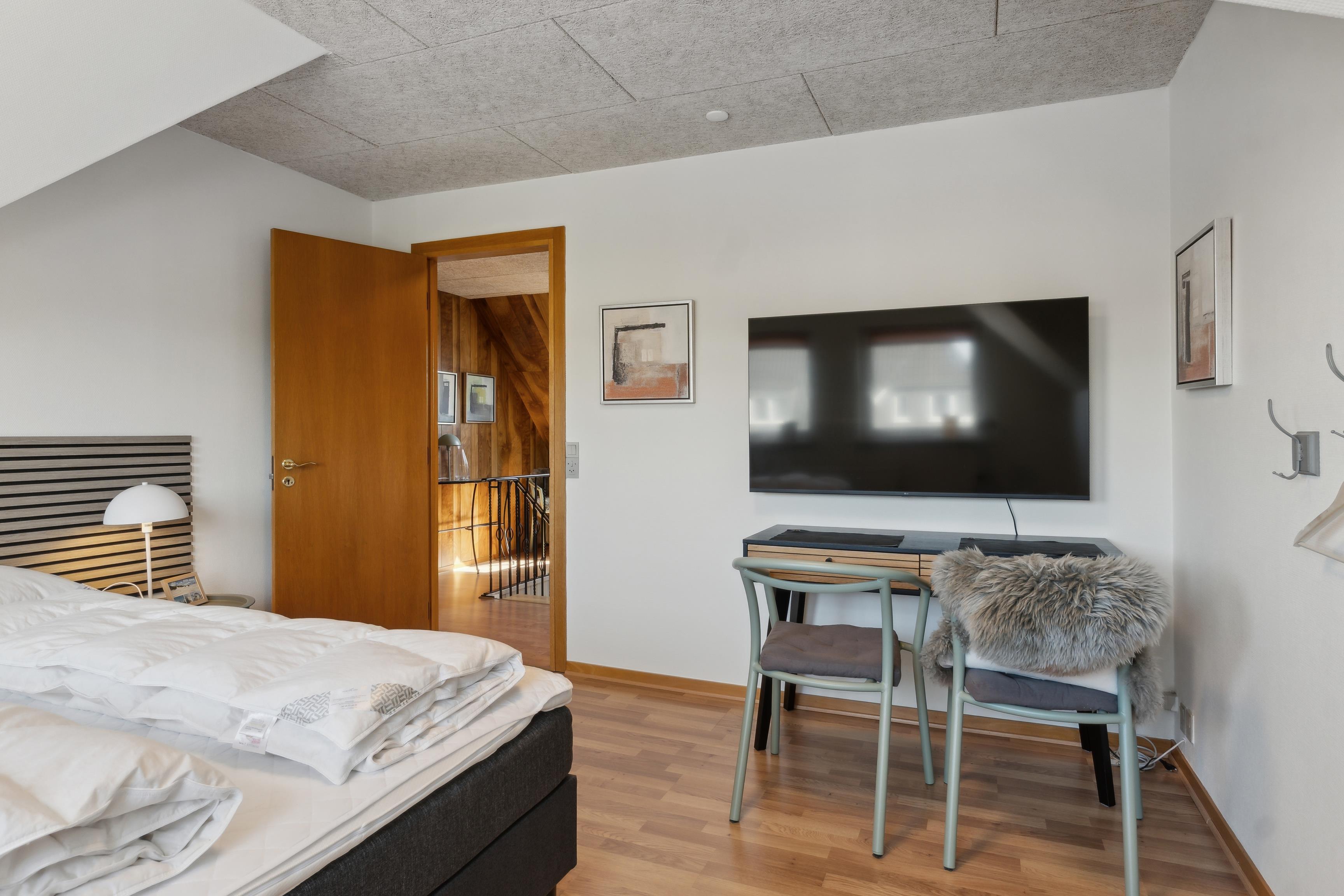 På førstesalen finder I 4 soveværelser – alle med dobbeltsenge (140x200 cm) – samt et ekstra badeværelse og en privat sauna, perfekt efter en lang dag ved havet eller på fjorden.