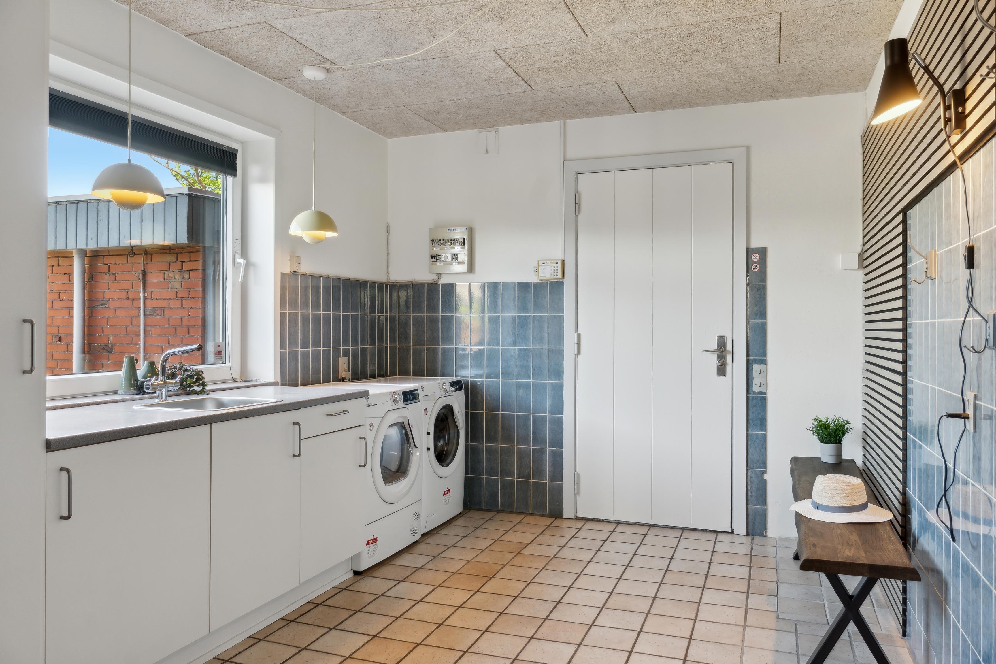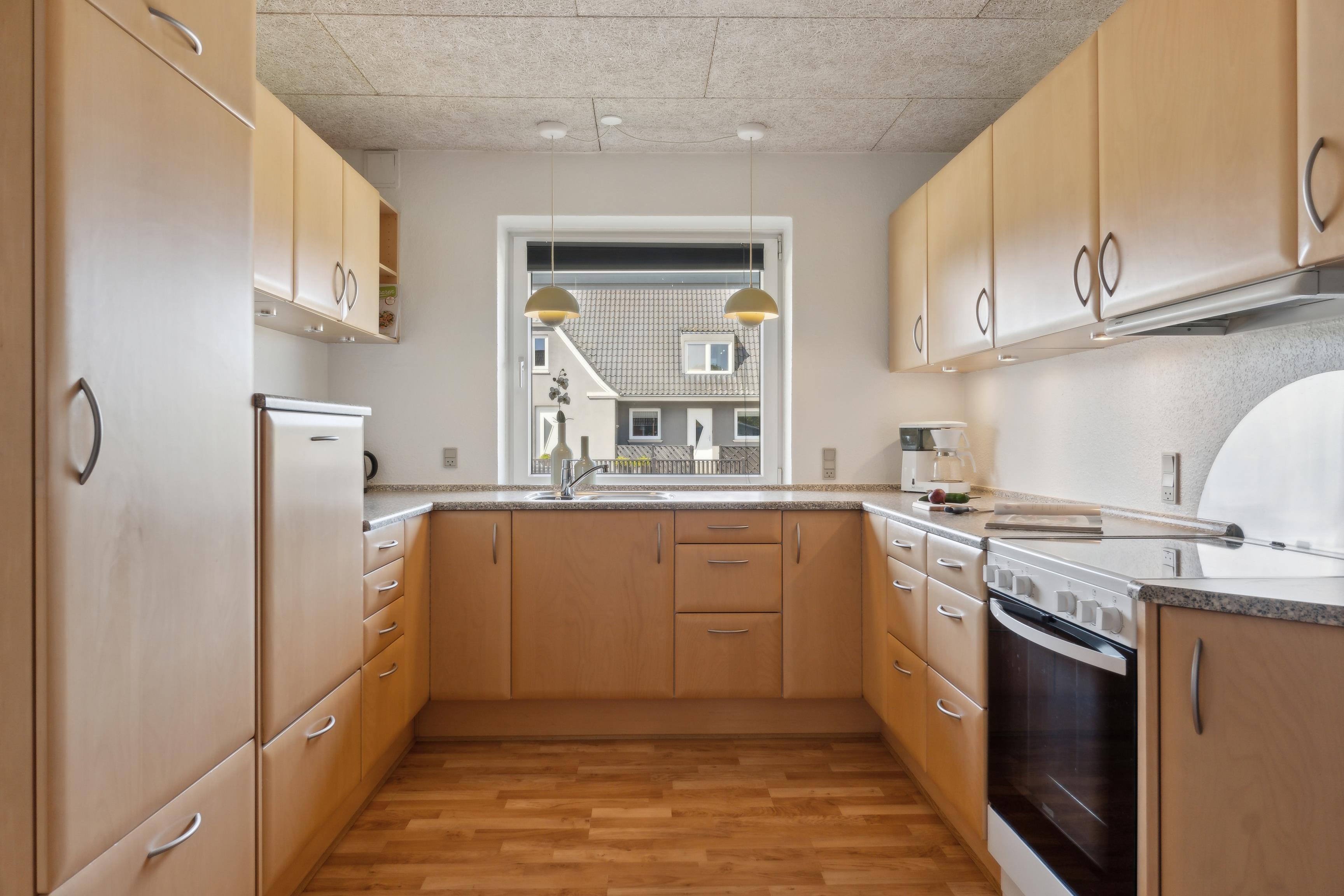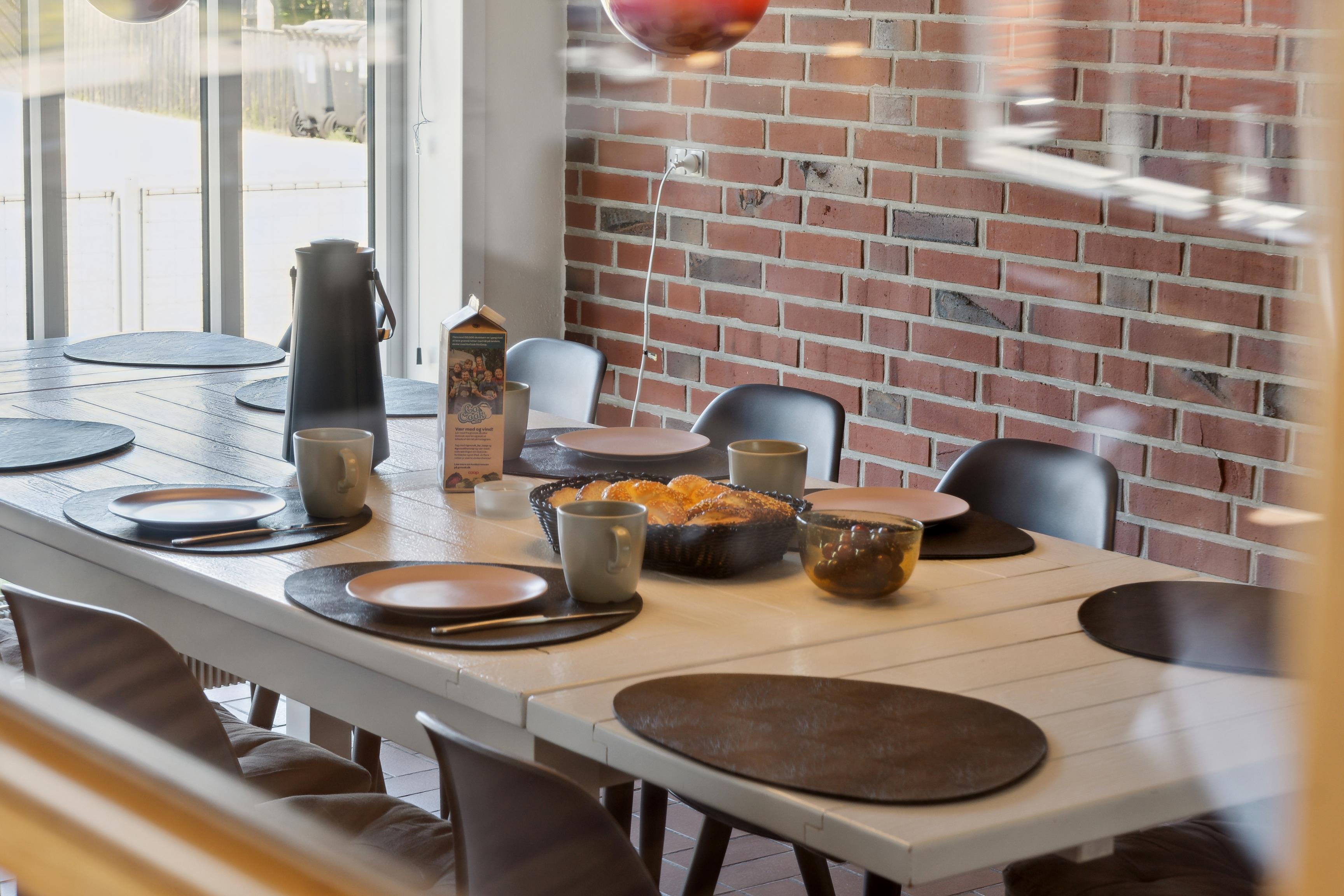 I den lyse og rummelige vinkelstue er der plads til både afslapning og fællesskab. Her kan I nyde måltiderne sammen, se Film, spille spil eller bare slappe af. I åben forbindelse ligger alrum og køkken, som er fuldt udstyret med alt, hvad I har brug for – inkl. opvaskemaskine, ovn, mikroovn og stor fryser. Fra køkkenet er der adgang til et praktisk bryggers med vaskemaskine, tørretumbler.