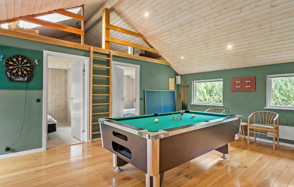 Dette sommerhus ligger nær Rødby færgehavn og har masser af plads til en stor familie eller to vennefamilier, der gerne vil opleve Lolland sammen. Huset er meget rummeligt og indrettet med klassiske sommerhuselementer, så her indfinder feriehyggen sig på nul komma fem. Både indendørs og udendørs er der en lang række aktivitetsmuligheder. I det åbne køkken kan I sammen tilberede lækre ferieretter og nyde dem rundt om det lange elegante spisebord, mens brændeovnen skaber en hyggelig atmosfære. I aktivitetslokalet kan I snuppe en dyst og kåre en vinder i alt fra billard til bordtennis og dart.