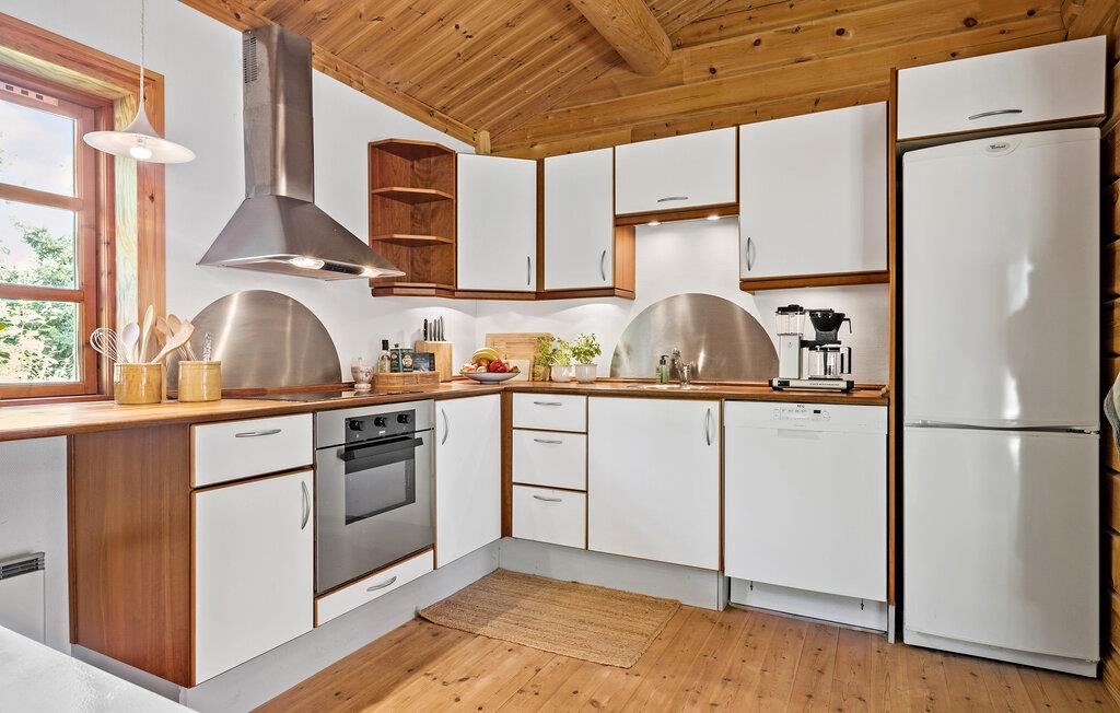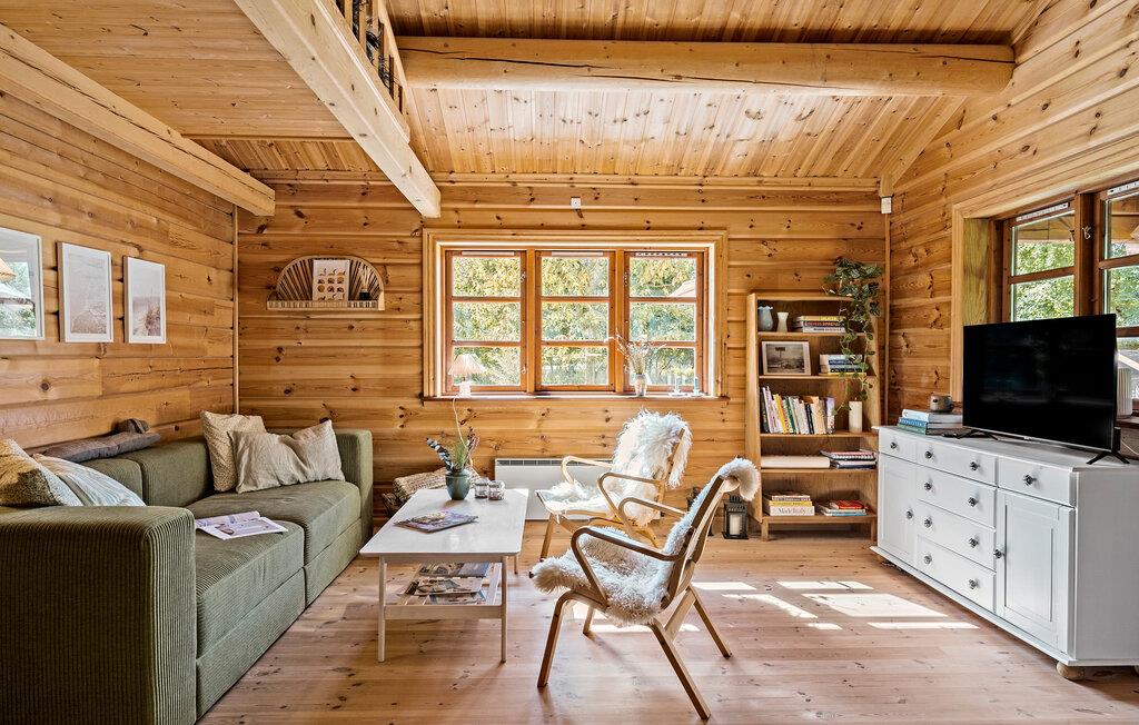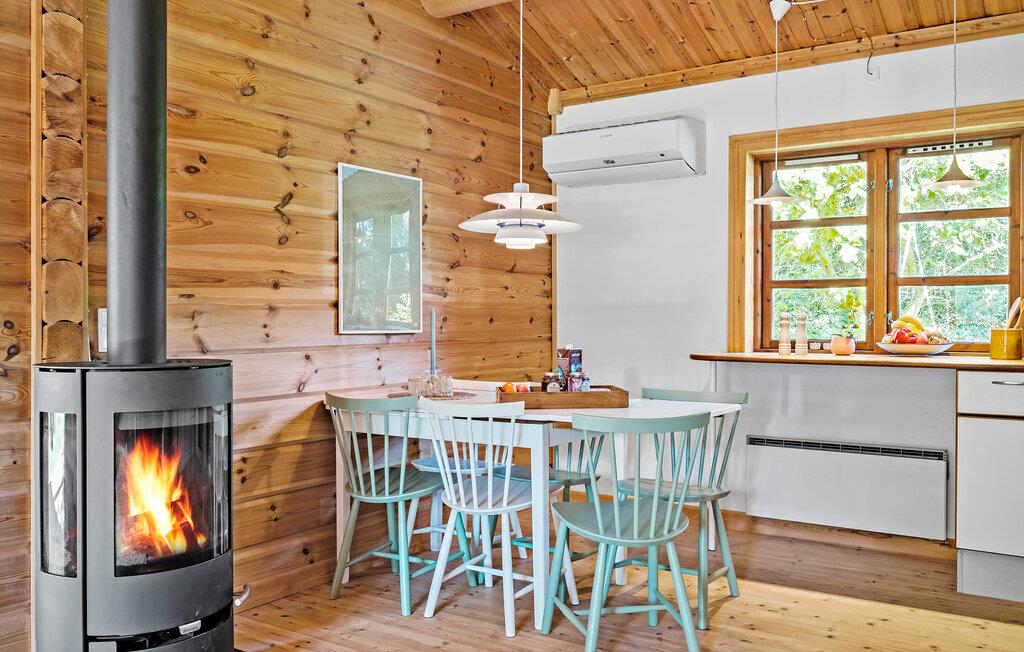 Huset har en rolig stil med vægt på naturmaterialer og et dejligt lysindfald gennem de sprossede vinduer. Træets varme farve skaber en skøn atmosfære og gør det nemt at slappe af efter en lang dag med oplevelser. Tænd op i brændeovnen på en kølig dag og giv jer god tid til madlavningen i det veludstyrede køkken.