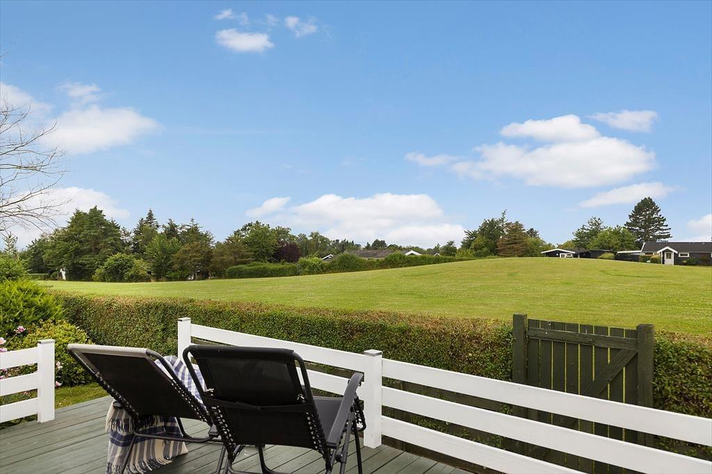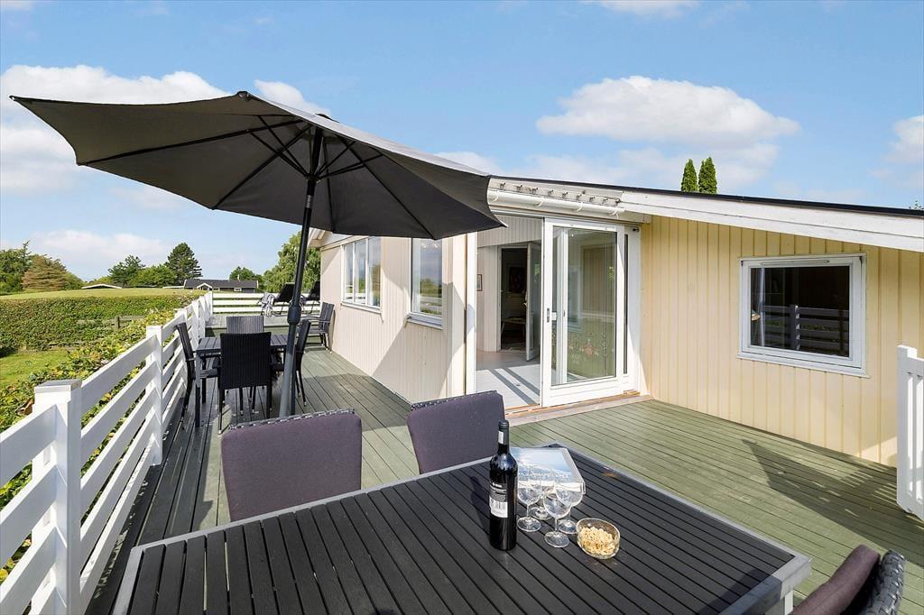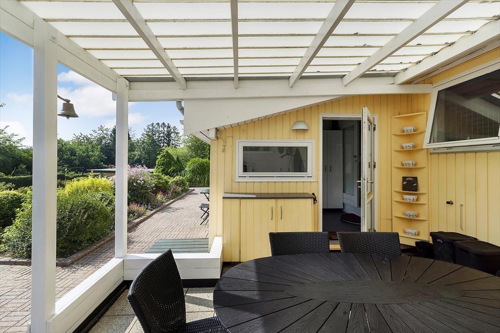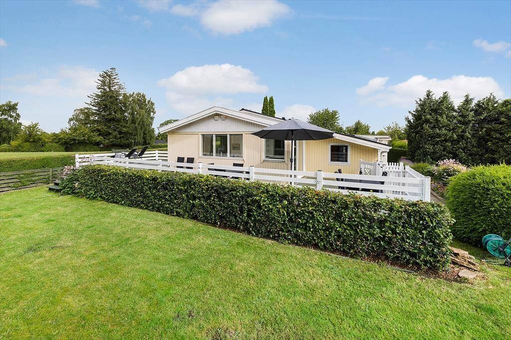 Sommerhuset er beliggende i et roligt område, ugenert fra naboen. Grunden er med god randbeplantning, så du kan sidde ude i ugenerte omgivelser og nyde solen. Fra den overdækkede terrasse er der et flot view ud over fjorden i det fjerne, den kan ikke beskrives men skal ses. Er man til en dukkert, så er det bare at gå den korte vej ned til Vigen eller den anden vej ned til badebroen ved den store fælles græsplæne hvor der er uendeligt med muligheder for at lege eller bare slappe af på et tæppe. Når aftenen falder på og det er tid til hygge, så kan der tændes op i gasgrillen og tilberedes lækker aftensmad fra grill.