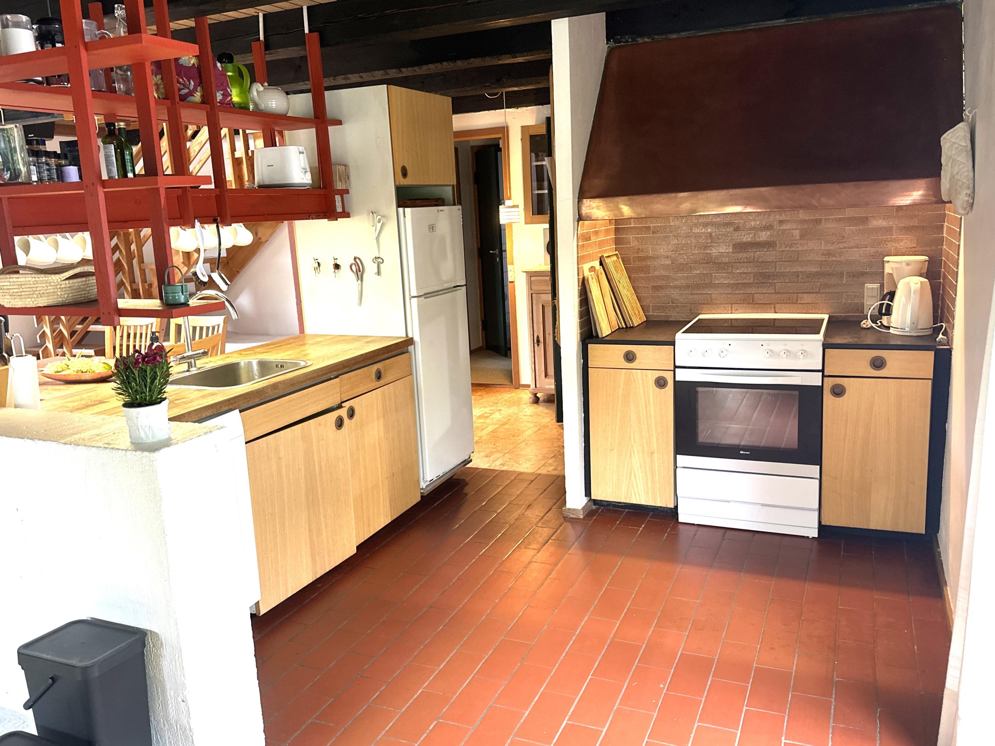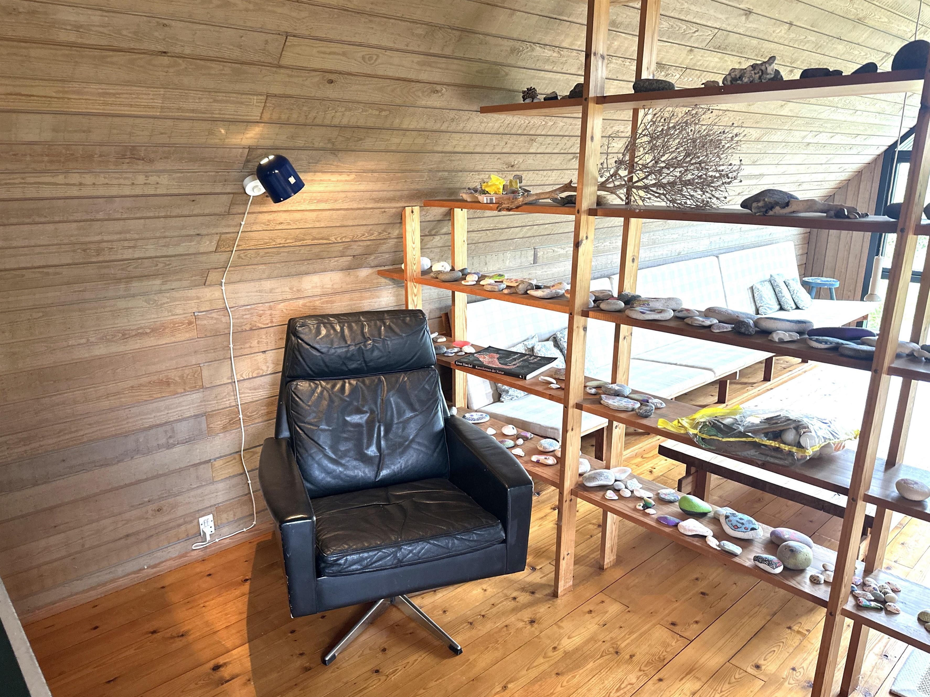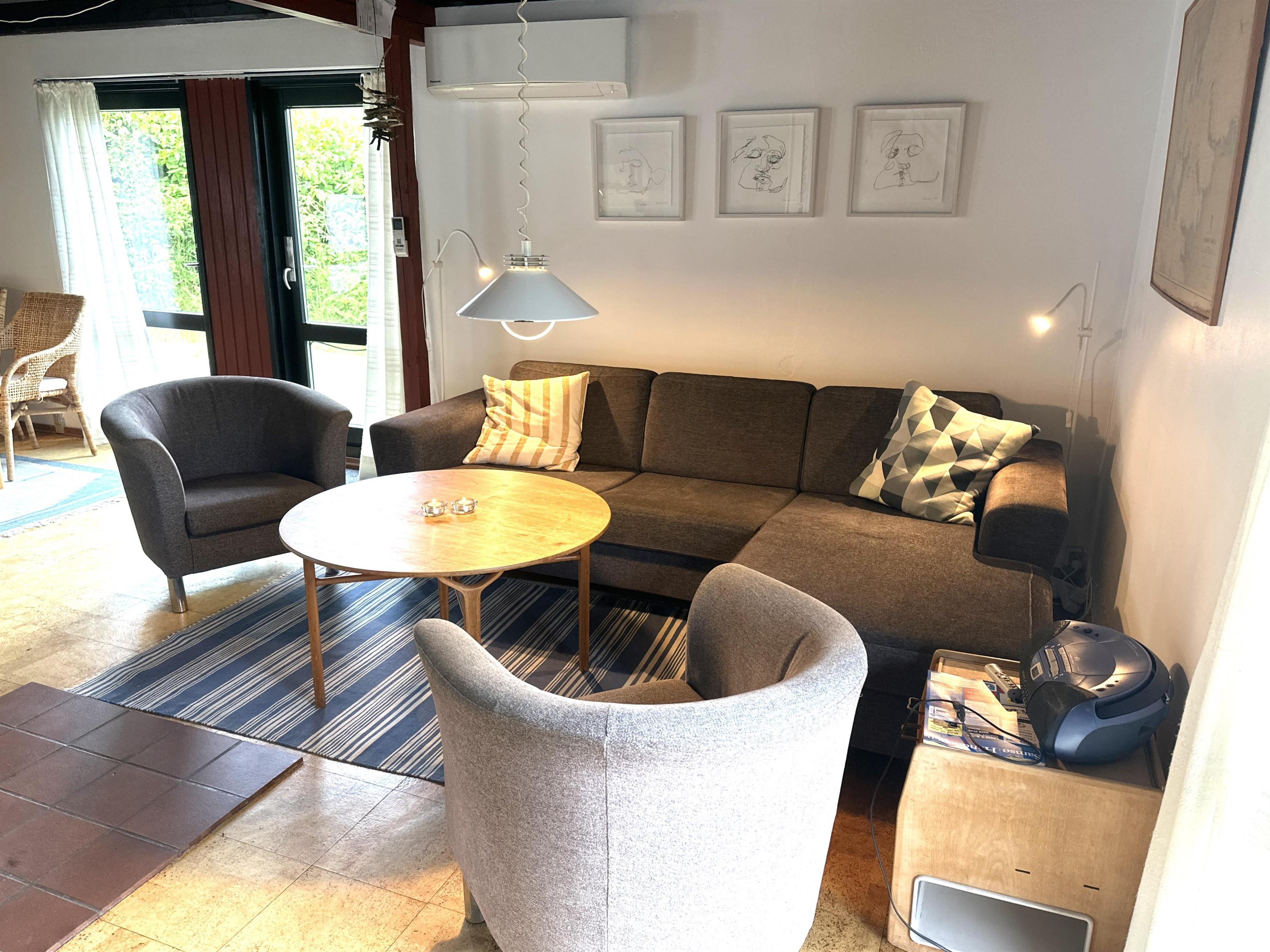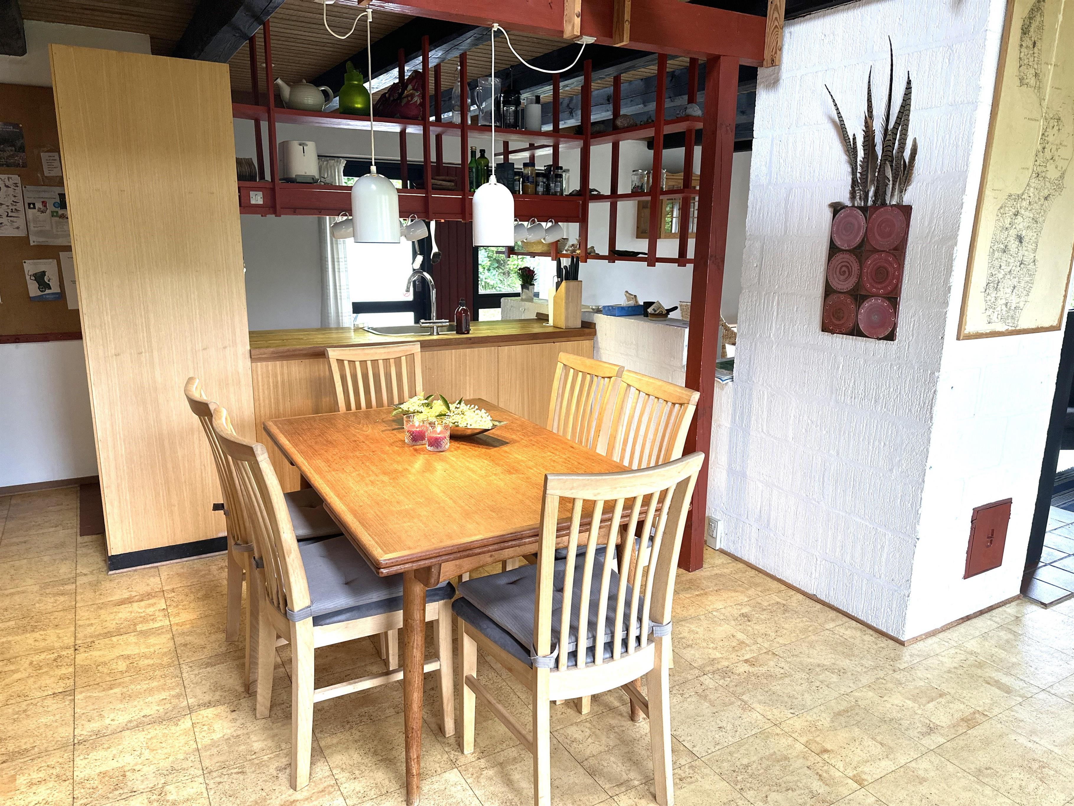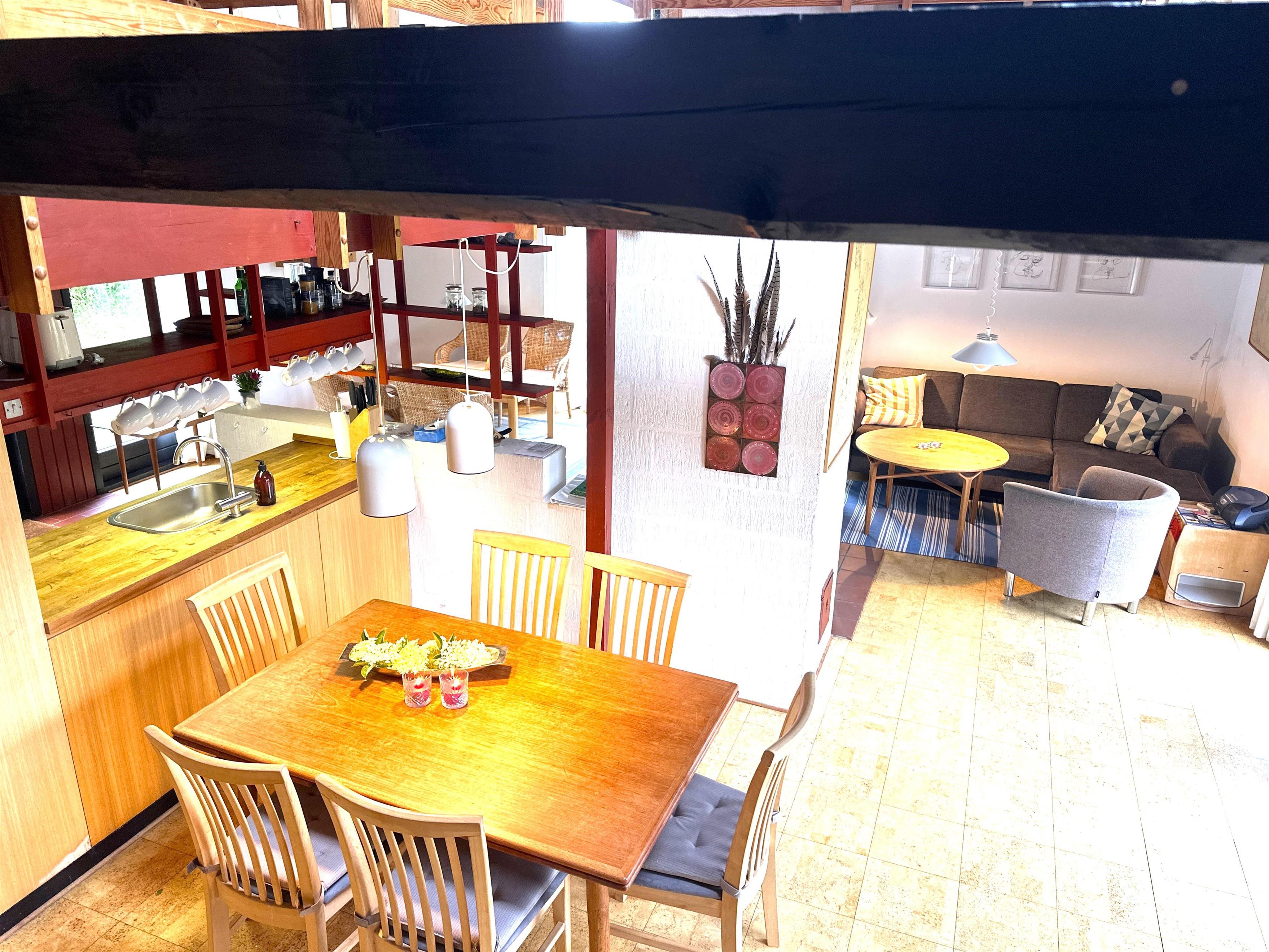 Sommerhuset er indrettet med hyggelige detaljer som synlige loftsbjælker, retroinspirerede elementer og en varm atmosfære, der straks får dig til at føle dig hjemme. I stueetagen finder du et stort, åbent køkken-alrum med god spiseplads og en indbydende sofakrog ved brændeovnen – det oplagte sted at samles efter dagens udflugter.