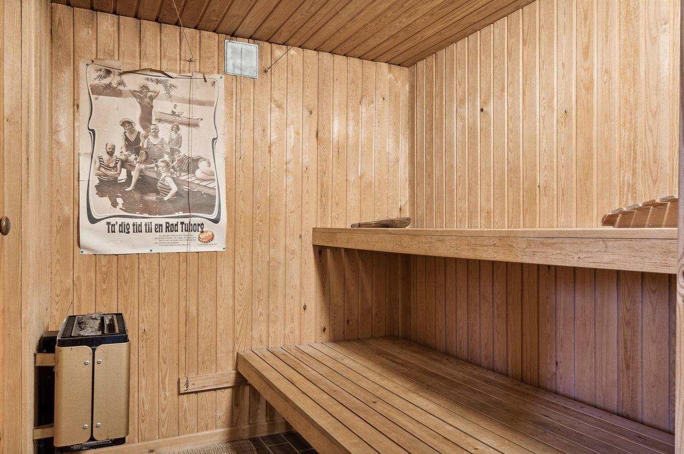 Der er 2 badeværelser med bruseniche og 1 toilet.. Badekar. I saunaen er der mulighed for afslapning.