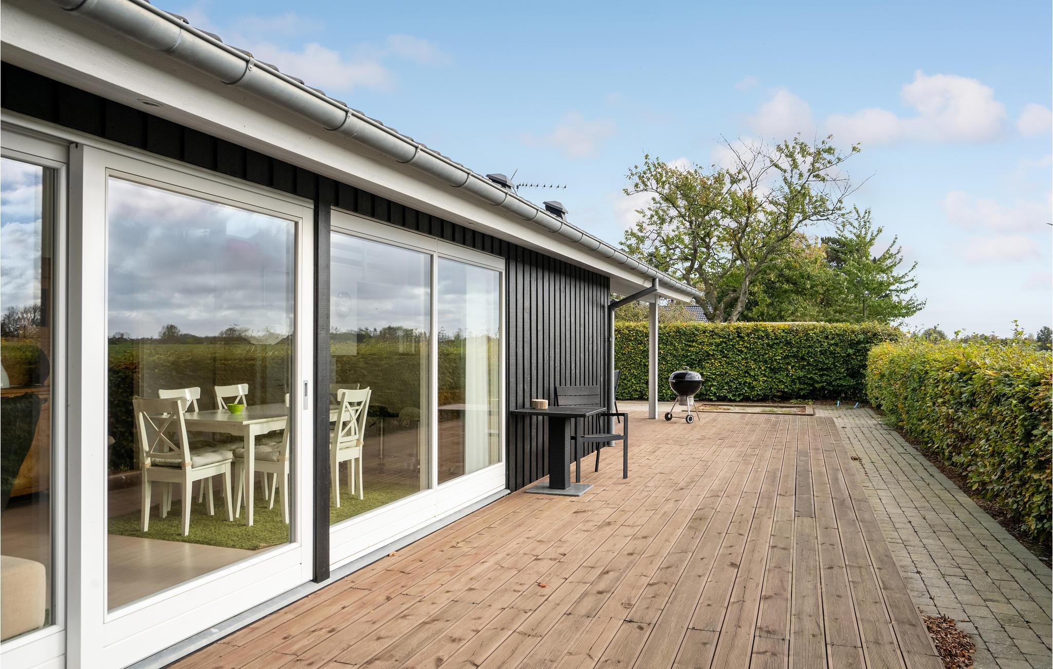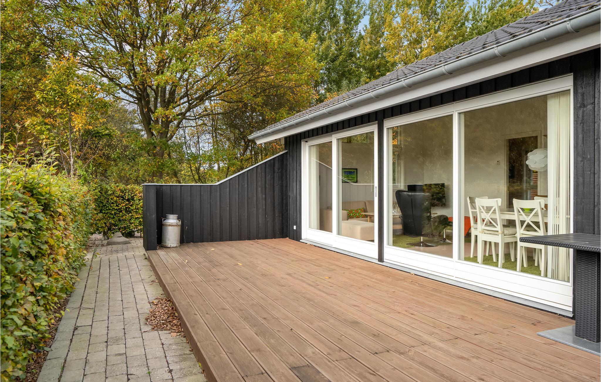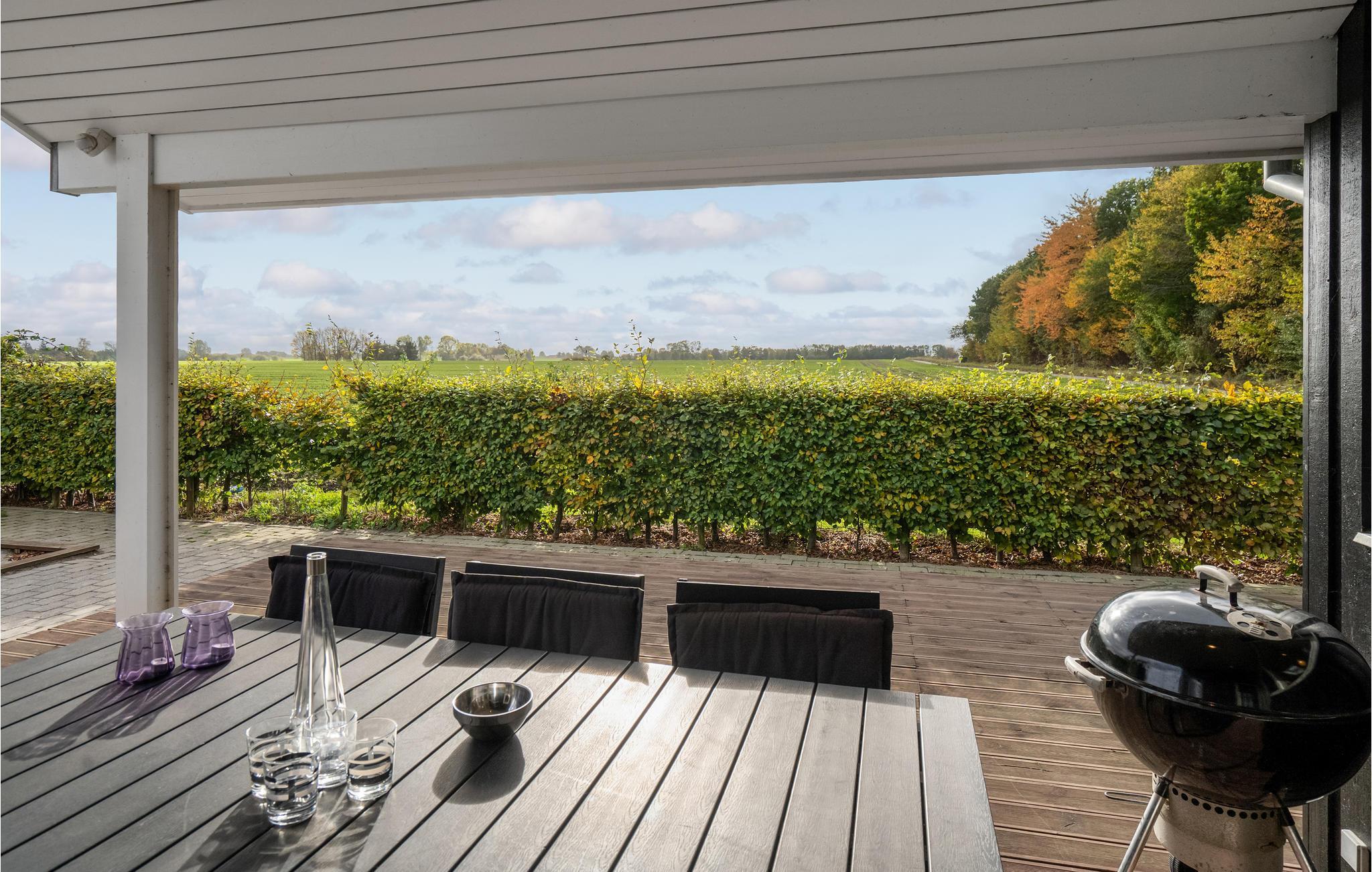Familievenligt træhus med stor terrasse, tæt på stranden og legeplads ved Jørgensø Strand på Nordfyn.