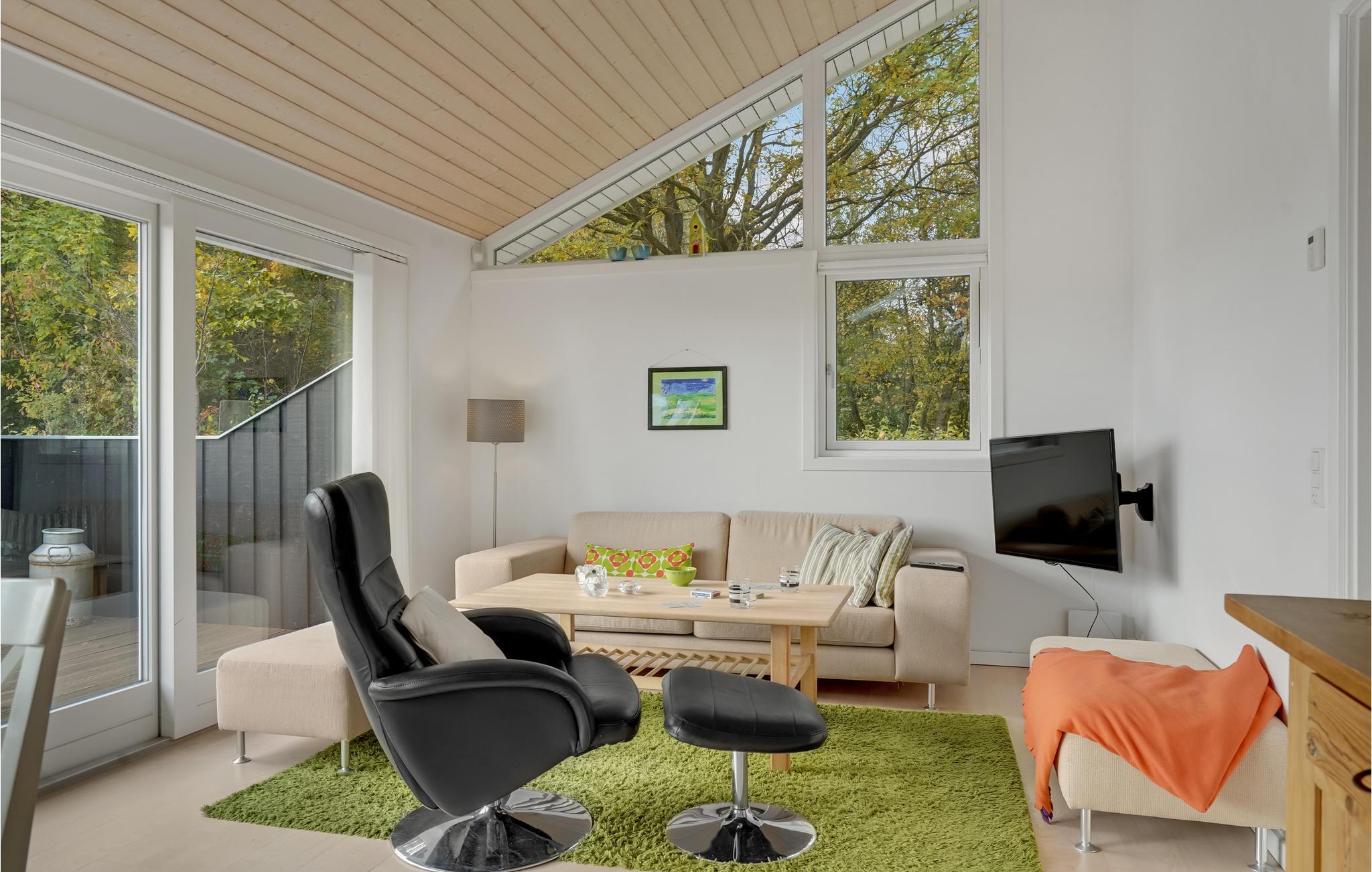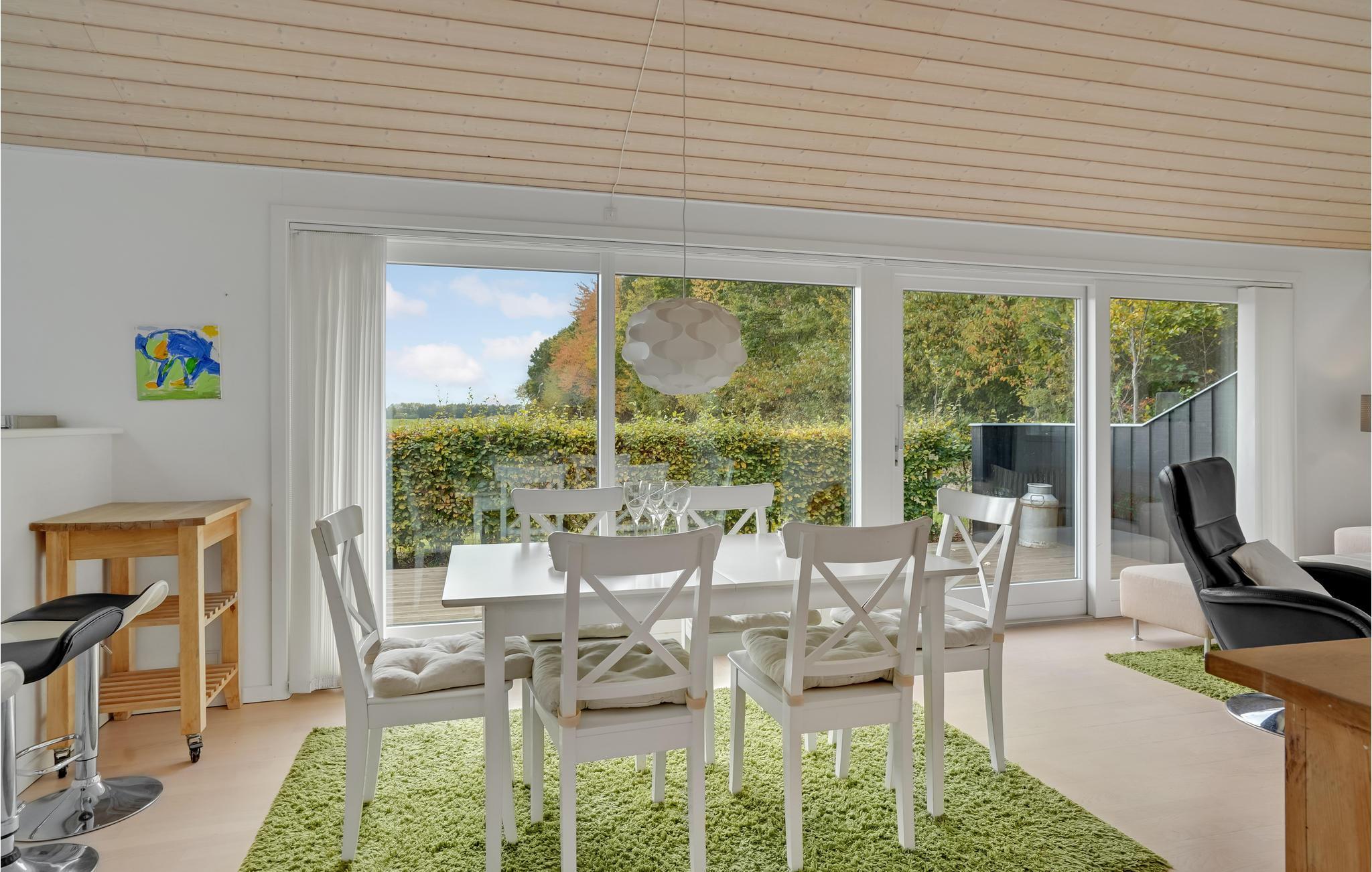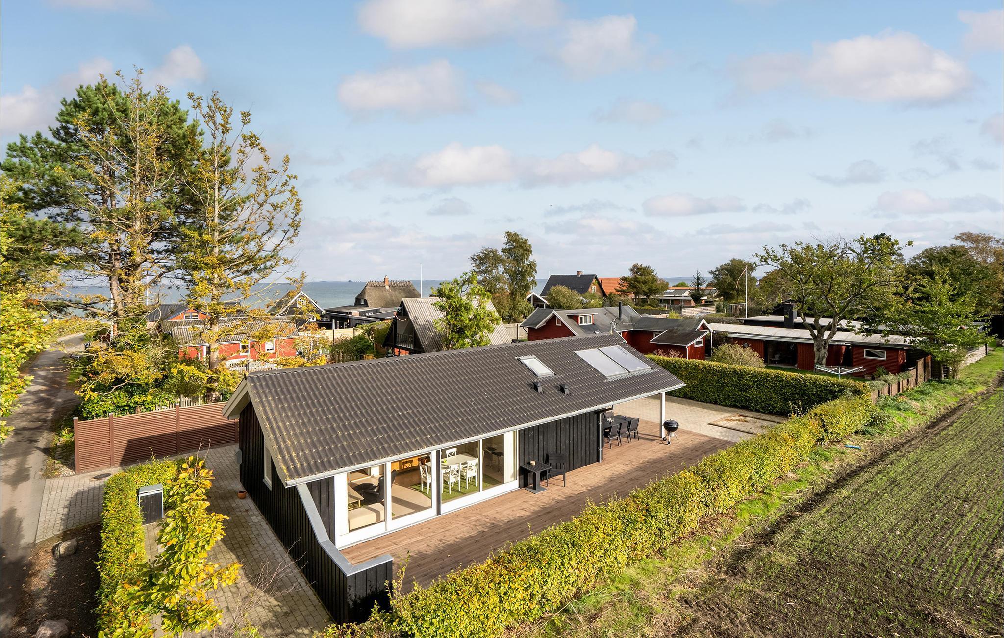 Familievenligt træhus med stor terrasse, tæt på stranden og legeplads ved Jørgensø Strand på Nordfyn.