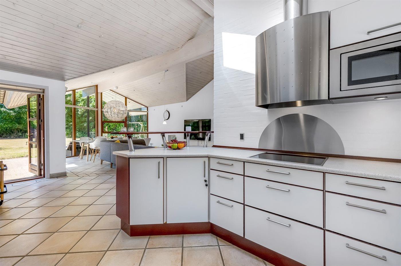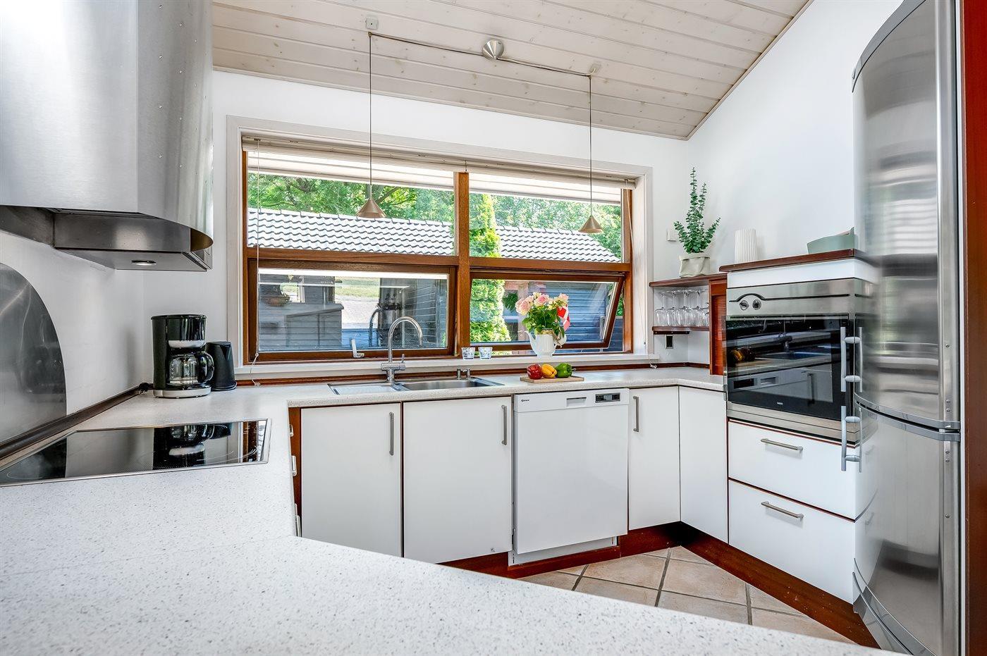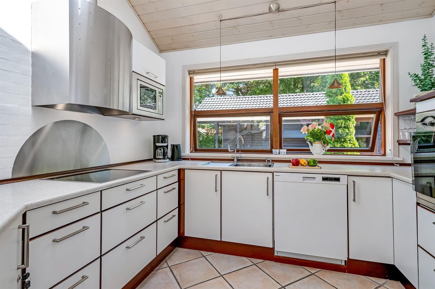 Køkkenet er udstyret med 1 køleskab. Der er 4 keramiske kogeplader, varmluftovn, mikrobølgeovn samt opvaskemaskine.
