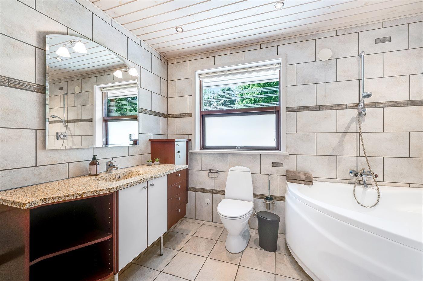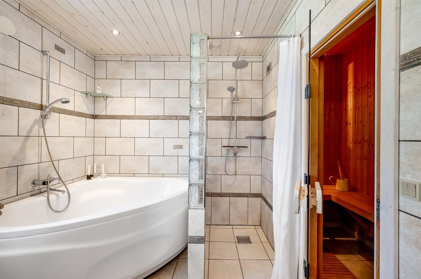 Der er 2 badeværelser med bruseniche og 2 toiletter. Der er gulvvarme på 2 badeværelser. I saunaen er der mulighed for afslapning.