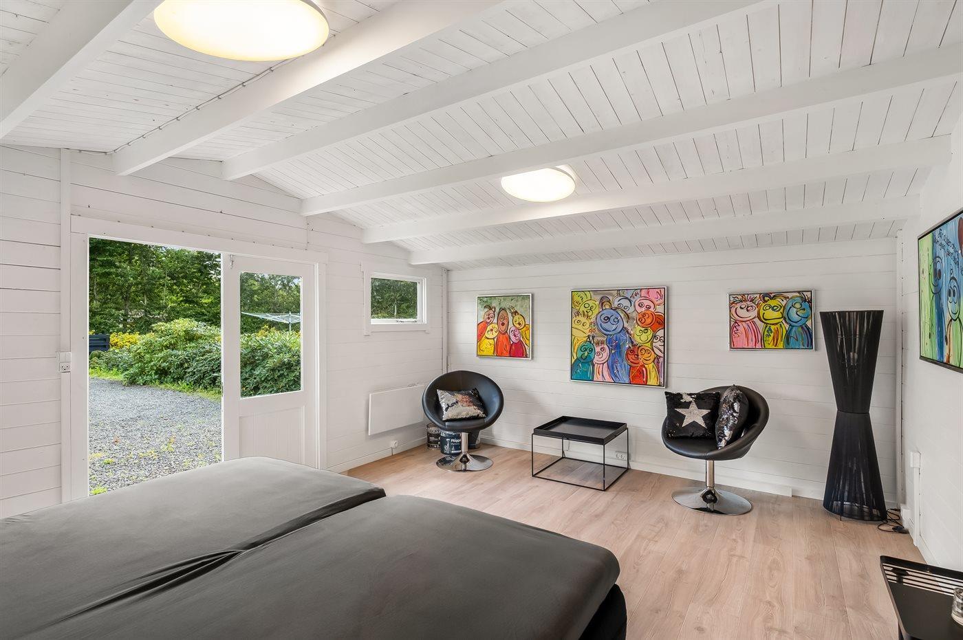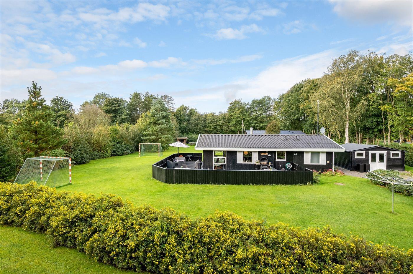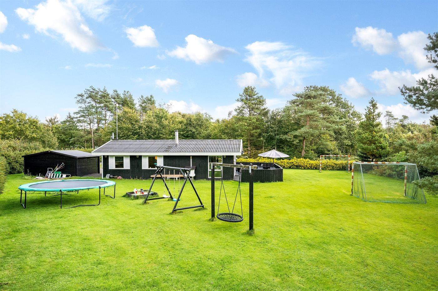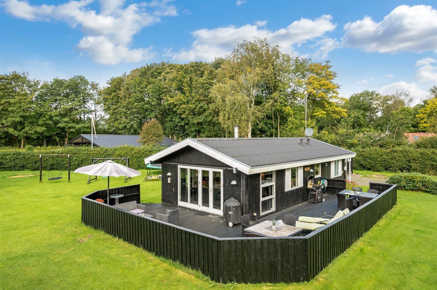 Her oser det af feriestemning både inde og ude med terrasser rundt om huset, shelter, trampolin, sansegynge osv.