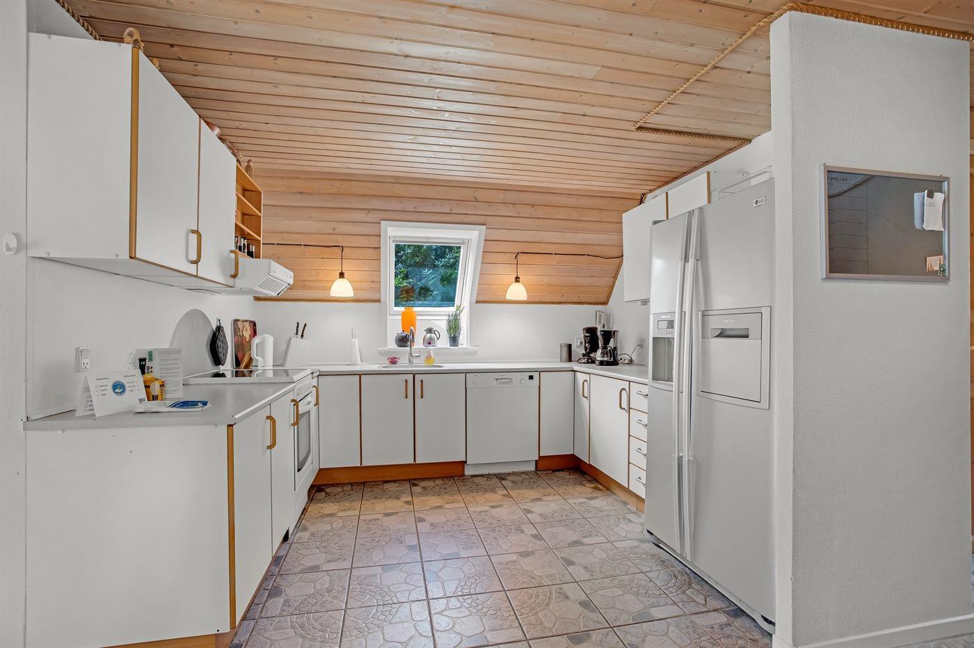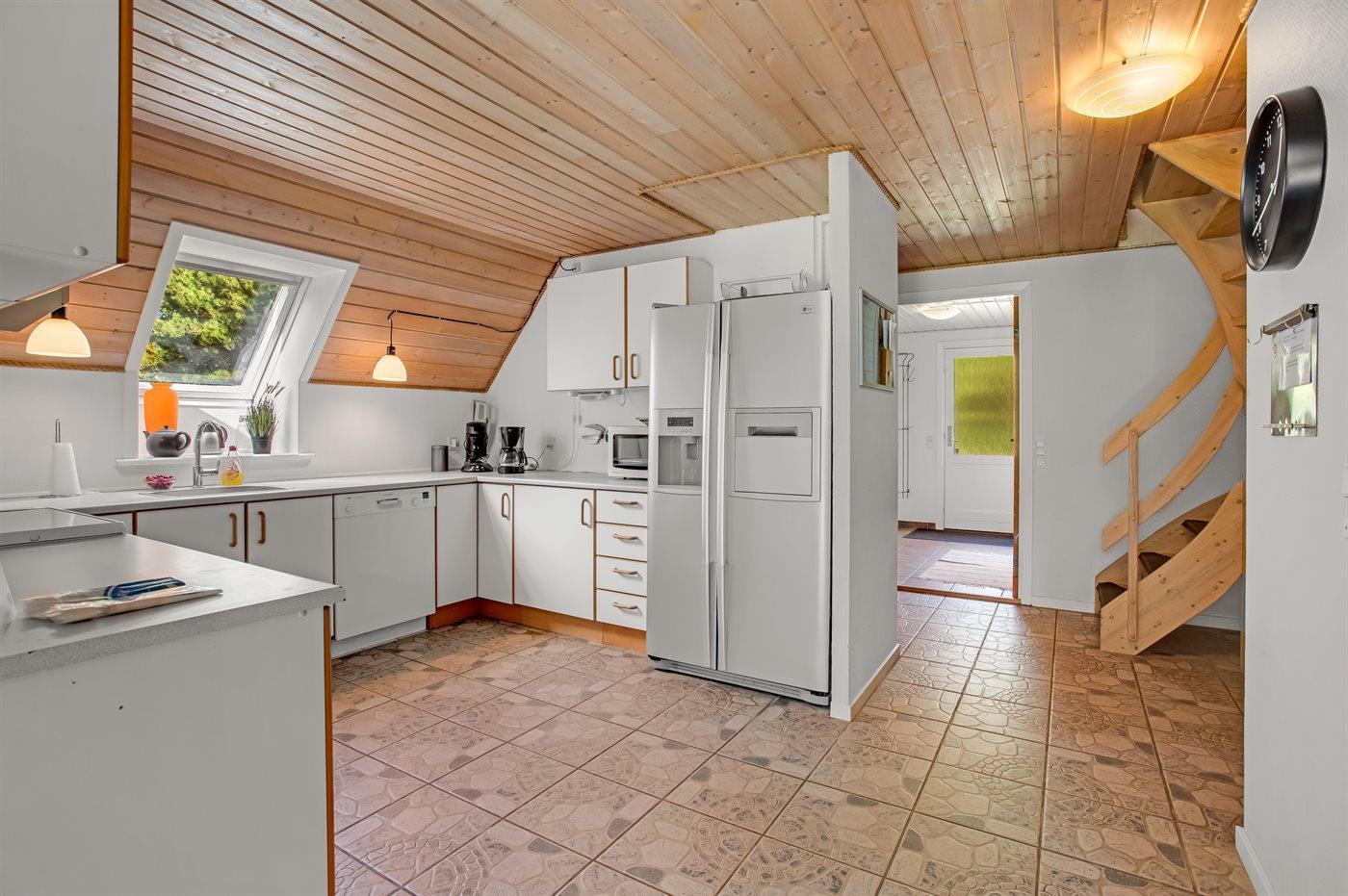 Køkkenet er udstyret med 1 amerikansk køleskab. Der er 4 keramiske kogeplader, varmluftovn, mikrobølgeovn, Airfryer samt opvaskemaskine Der er gulvvarme i køkkenet.