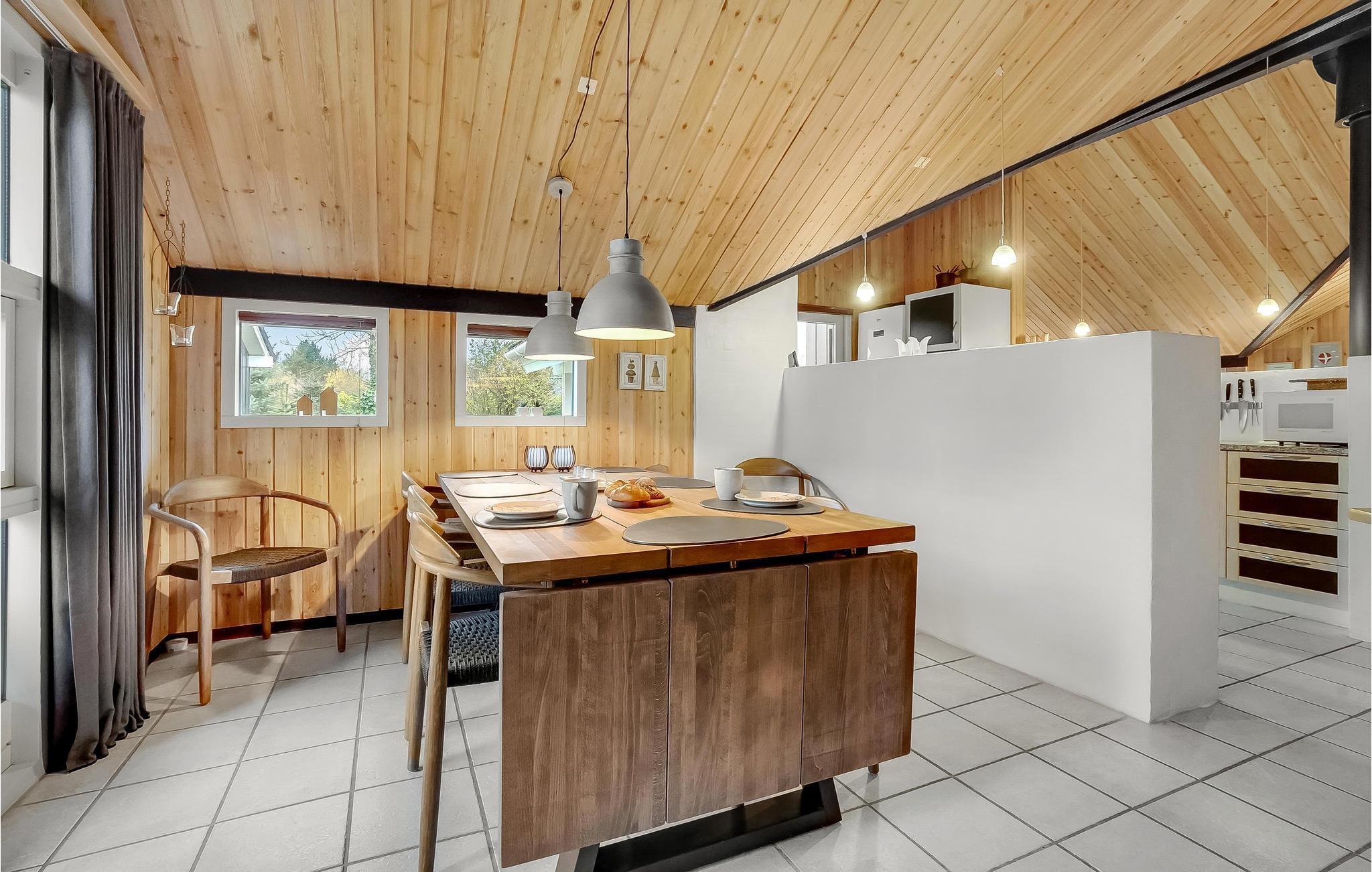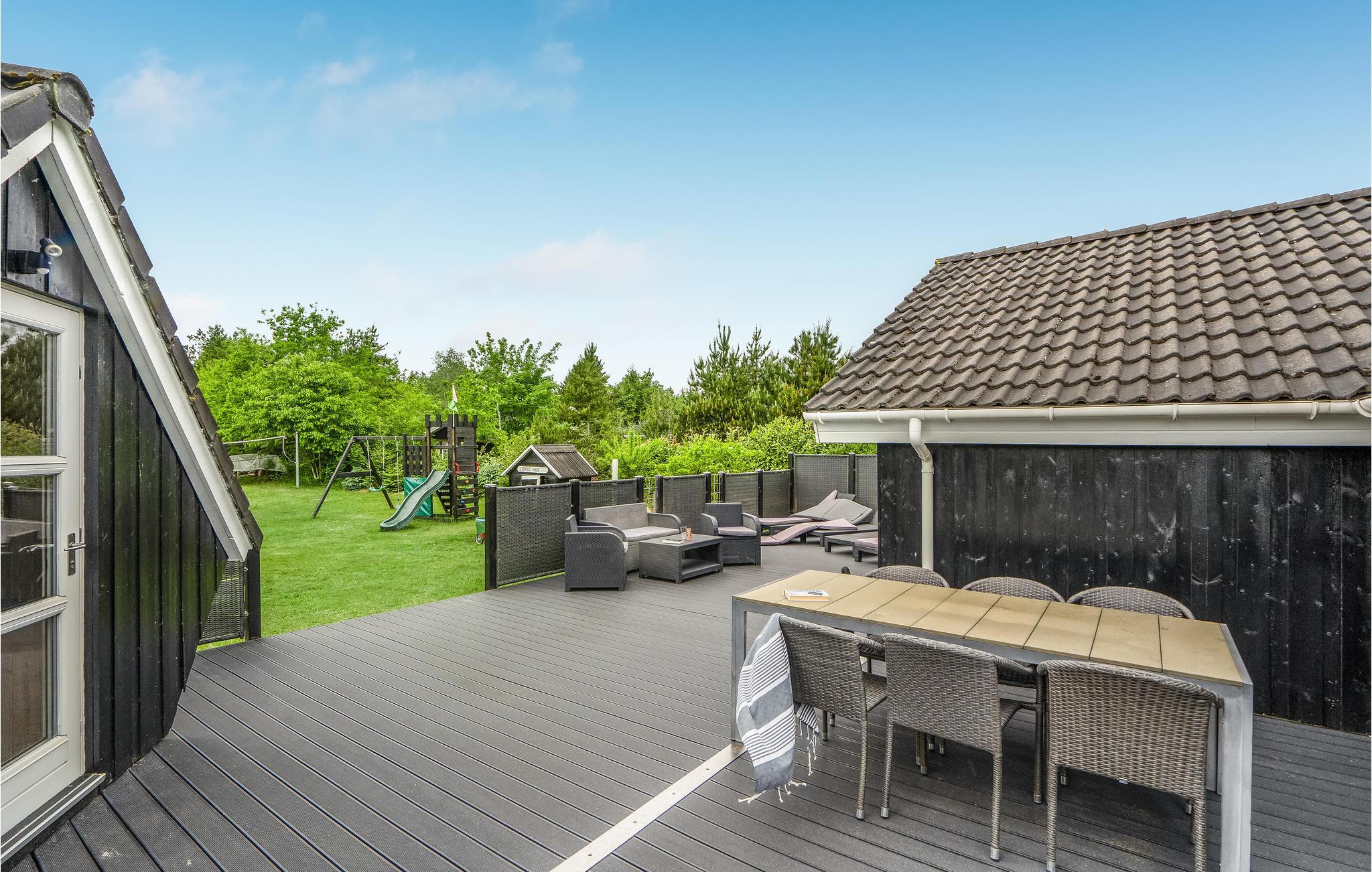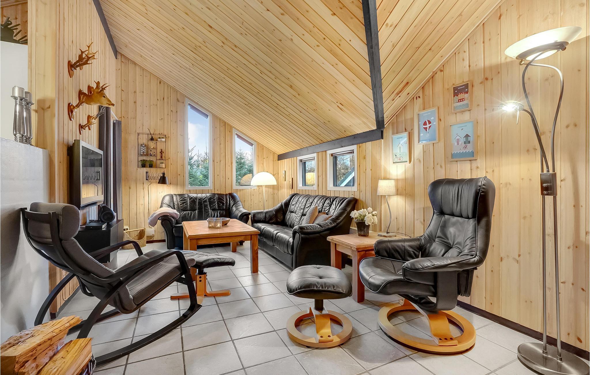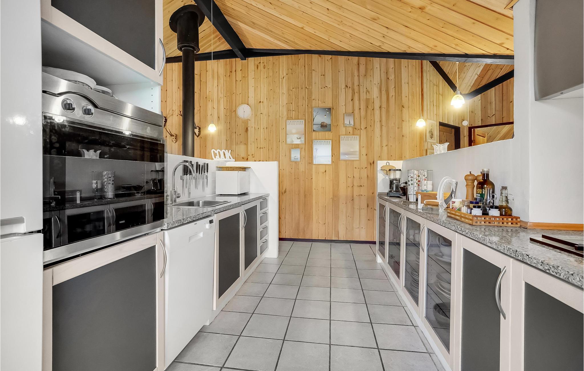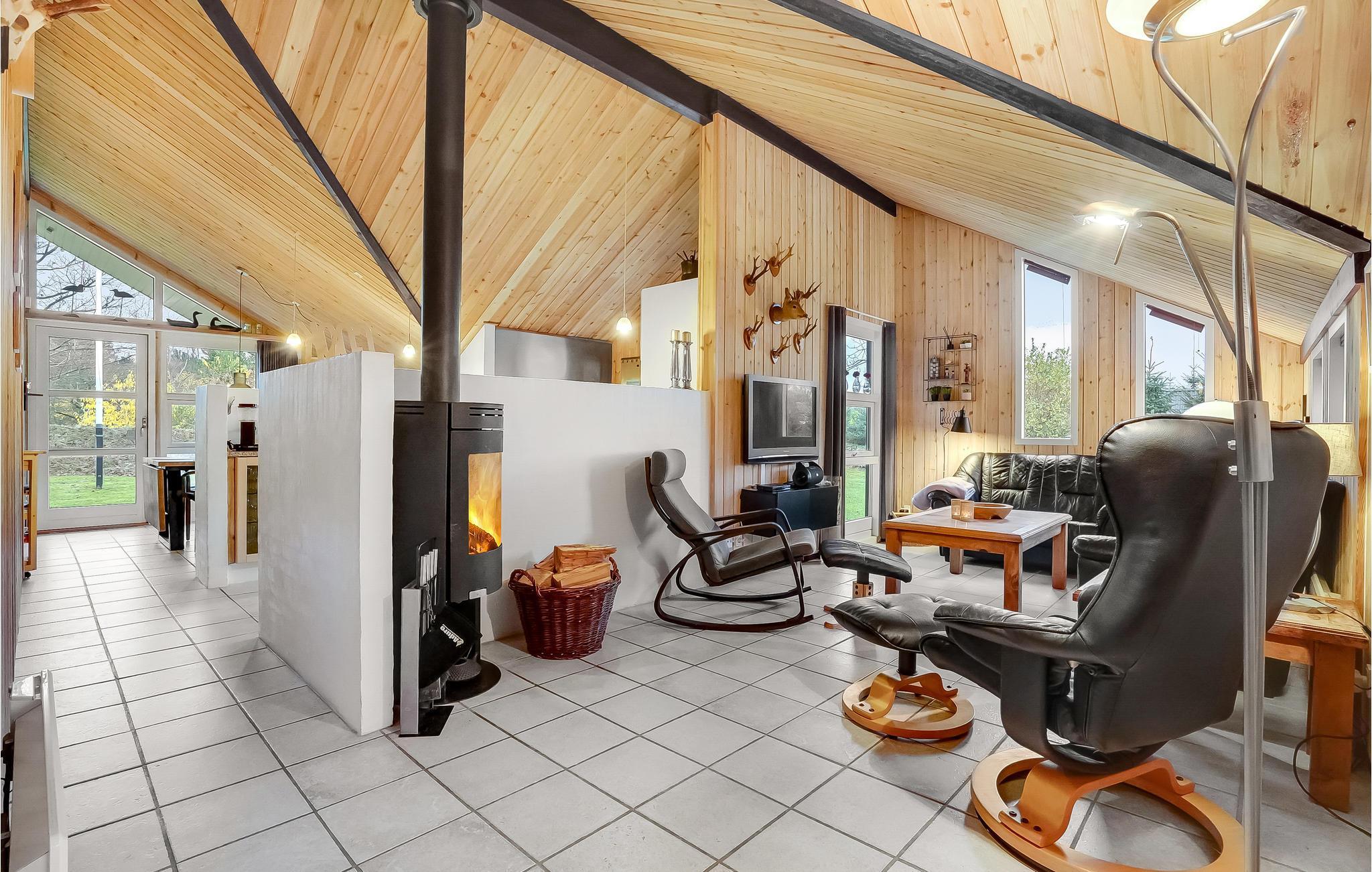Rigtig hyggeligt og vedligeholdt feriehus med en meget personlig indretning. I det rummelige køkken/alrum med samtalekøkken findes alt i hårde hvidevarer samt en hyggeskabende brændeovn. Det store badeværelse er udstyret med spabad og har adgang til saunaen. Omkring feriehuset er der opført flere gode, læfulde og delvis overdækkede terrasser med komfortable havemøbler. Der er gåafstand til et større aktivitetscenter med indkøbsmuligheder, restaurant, klappevenlige dyr (geder), fælles legeplads samt et spilleland med airhockey, bordtennis og bordfodbold (mod betaling).
