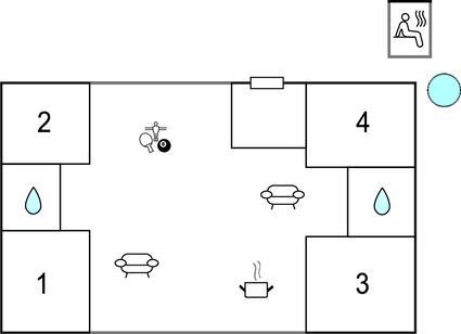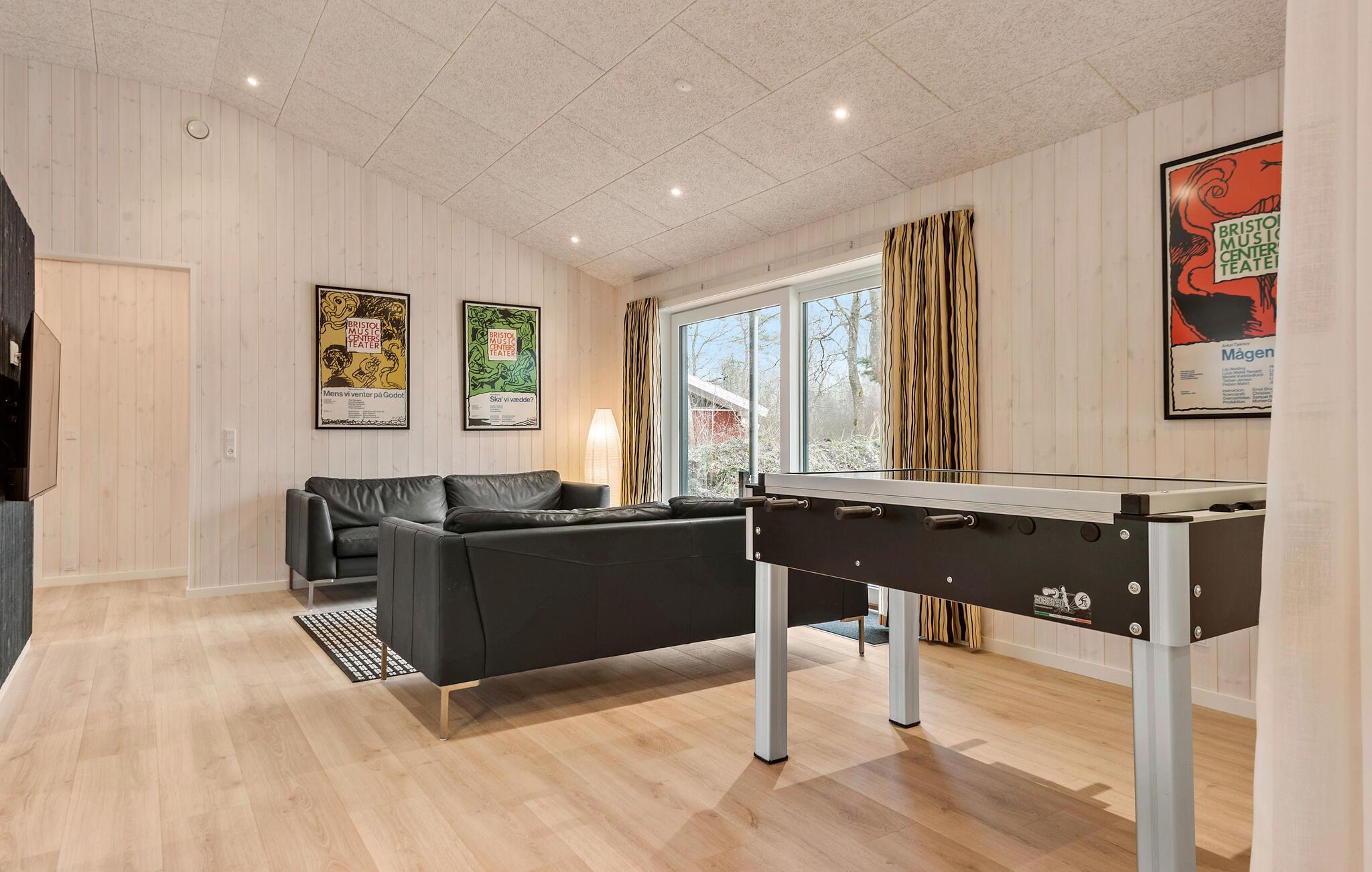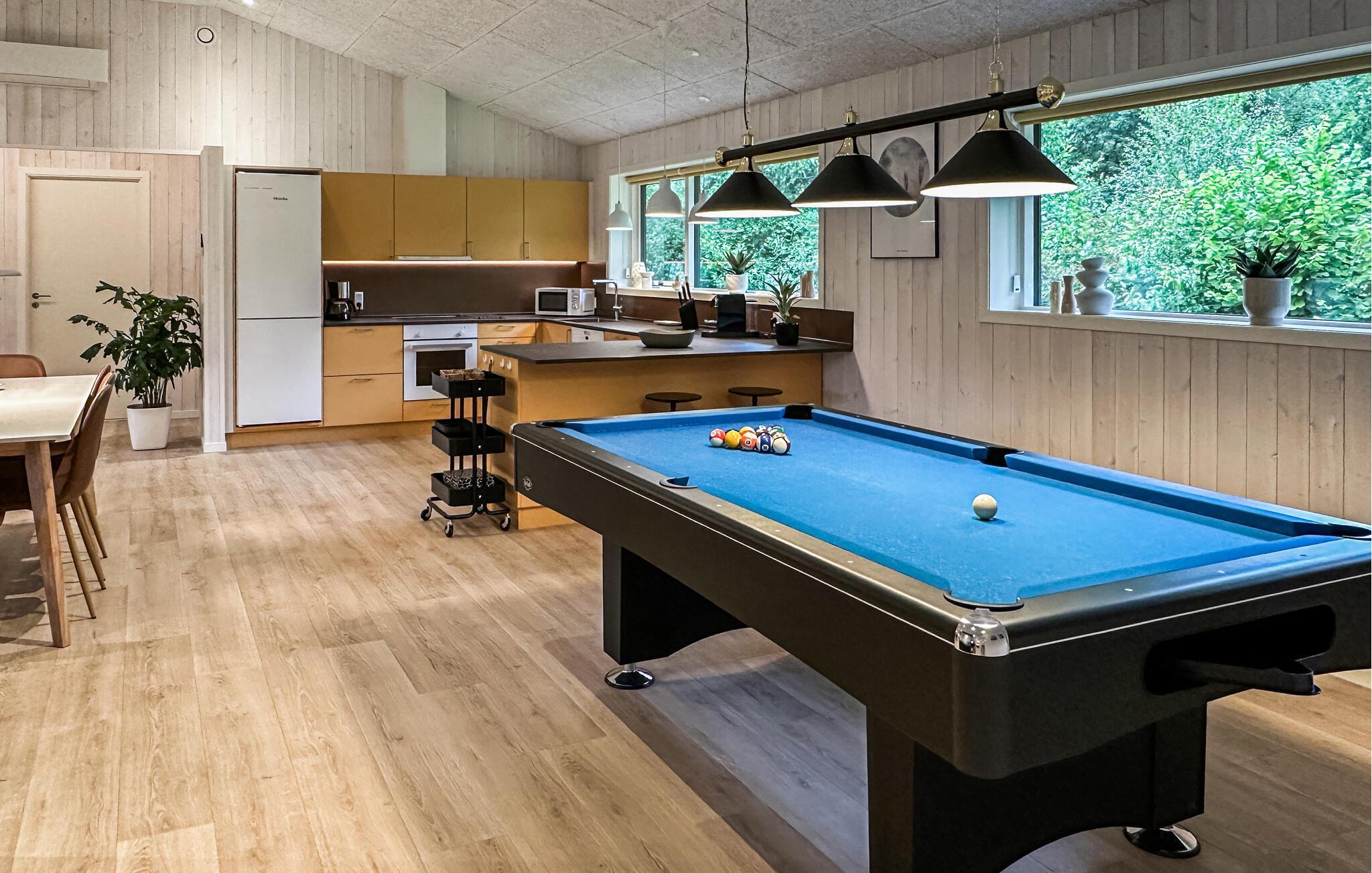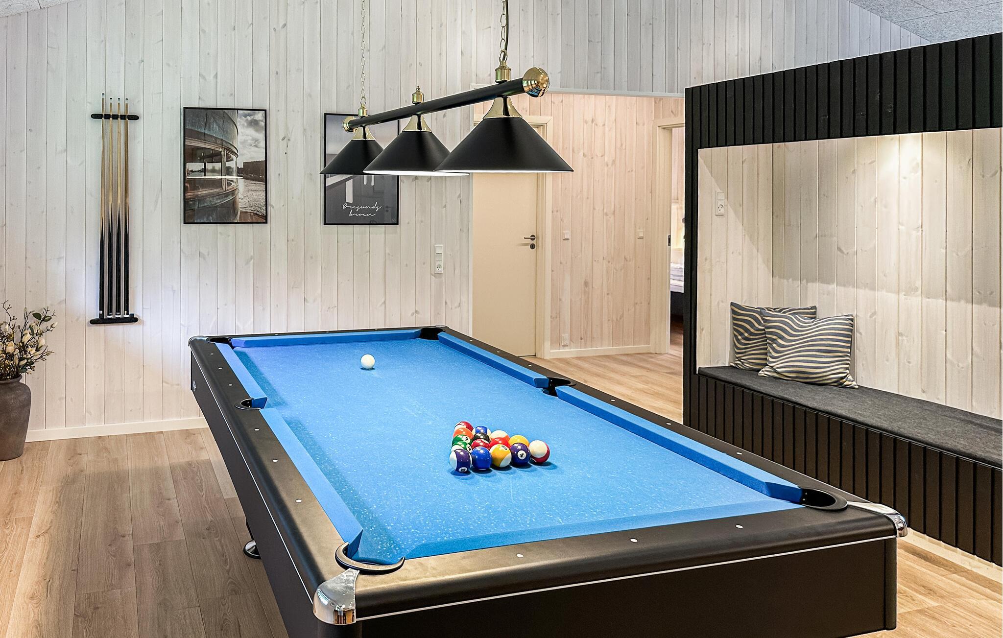 Velkommen til dette rummelige og lækre hus, der er en helt fantastisk base for en aktiv ferie med familien. Soveværelserne ligger i hvert sit hjørne af huset og giver gode muligheder for lidt privatliv, inden I mødes i den store stue til mange hyggelige stunder i godt selskab. Køkkenet er stort og veludstyret, så her kan amatørkokkene kræse om livretterne, mens andre udfordrer hinanden til et slag pool eller bordfodbold, inden I dækker op til den store middag ved spisebordet. Rund aftenen af med brætspil eller en god film i sofaerne, mens I lægger planer for de kommende dage.